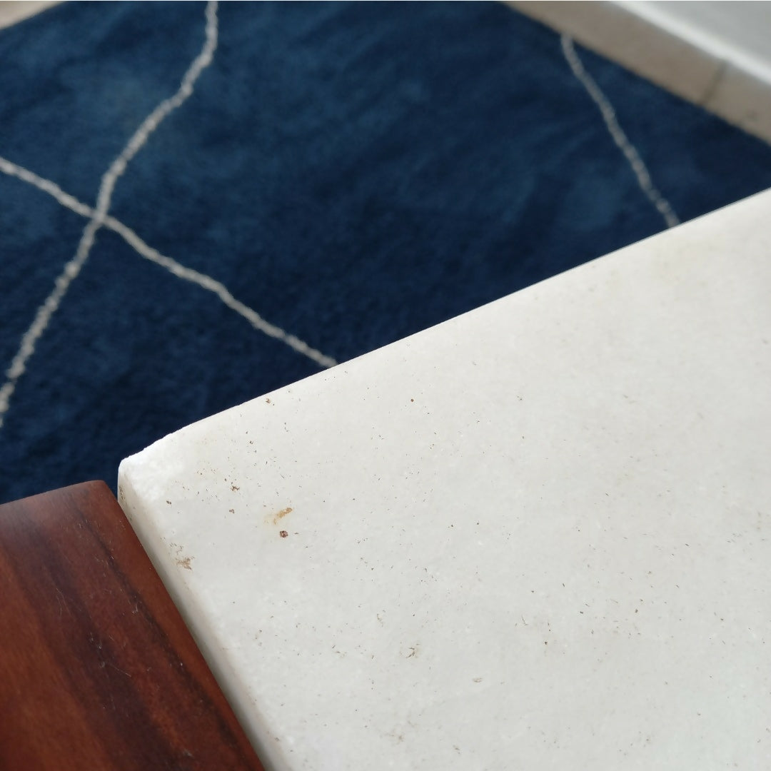 A mesa está em excelente estado, a madeira possui poucas marcas do tempo, o tampo de mármore tem uma pequena lasca na ponta, vide fotos para mais detalhes.