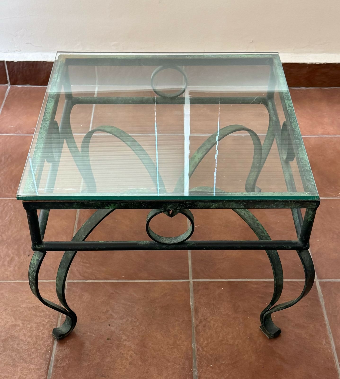 Mesa antiga de ferro com tampo de vidro