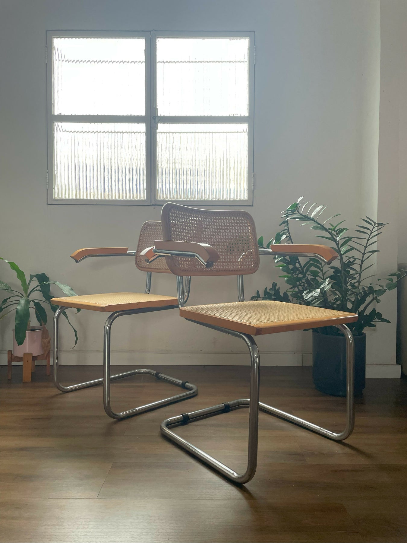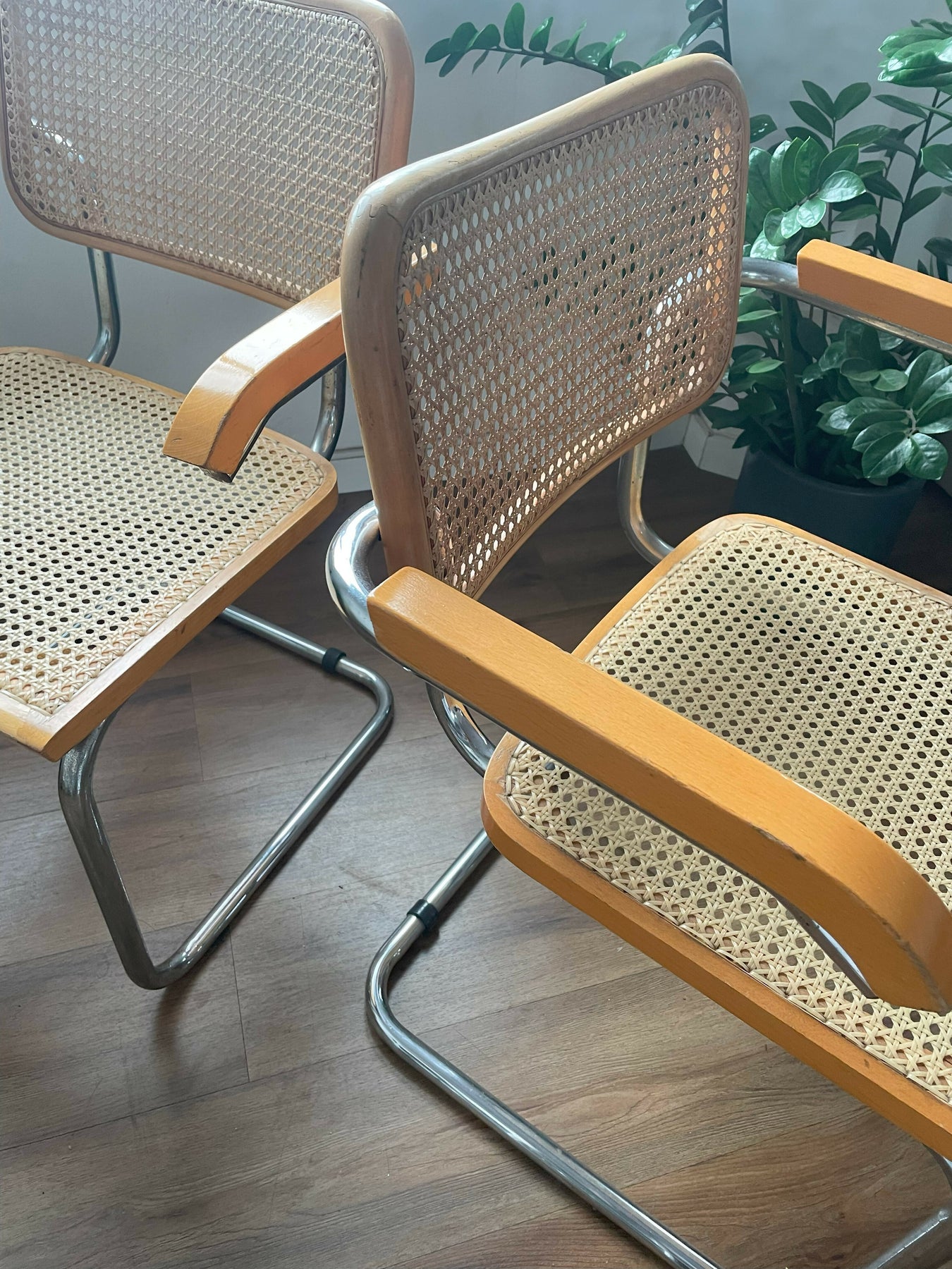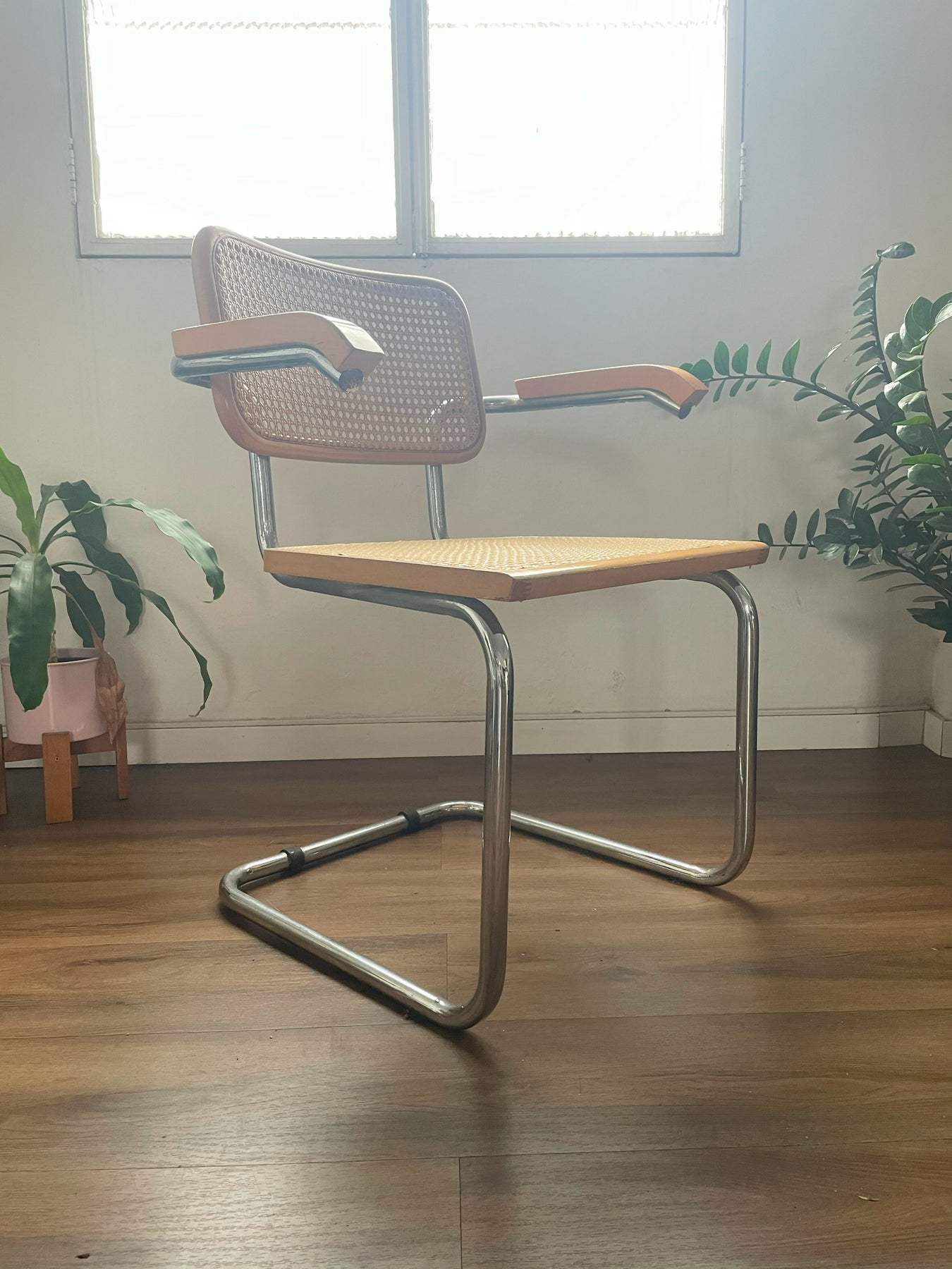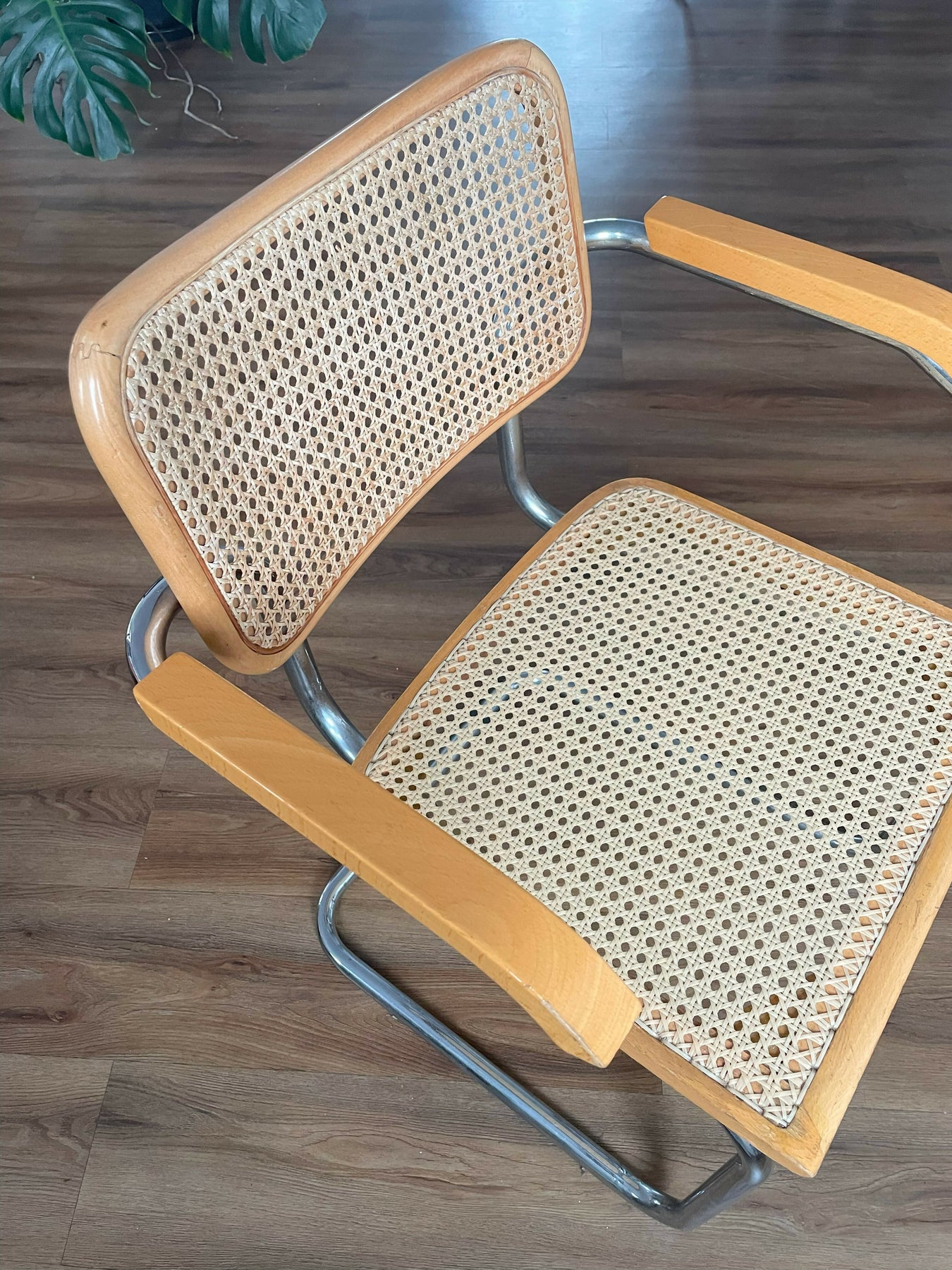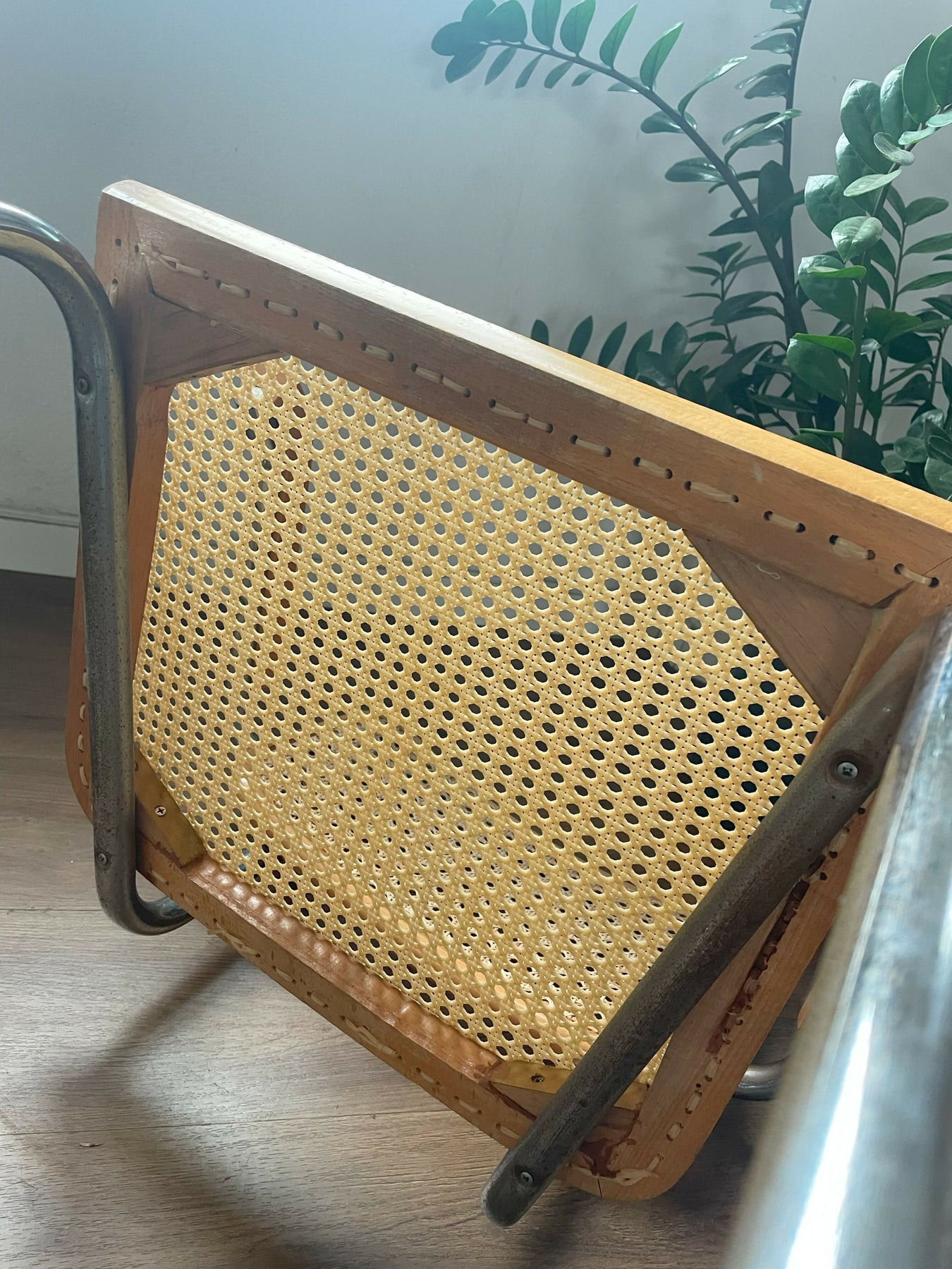 Cadeira Cesca vintage com madeira íntegra, aço com apenas alguma oxidação na parte inferior do assento, palha orgânica original no encosto e palha sintética substituída no assento. Possui 4 peças triangulares inseridas na parte inferior do assento para maior estabilidade do móvel. (Apenas uma unidade).