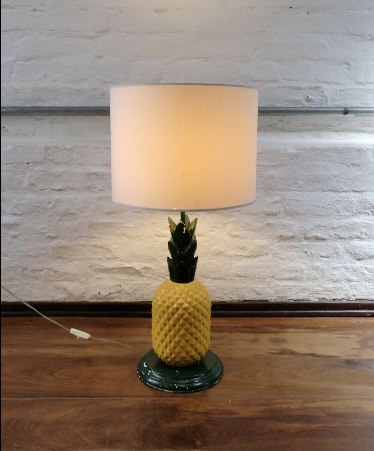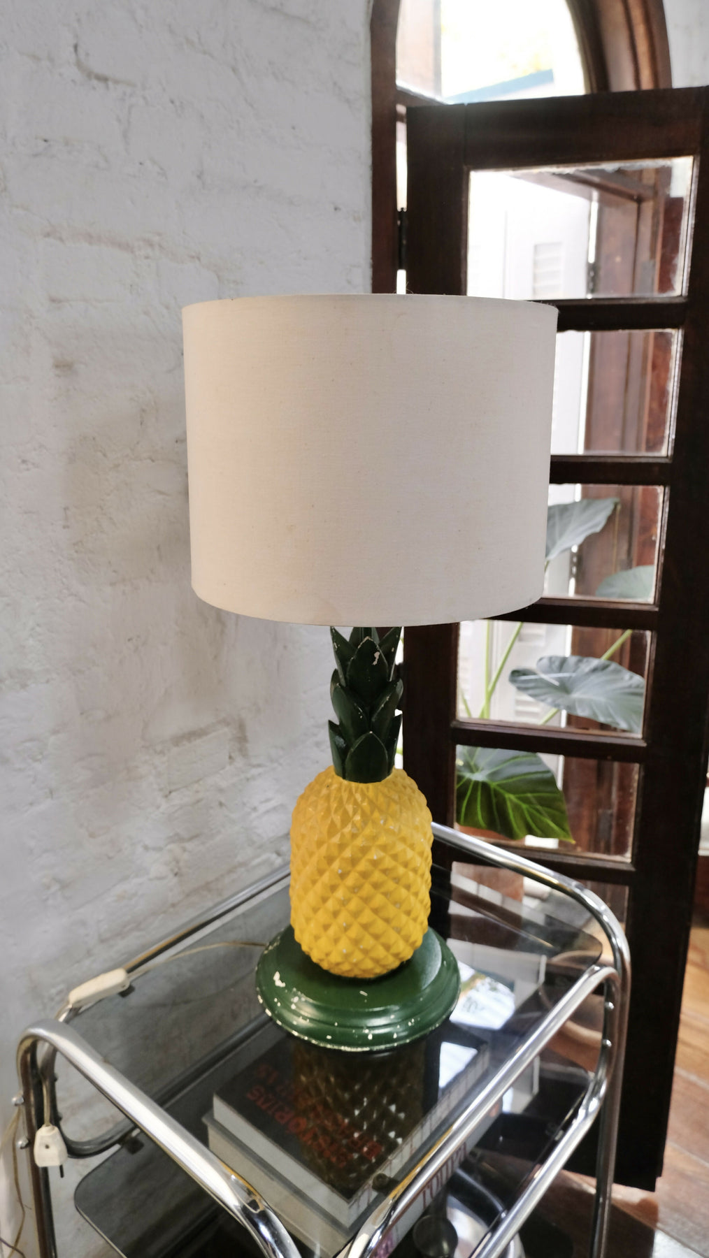 Luminária vintage abacaxi com base de madeira e cúpula de tecido. A peça está em bom estado, funcionando, porém possui um leve lascado na base conforme mostrado na primeira foto. Medidas 74cm altura, 25cm x 25cm Base abacaxi, 36cm x 36cm Cúpula