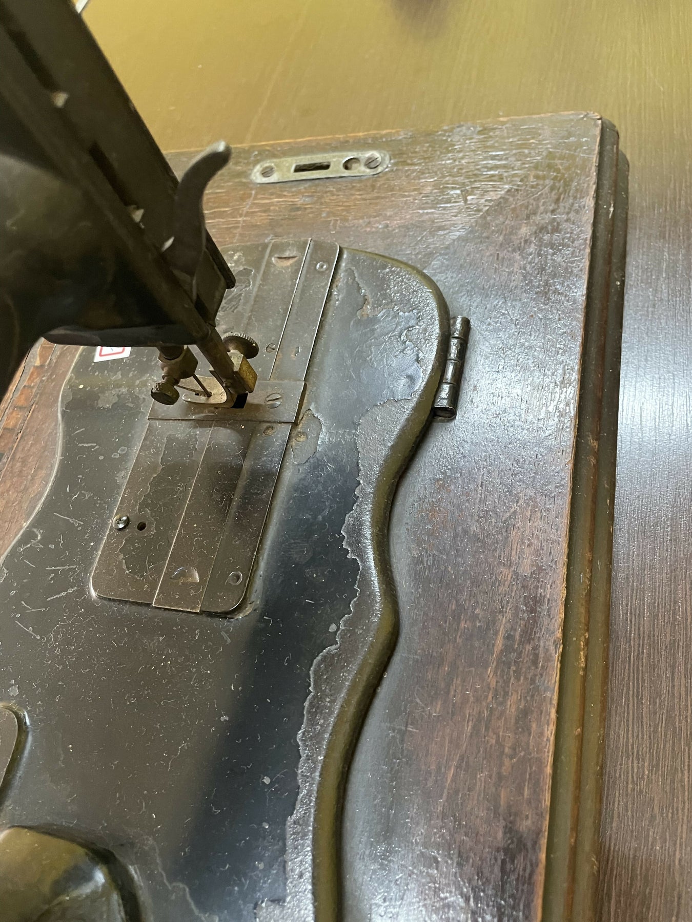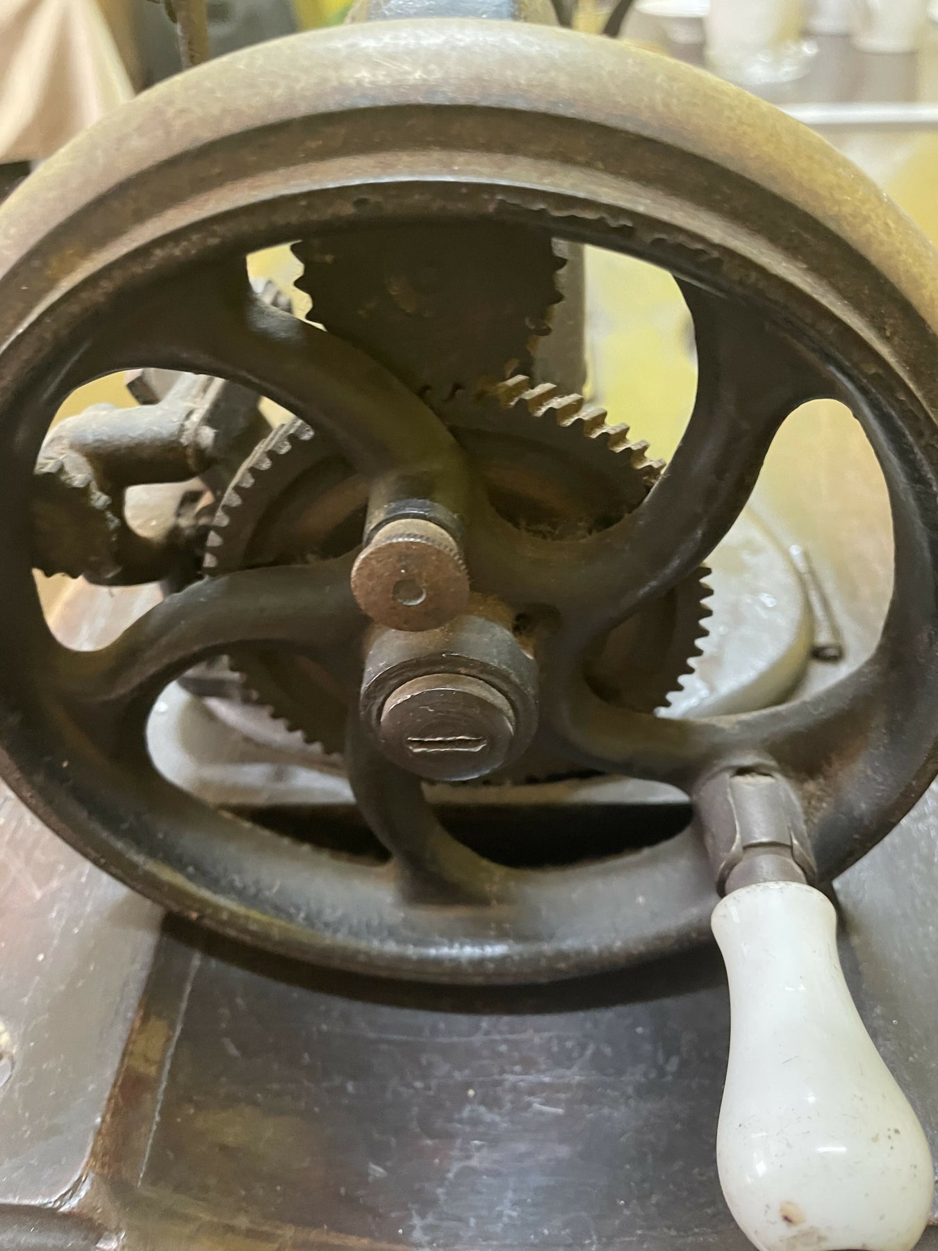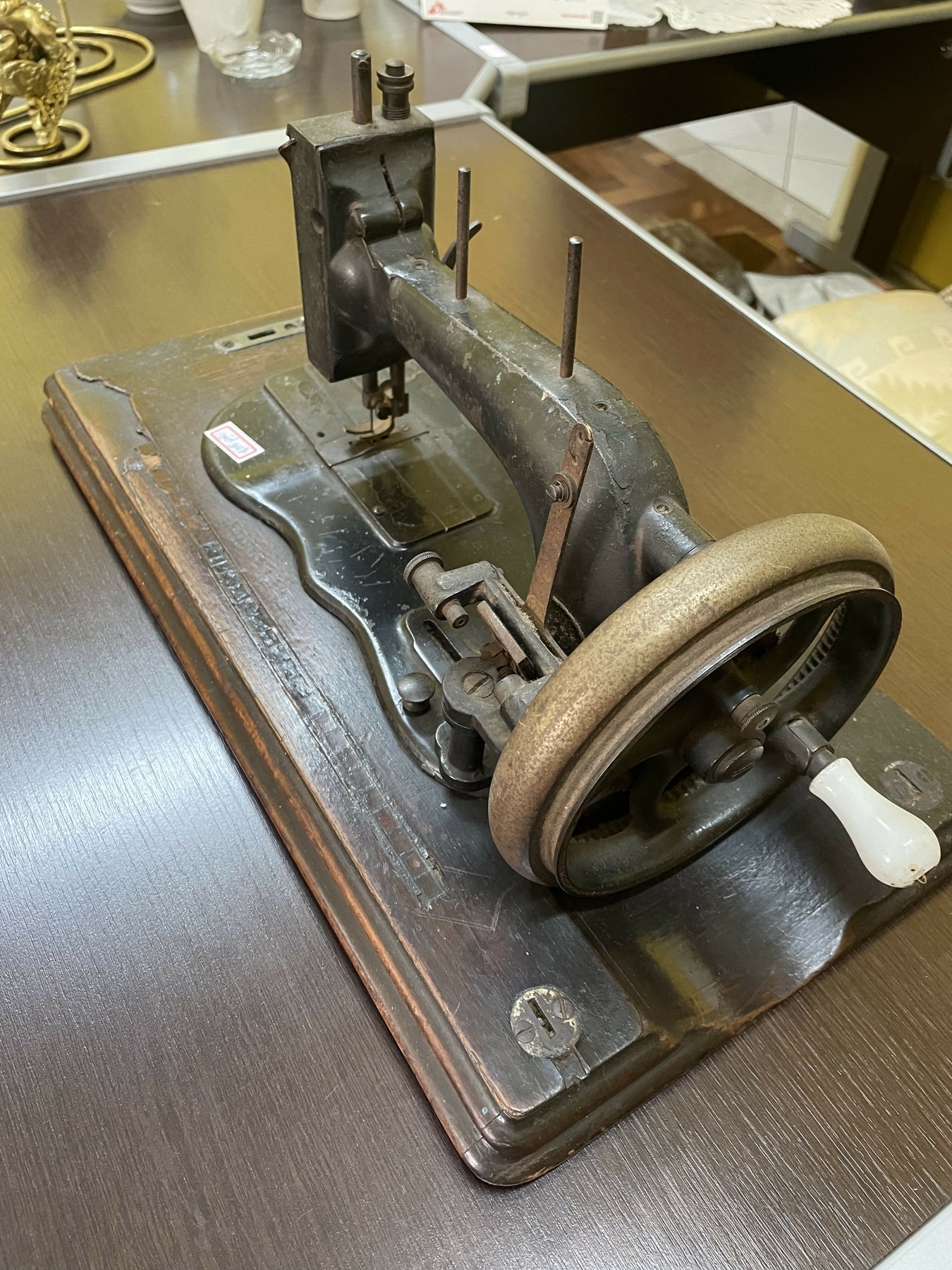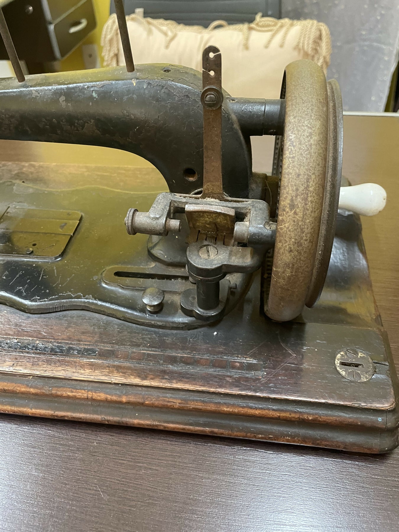 Máquina de costura antiga , com manivela, peça DECORATIVA , com marcas de tempo. Modelo antigo, possivelmente do final do século XIX ou início do século XX, devido ao seu design em ferro fundido e operação manual.