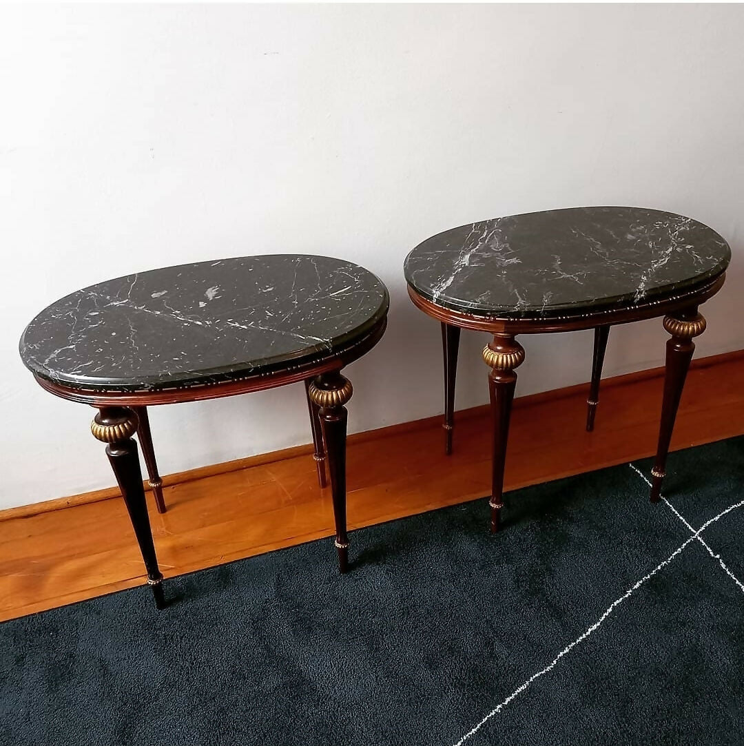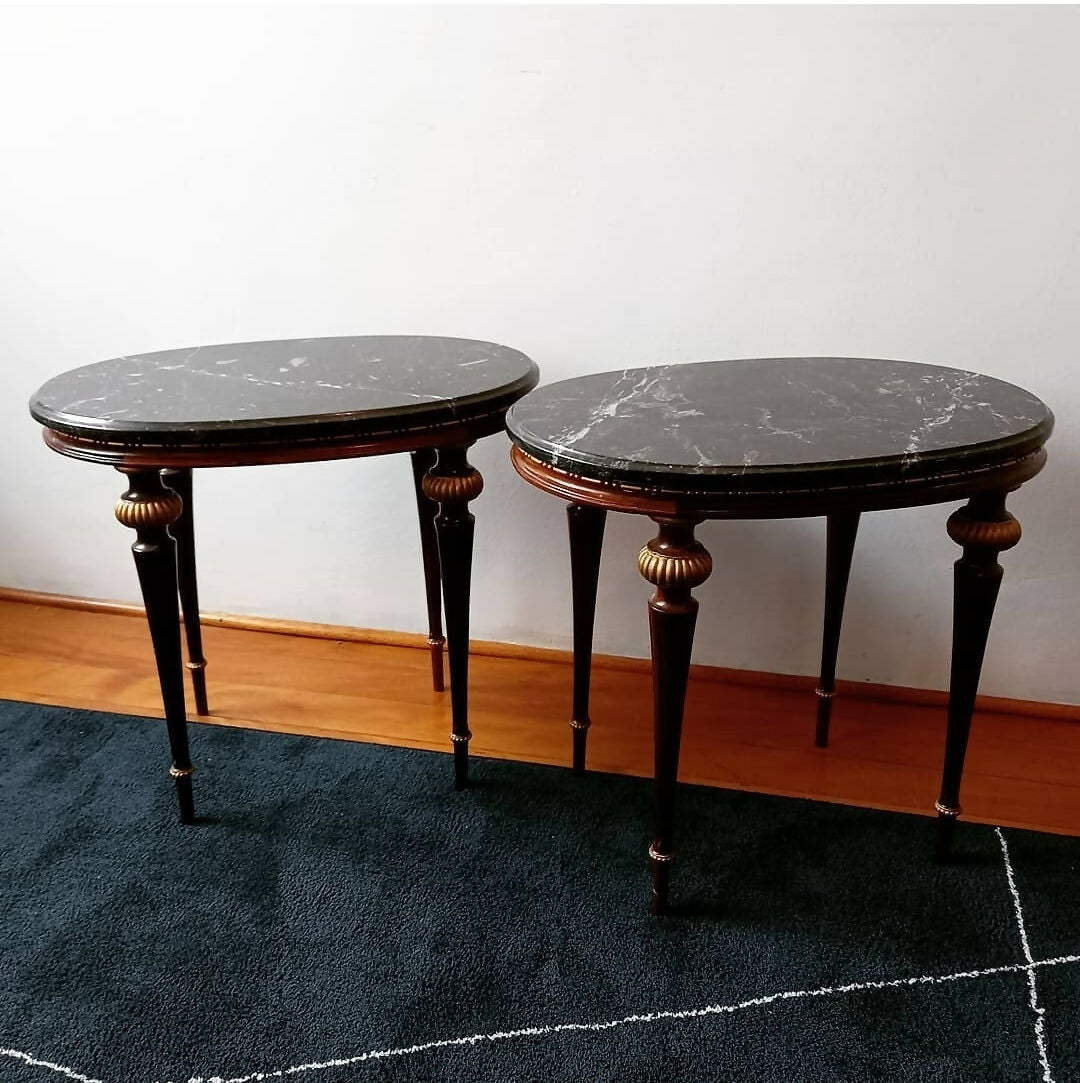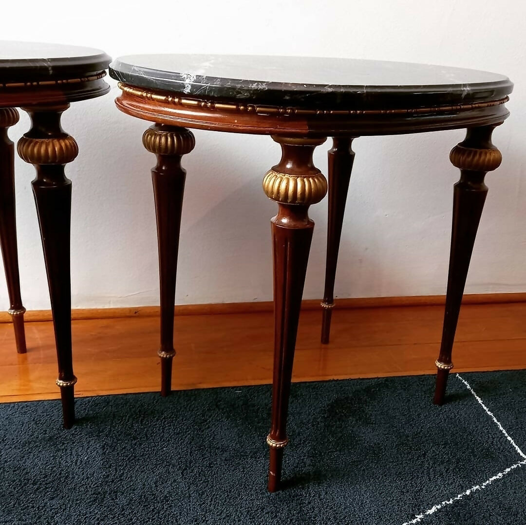 Par de mesas laterais francesas dos anos 50, madeira maciça com douração à ouro e tampo de mármore. Um dos tampos possui pequeno bicado na lateral, visível por baixo (vide fotos). Possuímos, também, a mesa de centro.