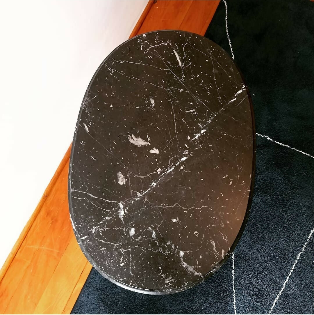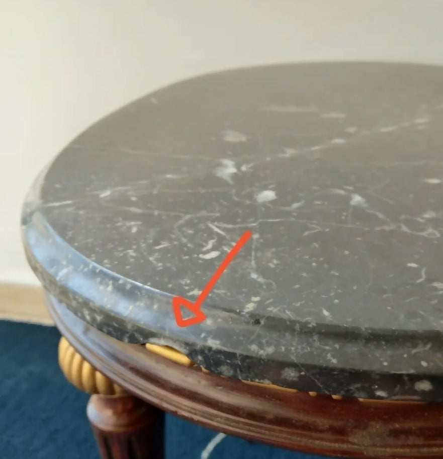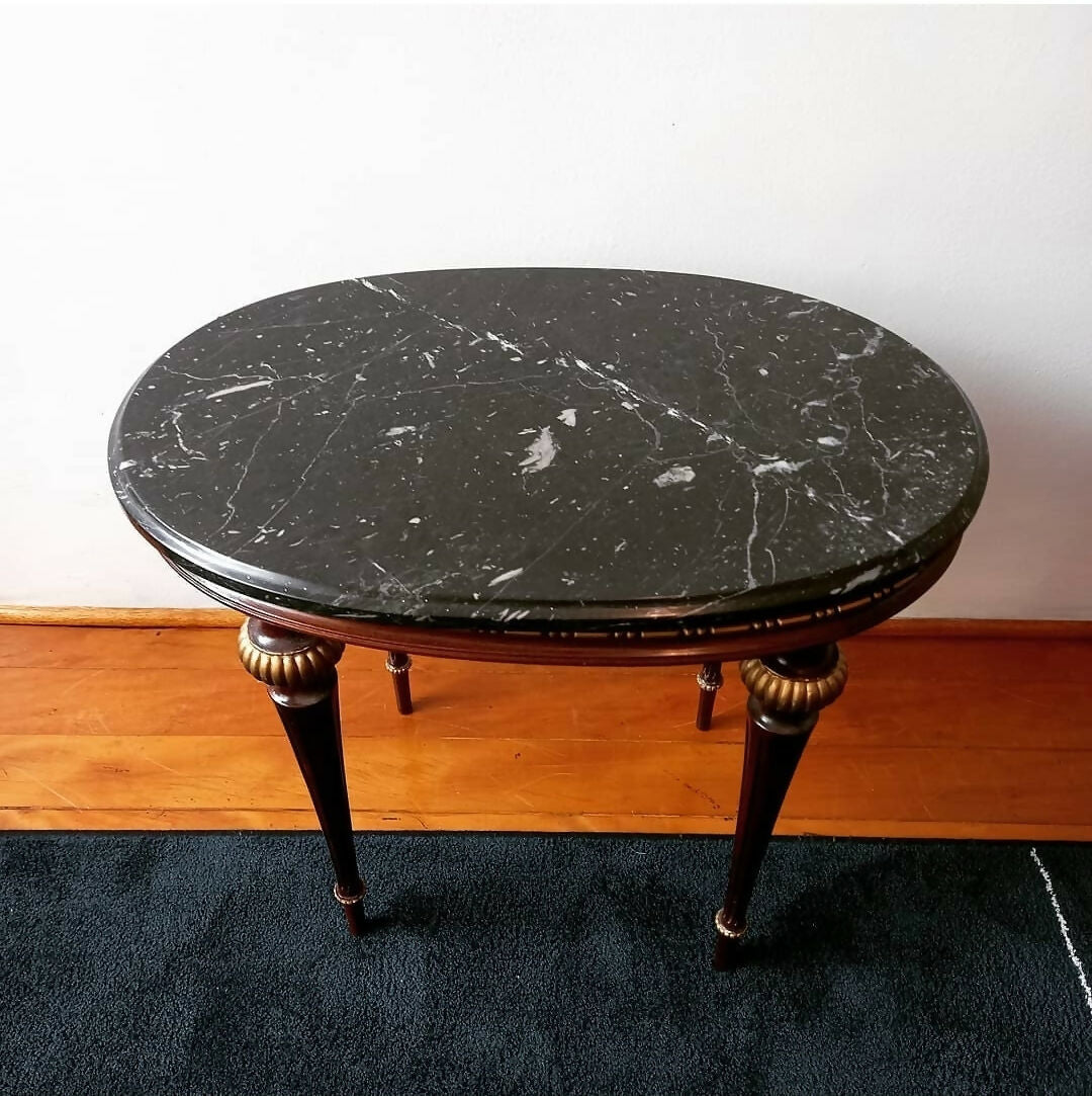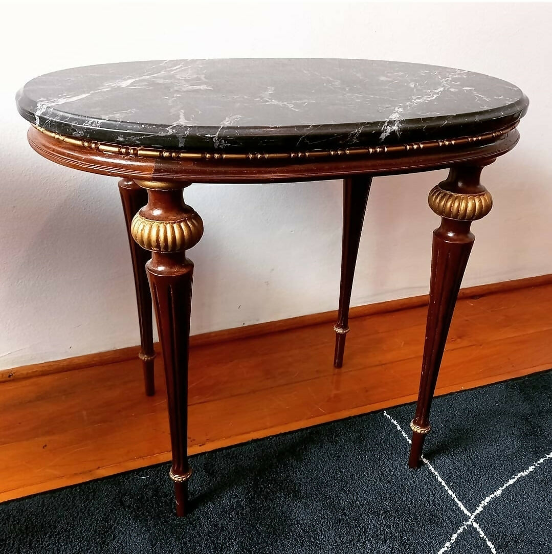 Par de mesas laterais francesas dos anos 50, madeira maciça com douração à ouro e tampo de mármore. Um dos tampos possui pequeno bicado na lateral, visível por baixo (vide fotos). Possuímos, também, a mesa de centro.