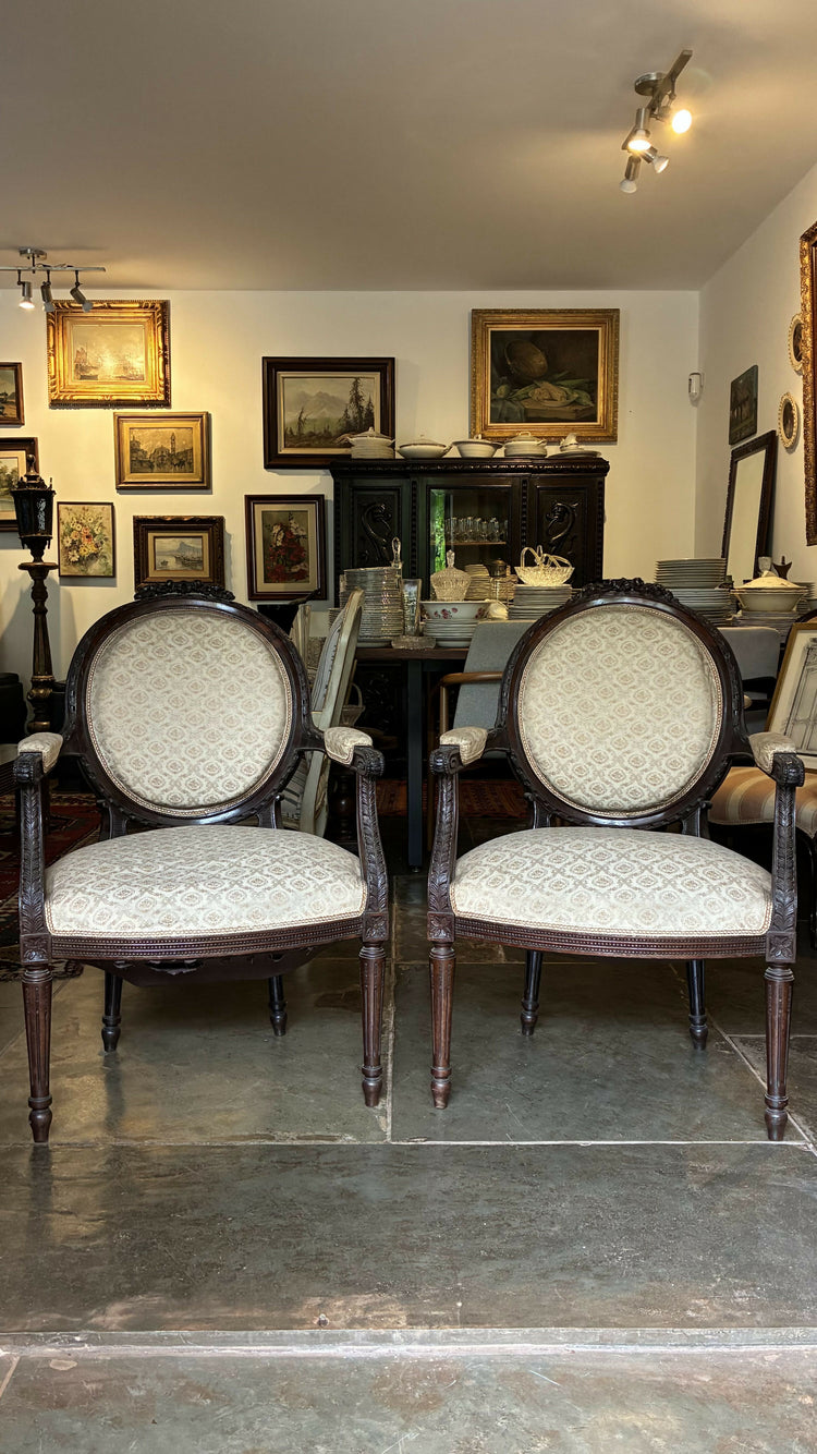 Par de poltronas antigas em madeira maciça, no estilo Luís XVI, com encosto oval, braços retos e pés torneados e afilados. Estrutura sólida, com entalhes discretos e acabamento em tom escuro.
