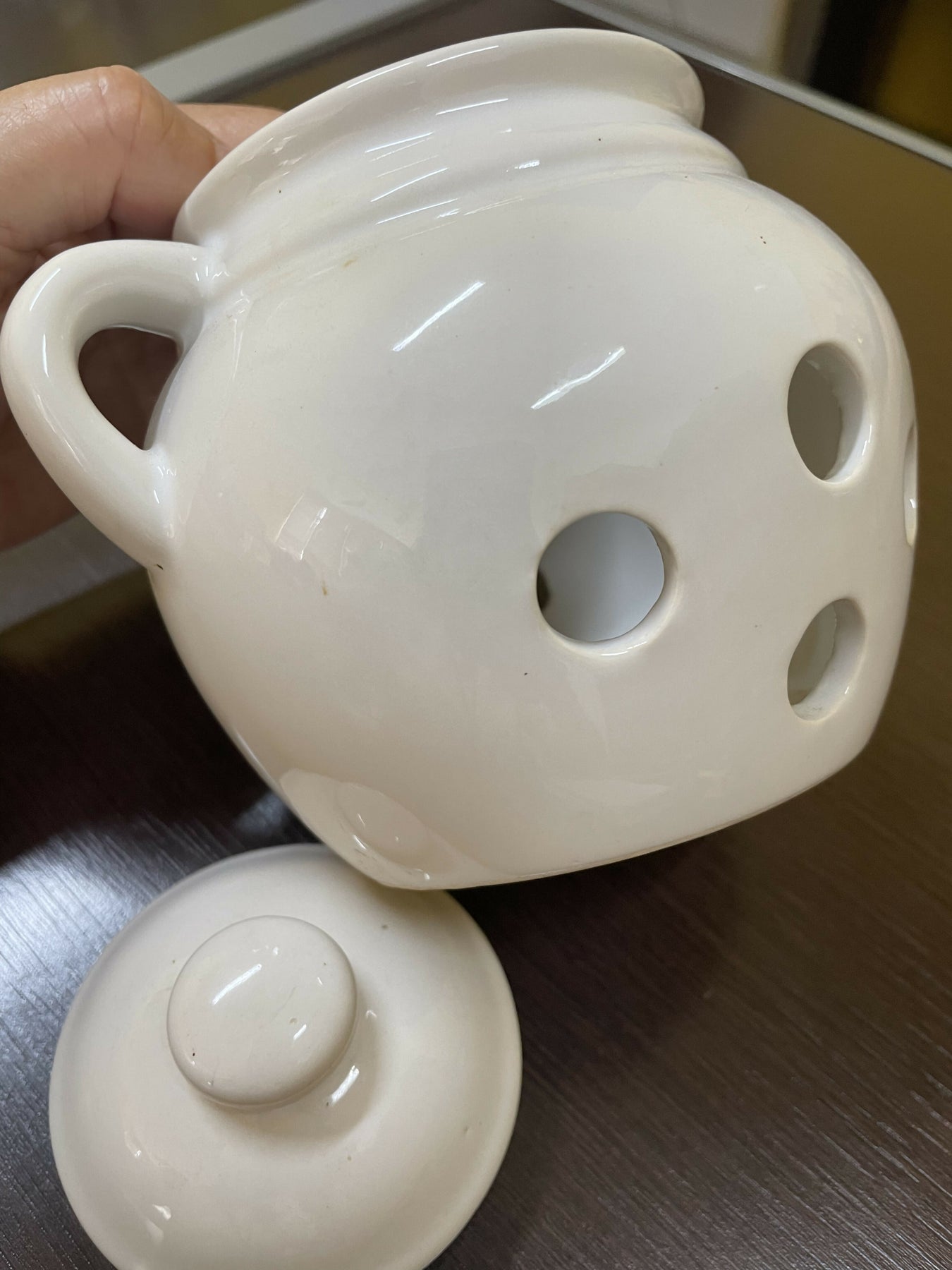 Pote de louça branca com a palavra em relevo MUSHROOM , pode ser usado para armazenar alho ou cogumelos , muito usado na Europa, uma peça para deixar a cozinha mais charmosa, pode ser usada apenas como recipiente decorativo.