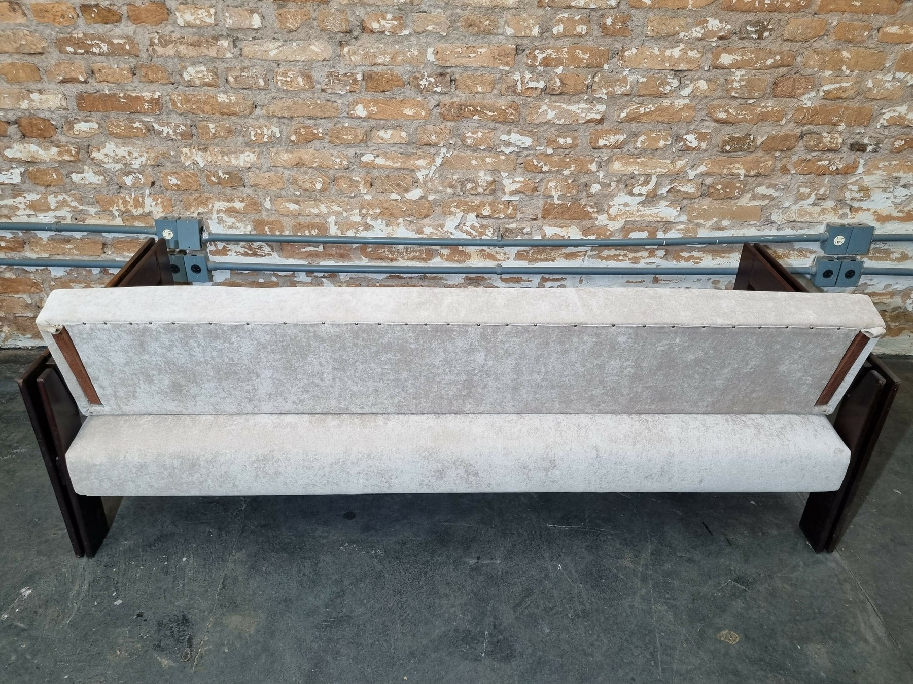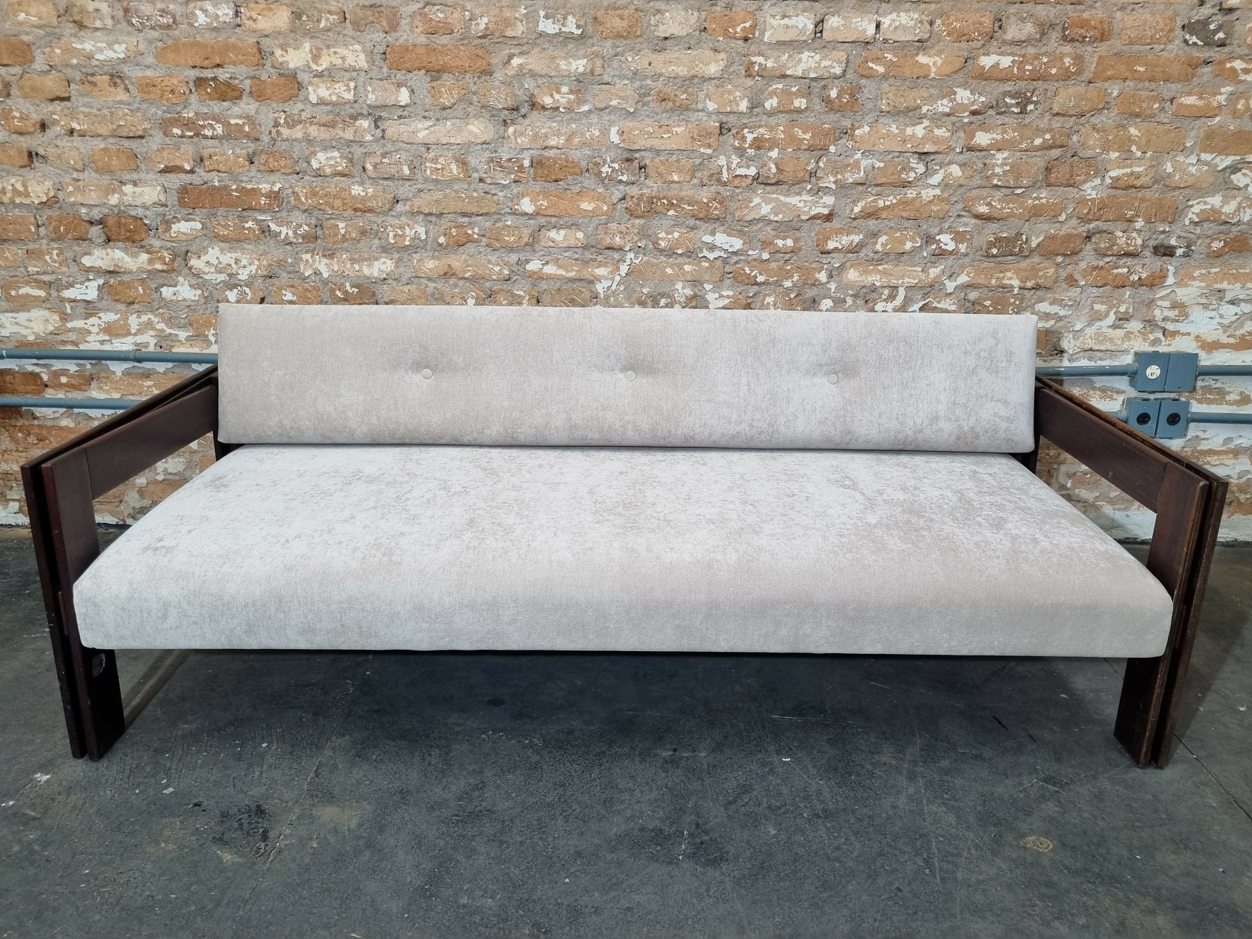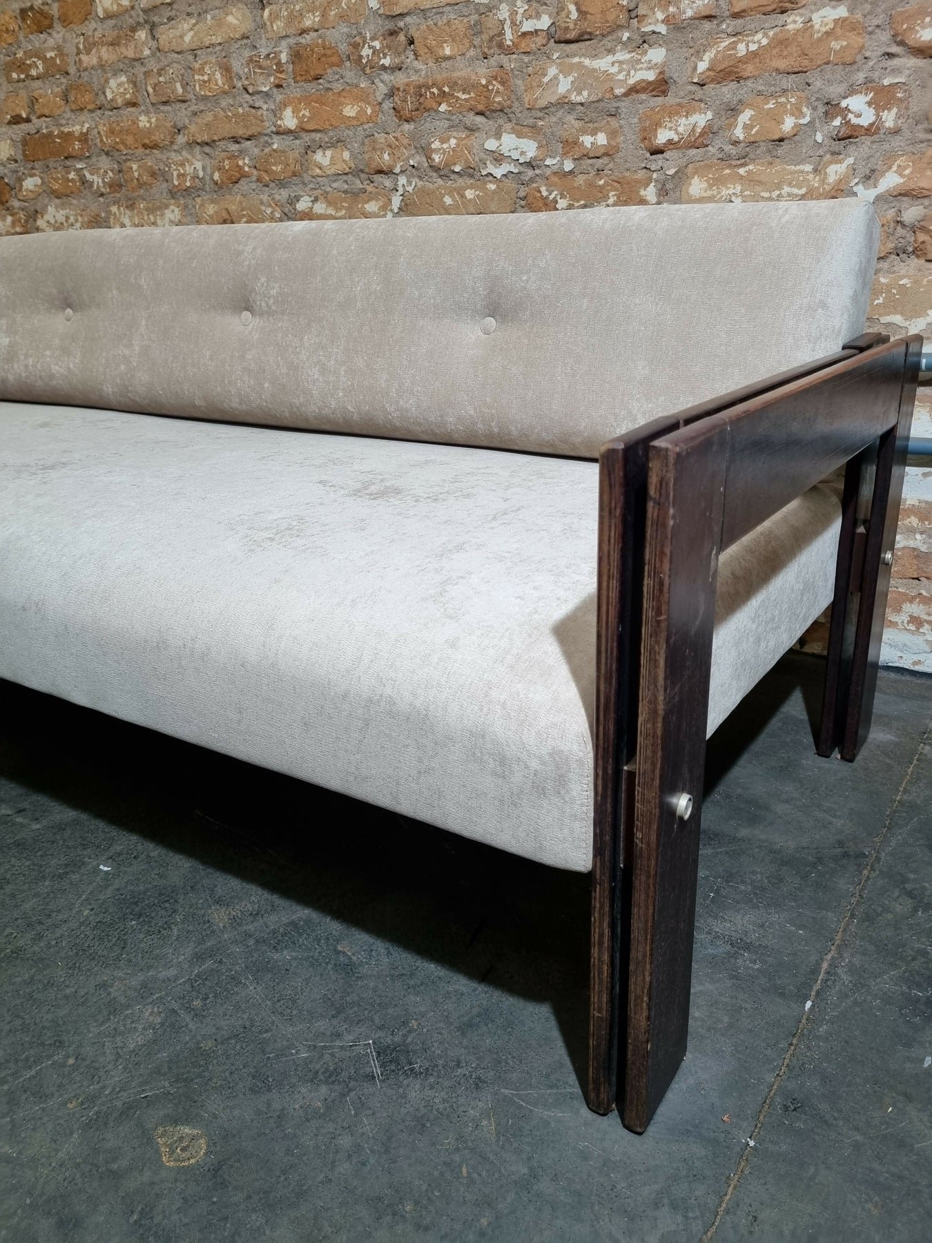 Belo sofá cama MP-85, estrutura em madeira jatobá e estofado novo de suede claro. Disponível para venda!