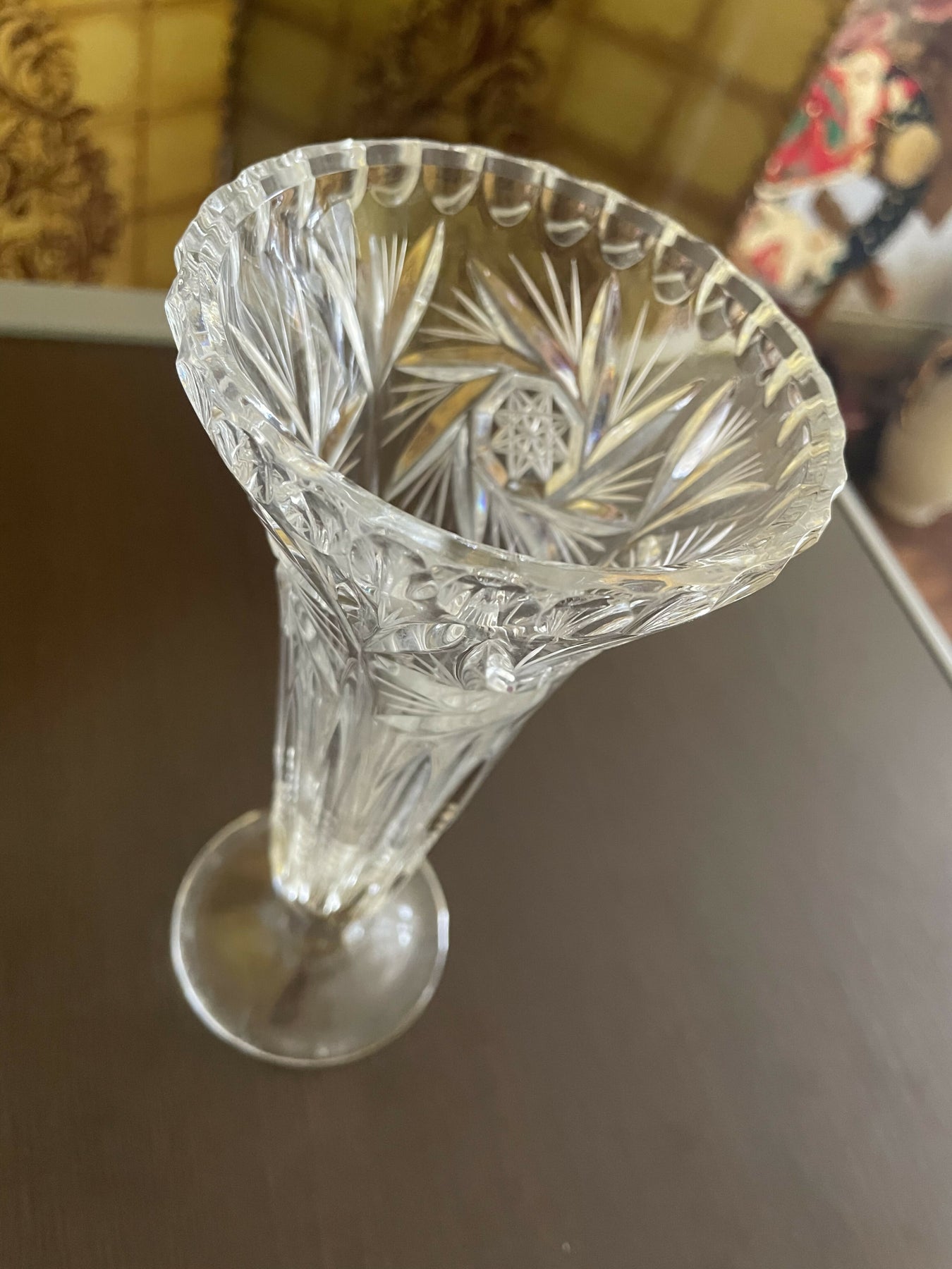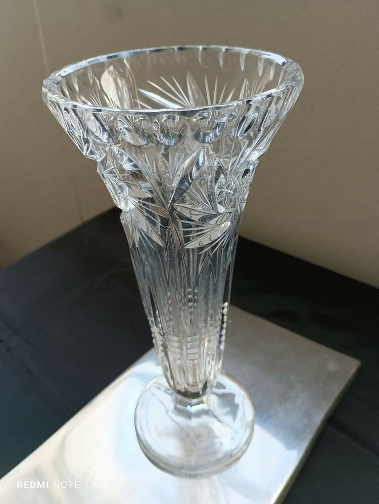 Vaso Solitário de cristal! Possui um design clássico com lapidação complexa, apresentando sulcos e padrões de estrela. A lapidação e o facetamento aumentam a refração da luz, conferindo-lhe um brilho e luminosidade distintos.