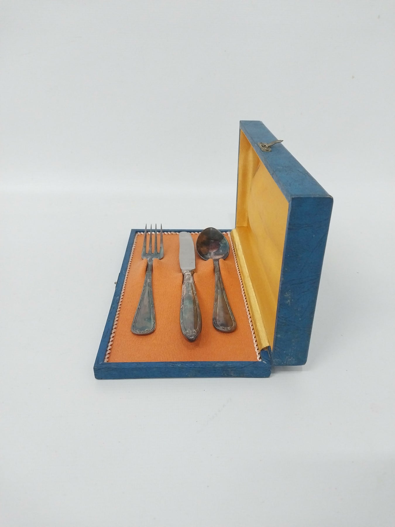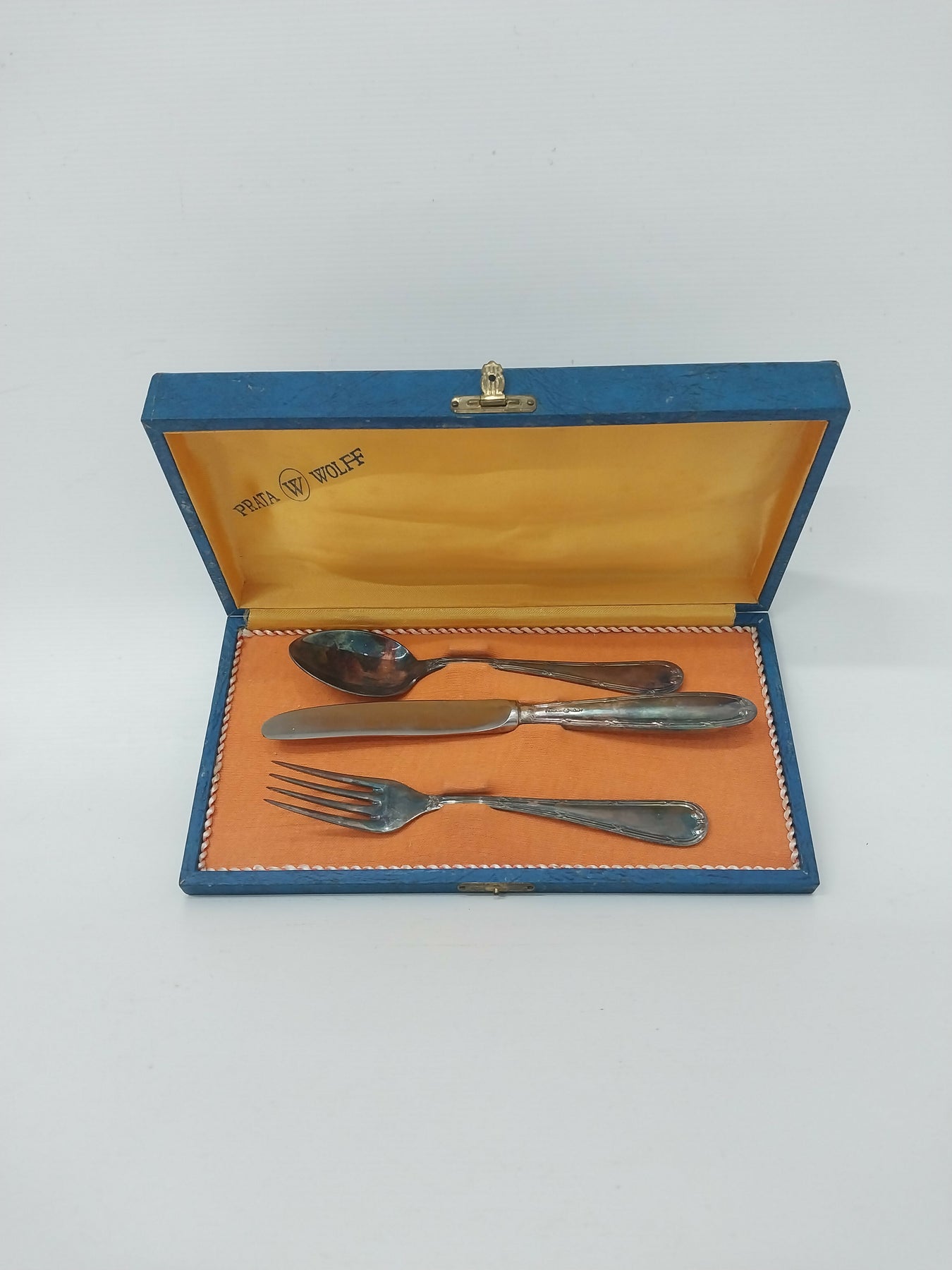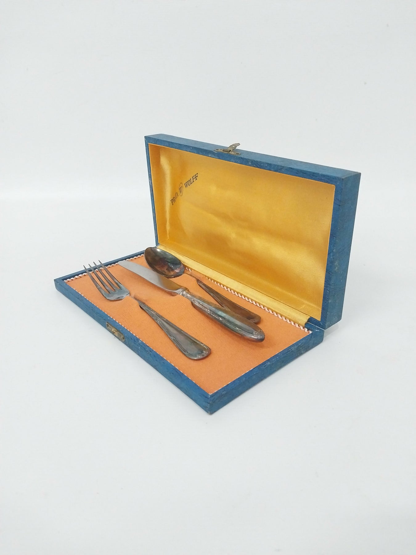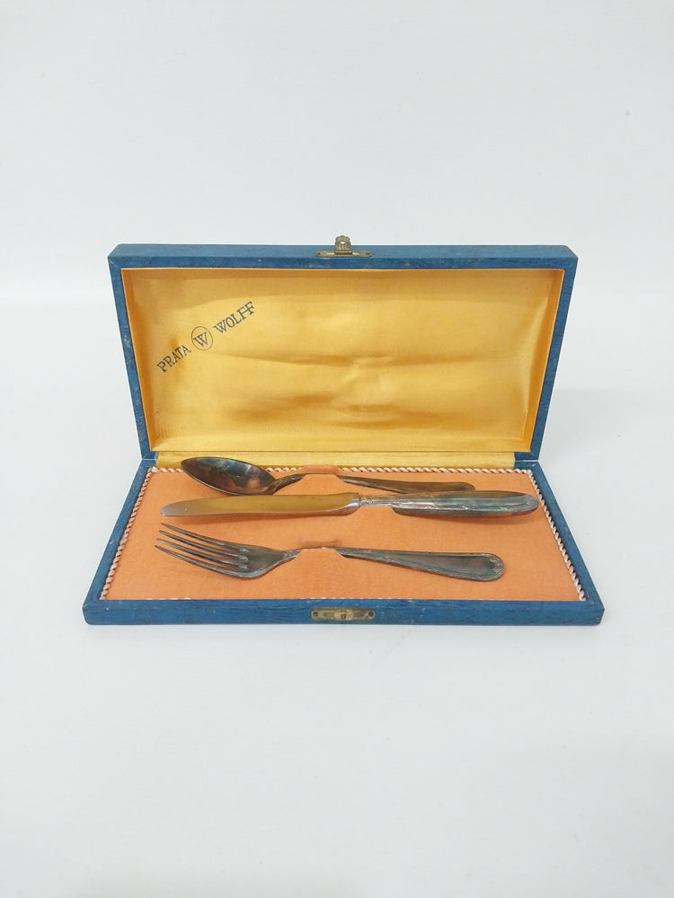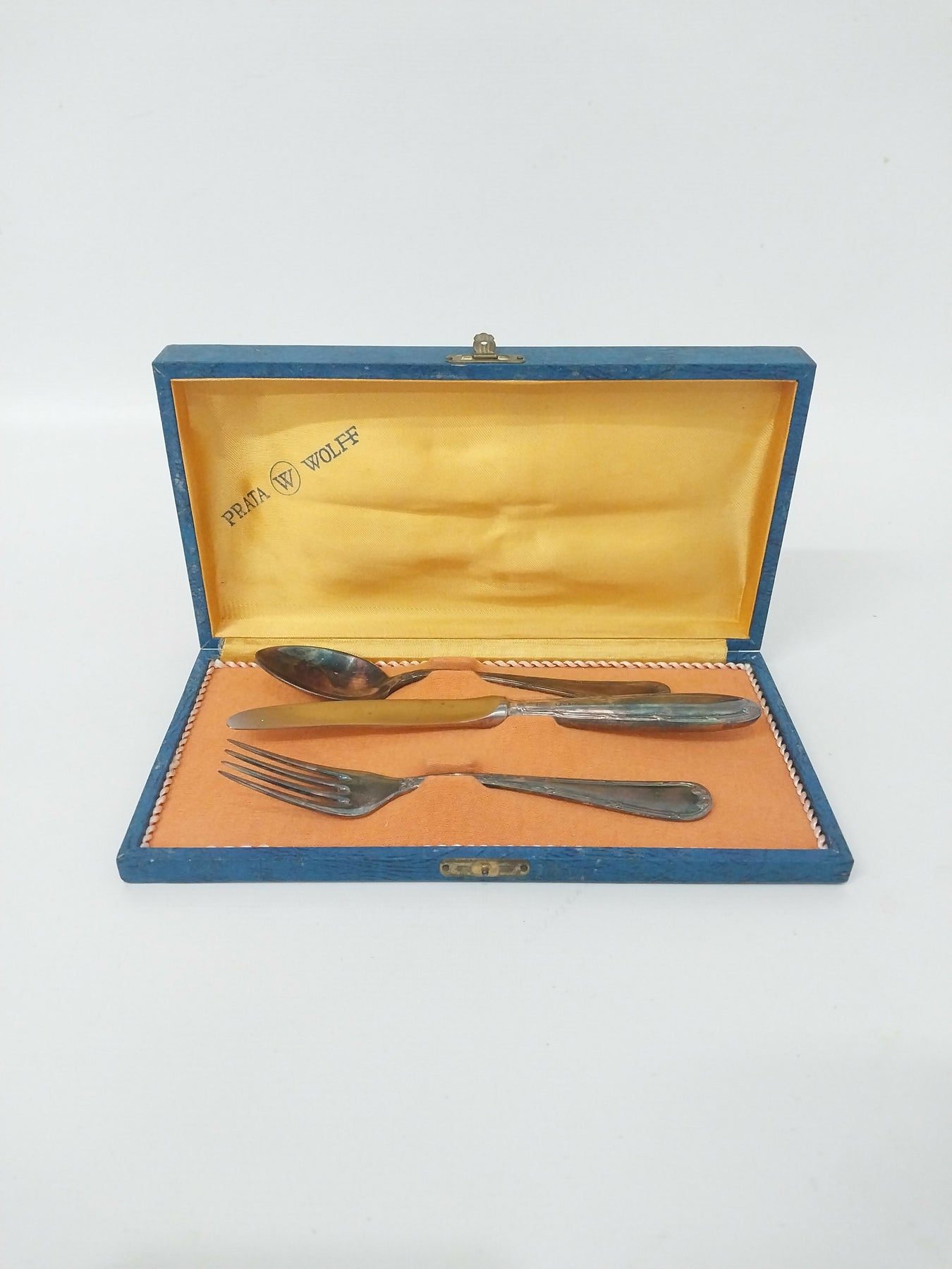 Antigo Conjunto de Talheres Infantis Prata Wolff, em estojo original, completo. Requer polimento.