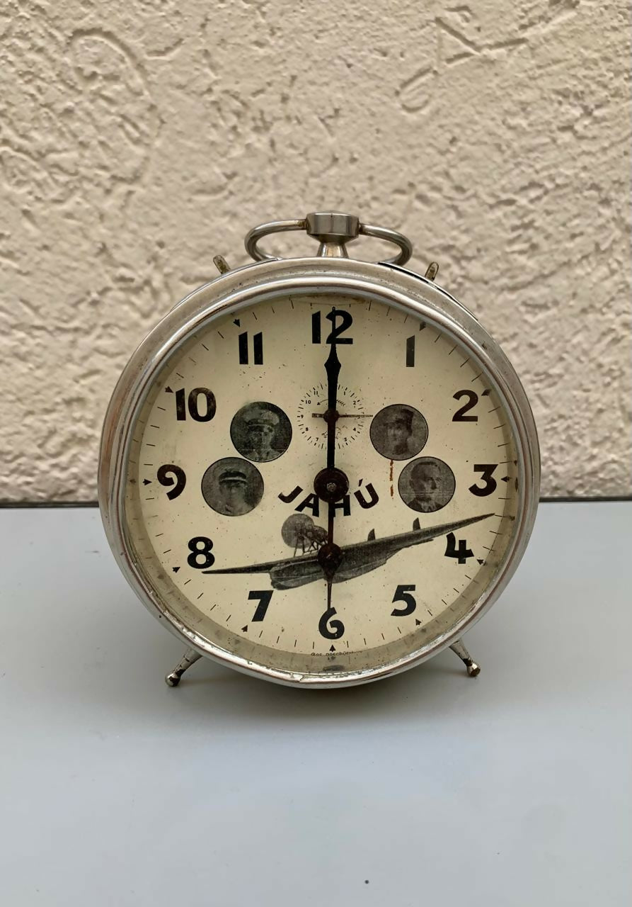 Antigo e raro despertador Italiano apresentando o avião JAHU e a efígie de seus tripulantes.