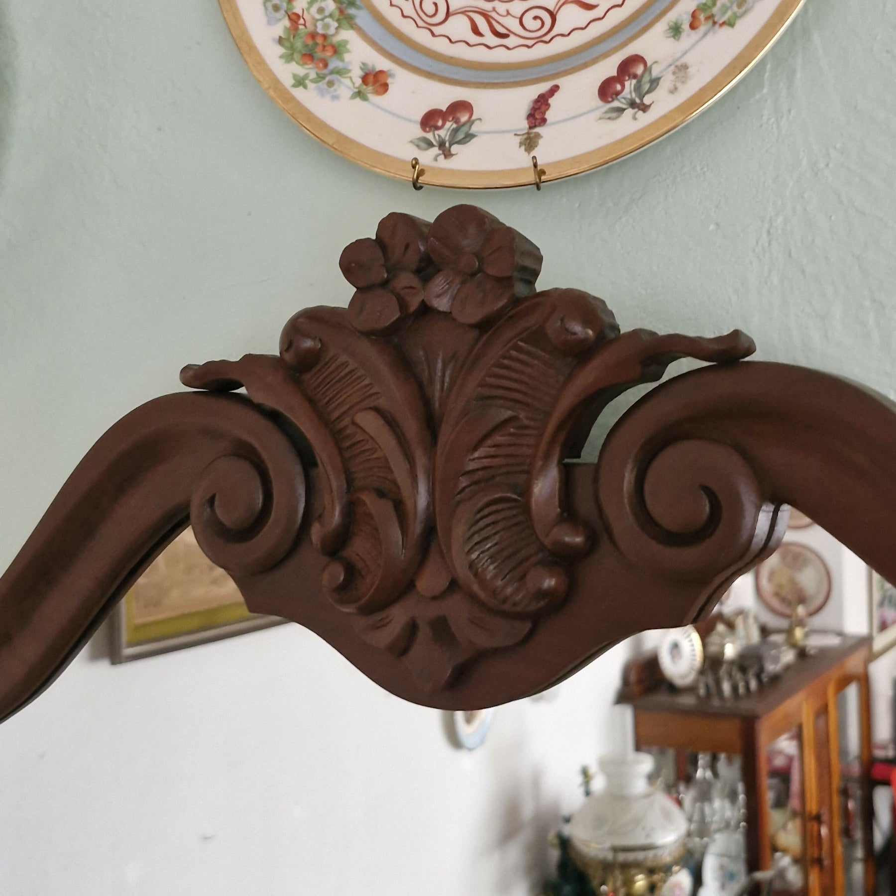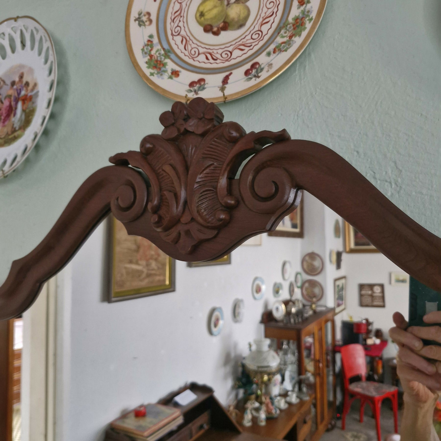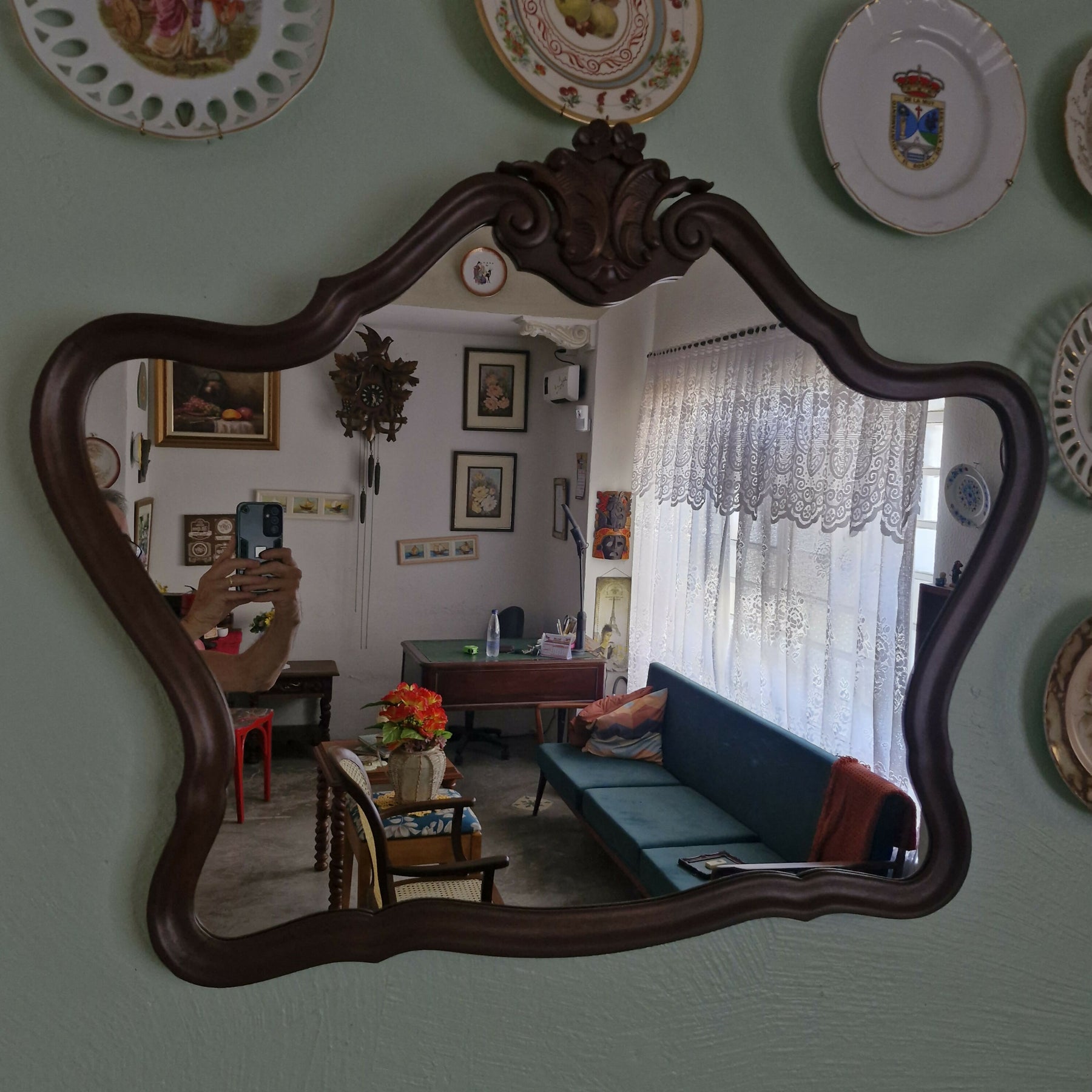 Belíssimo espelho com moldura provençal na madeira imbuia, peça grande e com lidos delhates na moldura com florão no centro dabparte superior, espelho perfeito sem manchas, peca restaurada para pronta entrega.