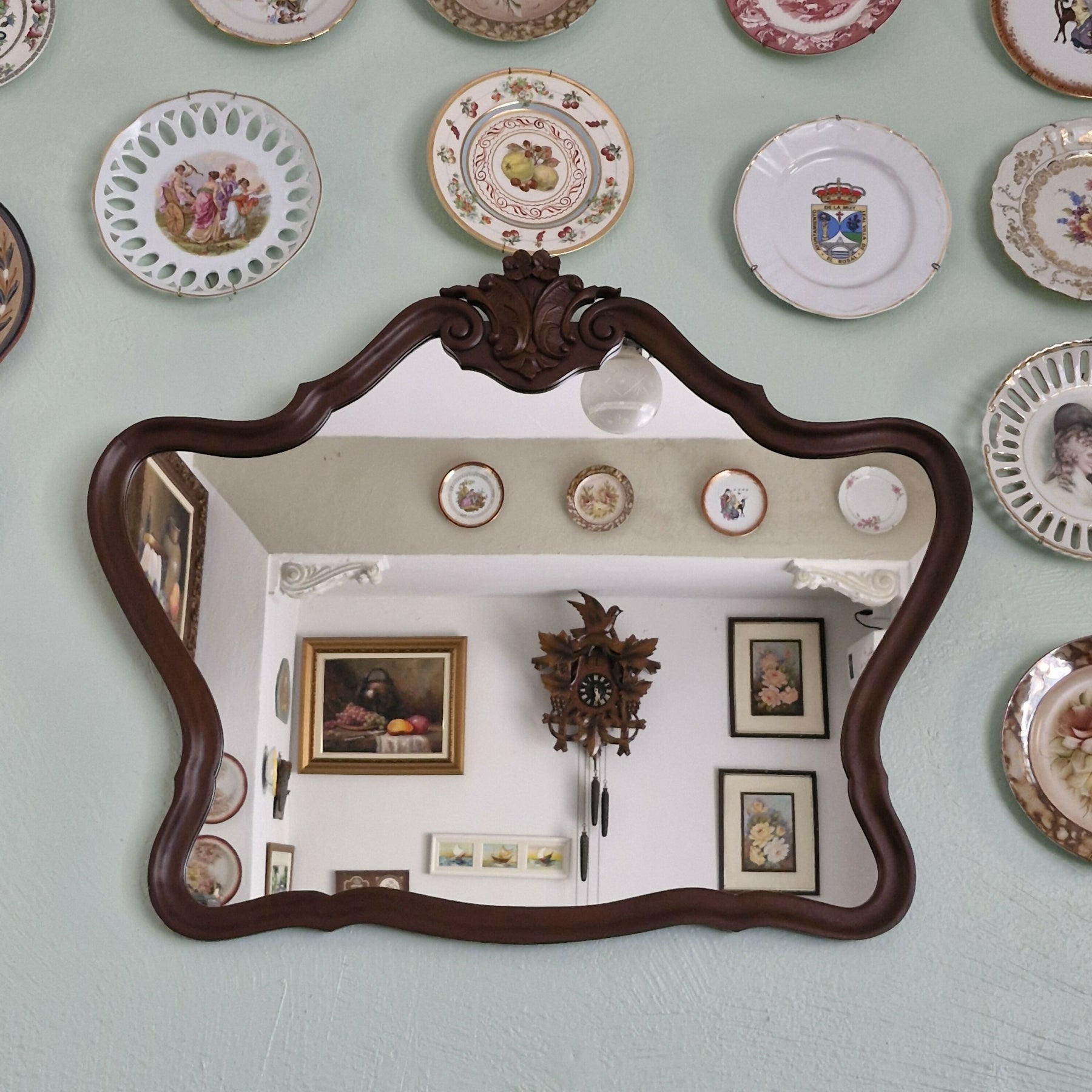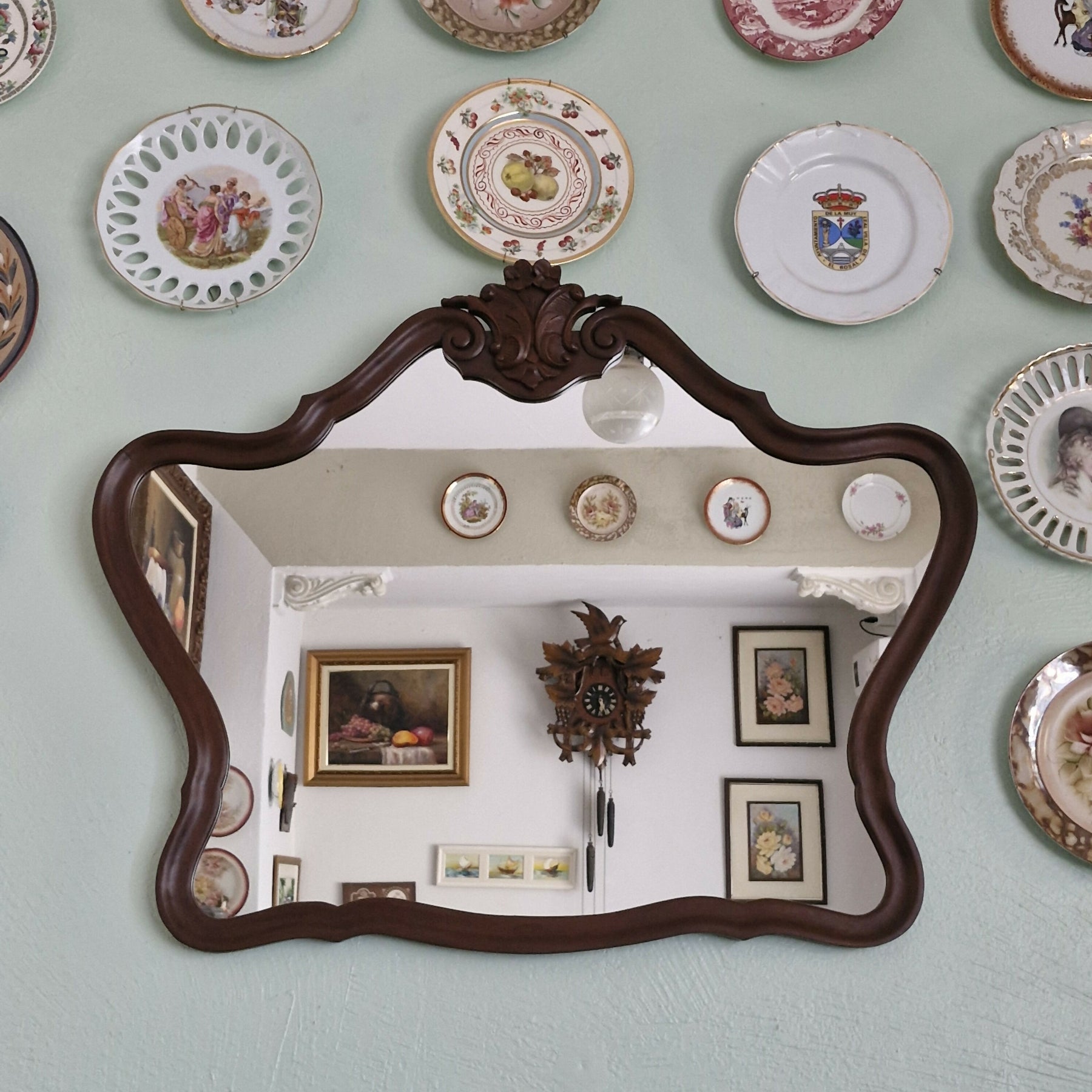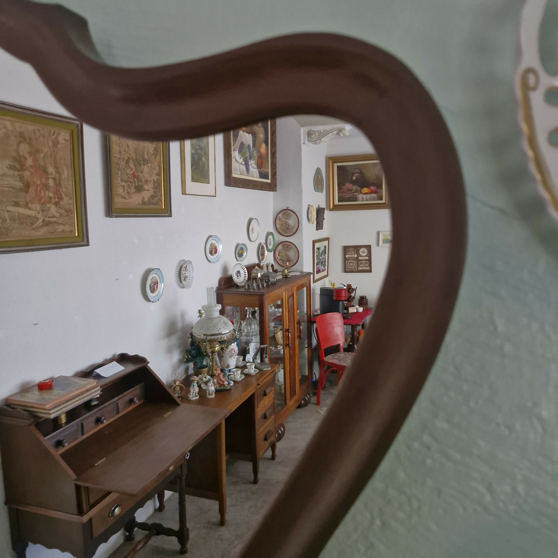 Belíssimo espelho com moldura provençal na madeira imbuia, peça grande e com lidos delhates na moldura com florão no centro dabparte superior, espelho perfeito sem manchas, peca restaurada para pronta entrega.