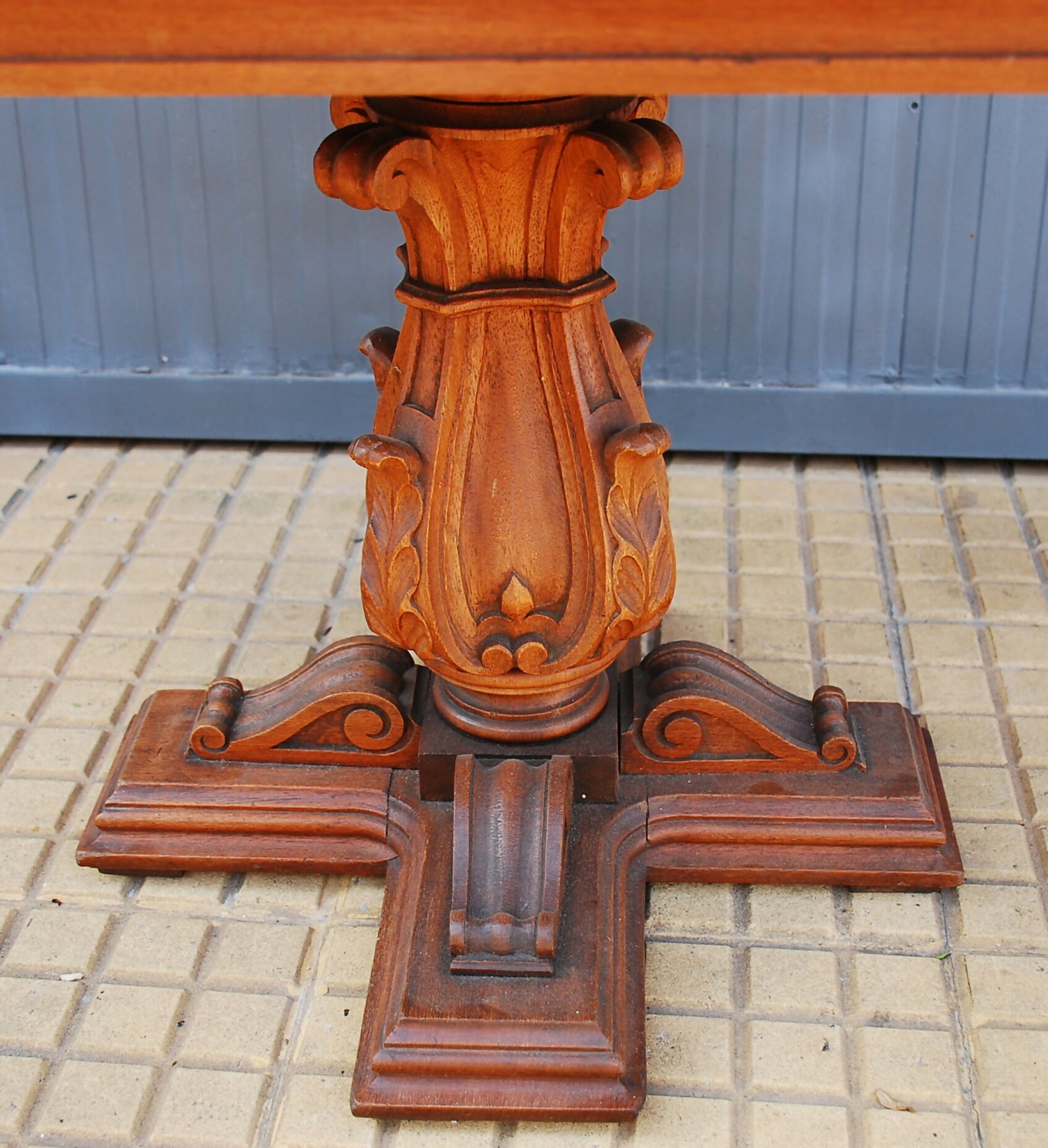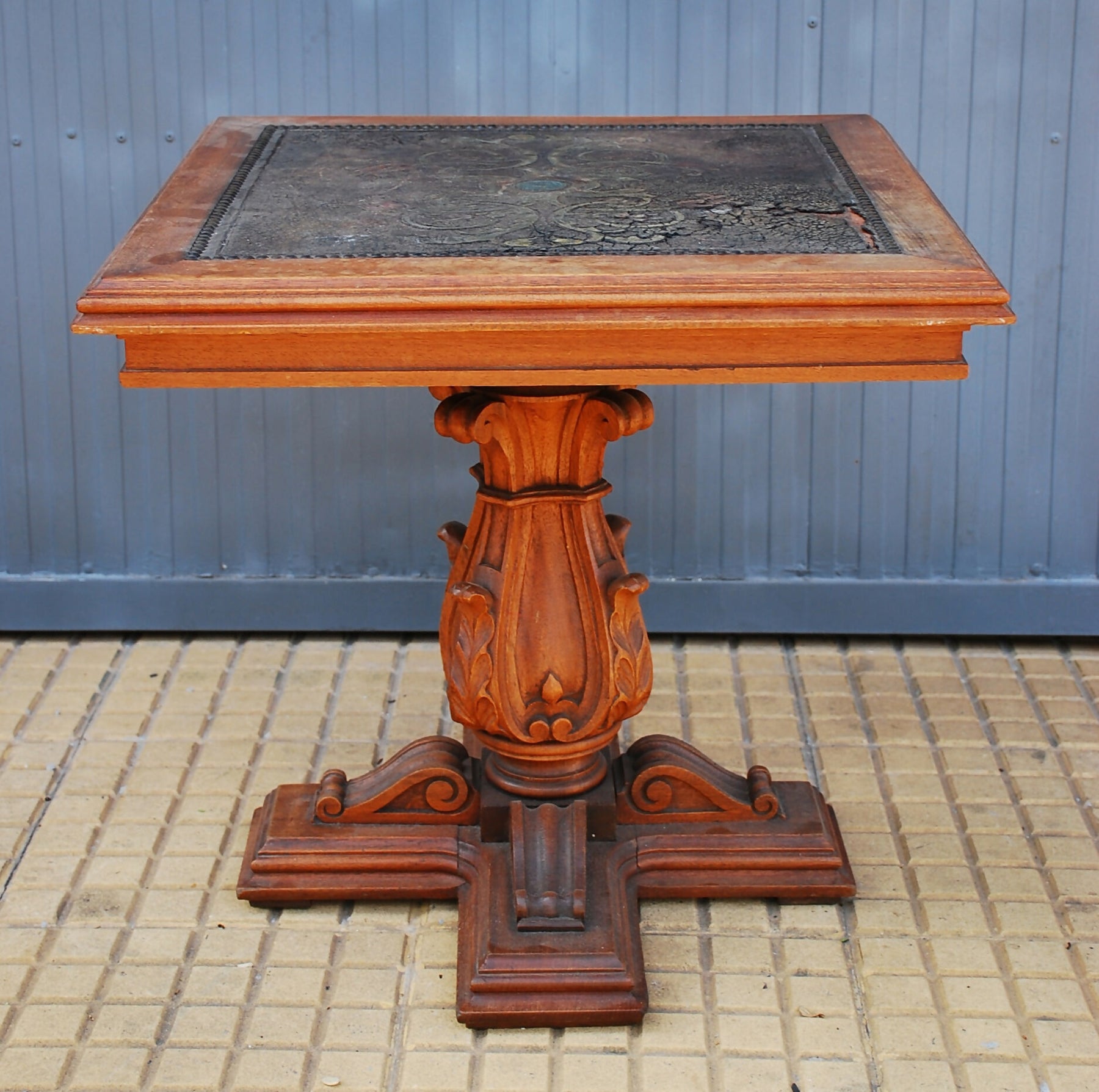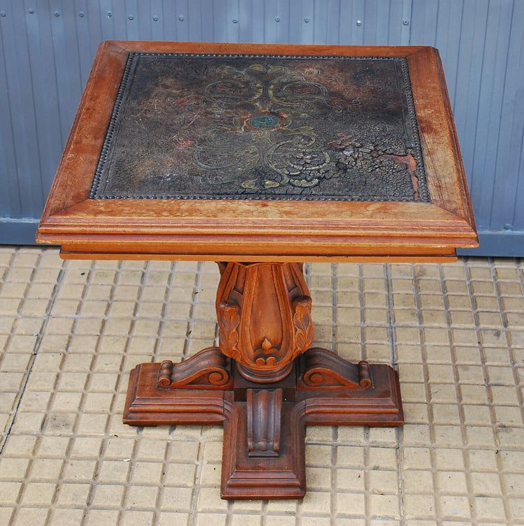 mesa centro com tampo couro anos 70- 0,55 x 0,55 x 0,50, madeira entalhada . marcas do tempo .