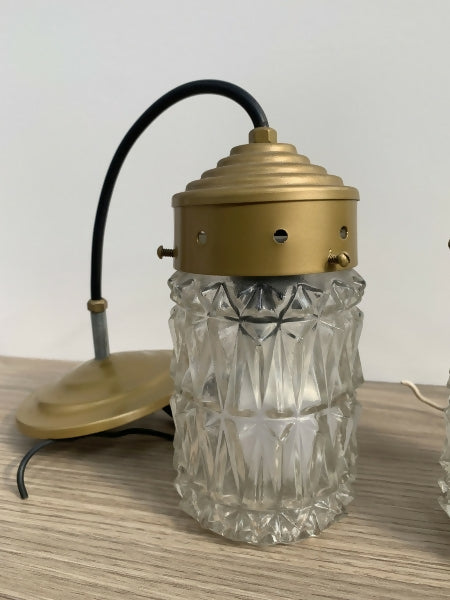 Par de lustres pendente em forma de cilindro de vidro translúcido com trabalhos em relevo e metal dourado. Mede 18,5 cm de altura e 9 cm de diâmetro. Em excelente estado de conservação.