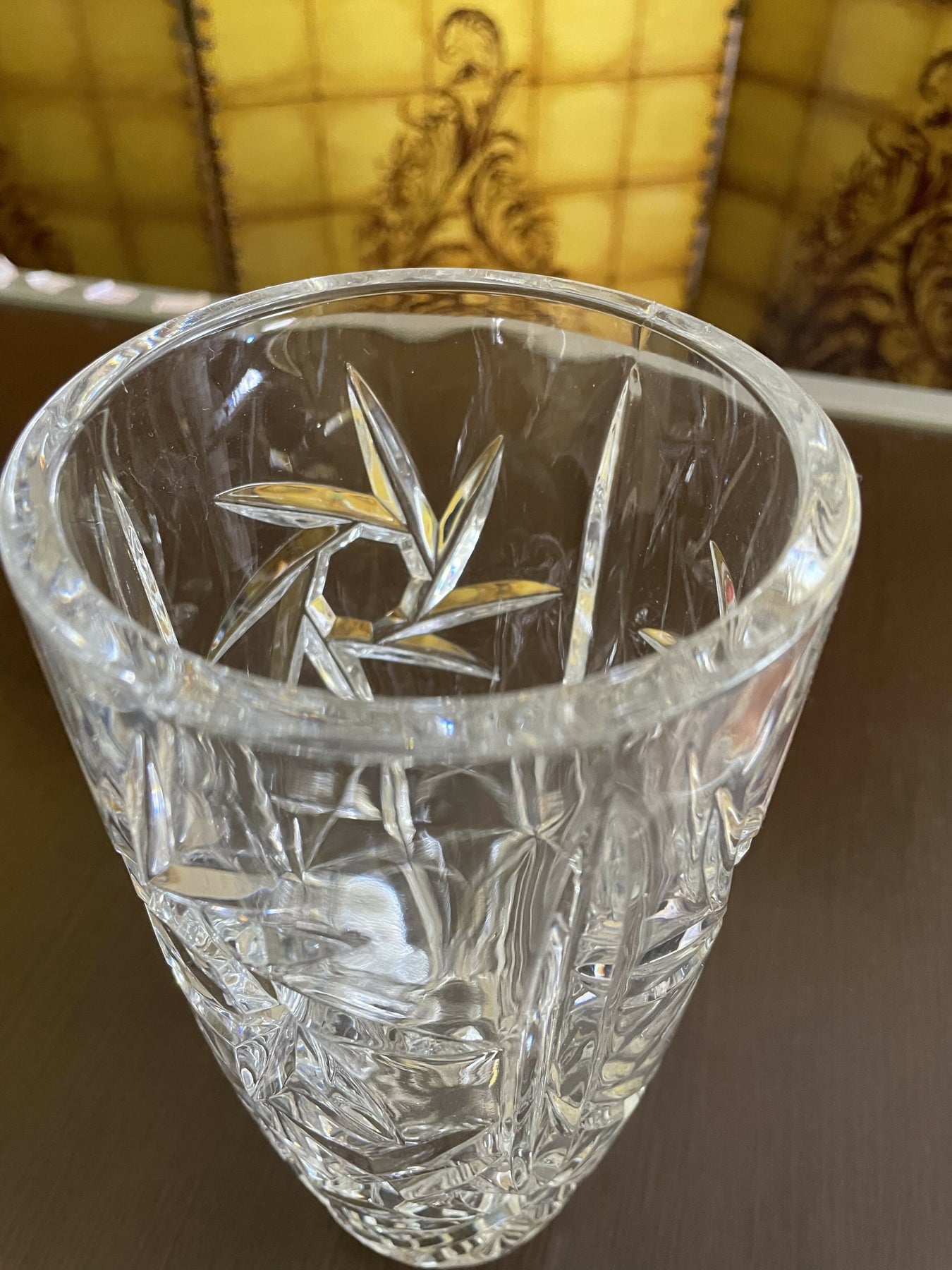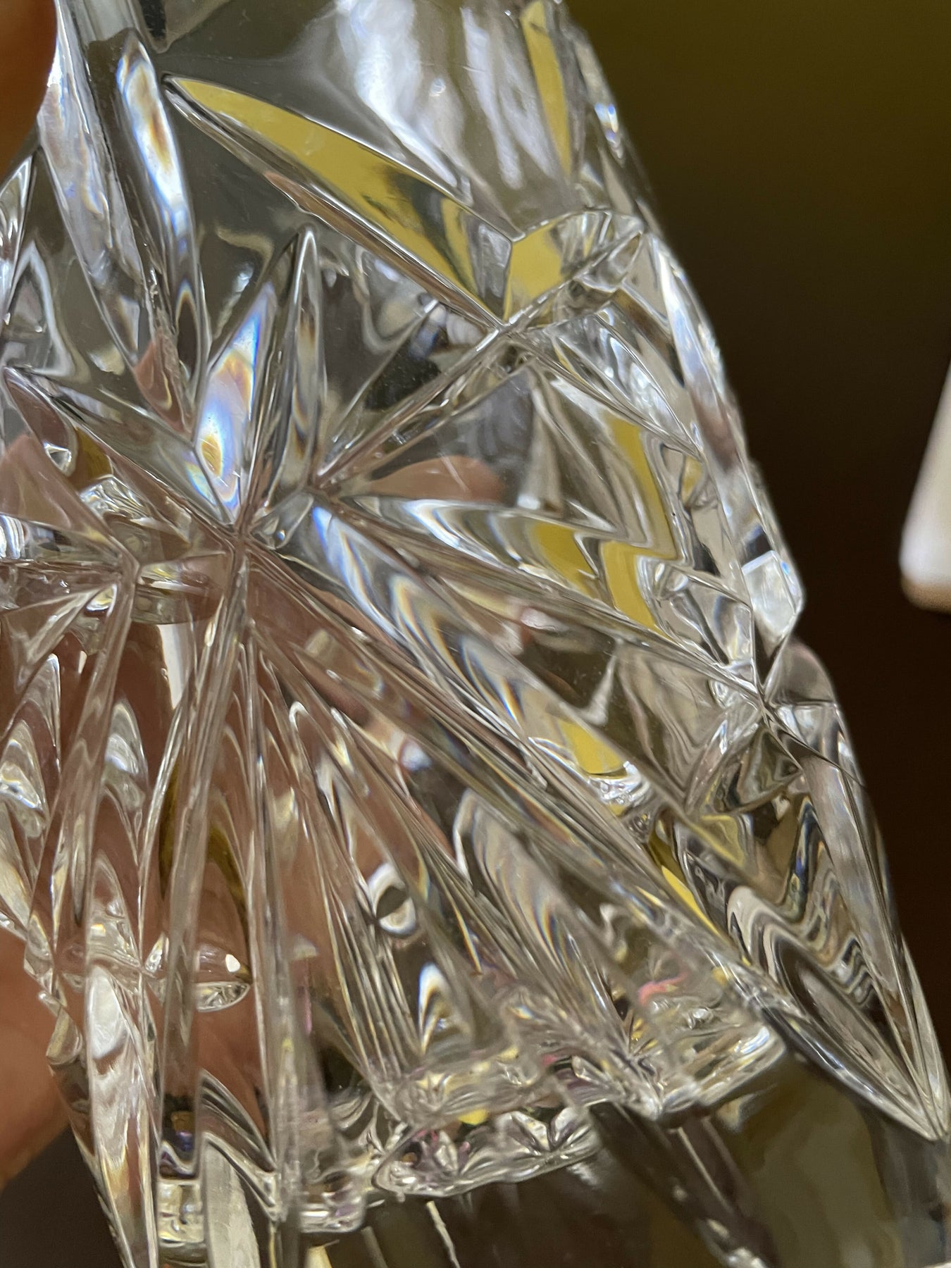 Vaso de cristal lapidado, provavelmente com lapidação do tipo"diamante" e "estrela". Esse  tipo de vaso é feito de cristal translúcido de alta qualidade. Apresenta cortes geométricos complexos, incluindo padrões que se assemelham a estrelas e diamantes alargados, o que ajuda a refratar a luz e criar um efeito cintilante.