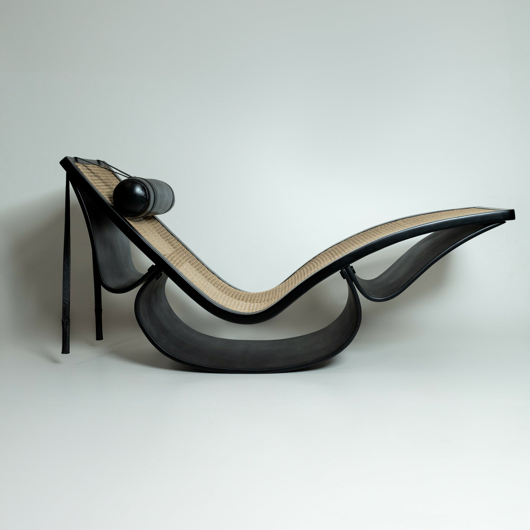 Oscar Niemeyer - Chaise Longue Rio - Excepcional chaise de balanço confeccionada em madeira curvada e palhinha, laqueada na cor preta, c. 1970, apresenta selo da Fundação Oscar Niemeyer. Reproduzida nas páginas 231 a 235 do livro Oscar Niemeyer - Obras y Projectos ( Works and Projects ), de Josep M. Botey (Barcelona: Gustavo Gill, 1996); e nas páginas 60 e 61 do livro O móvel Moderno no Brasil, de Maria Cecília Loschiavo dos Santos (São Paulo: Studio Nobel-Fapesp- Edusp, 1995).