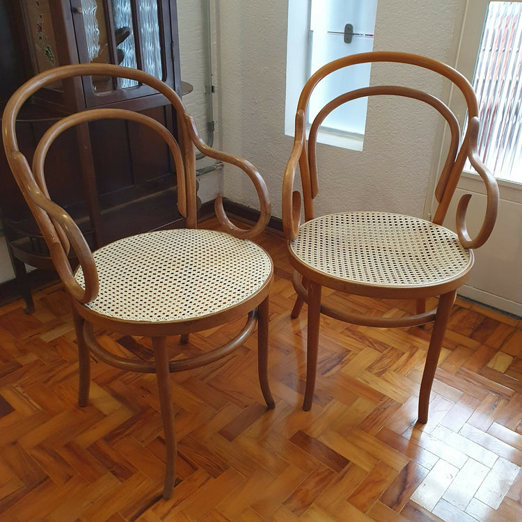 Estrutura em madeira maciça vergada restaurada, assento em palhinha original.