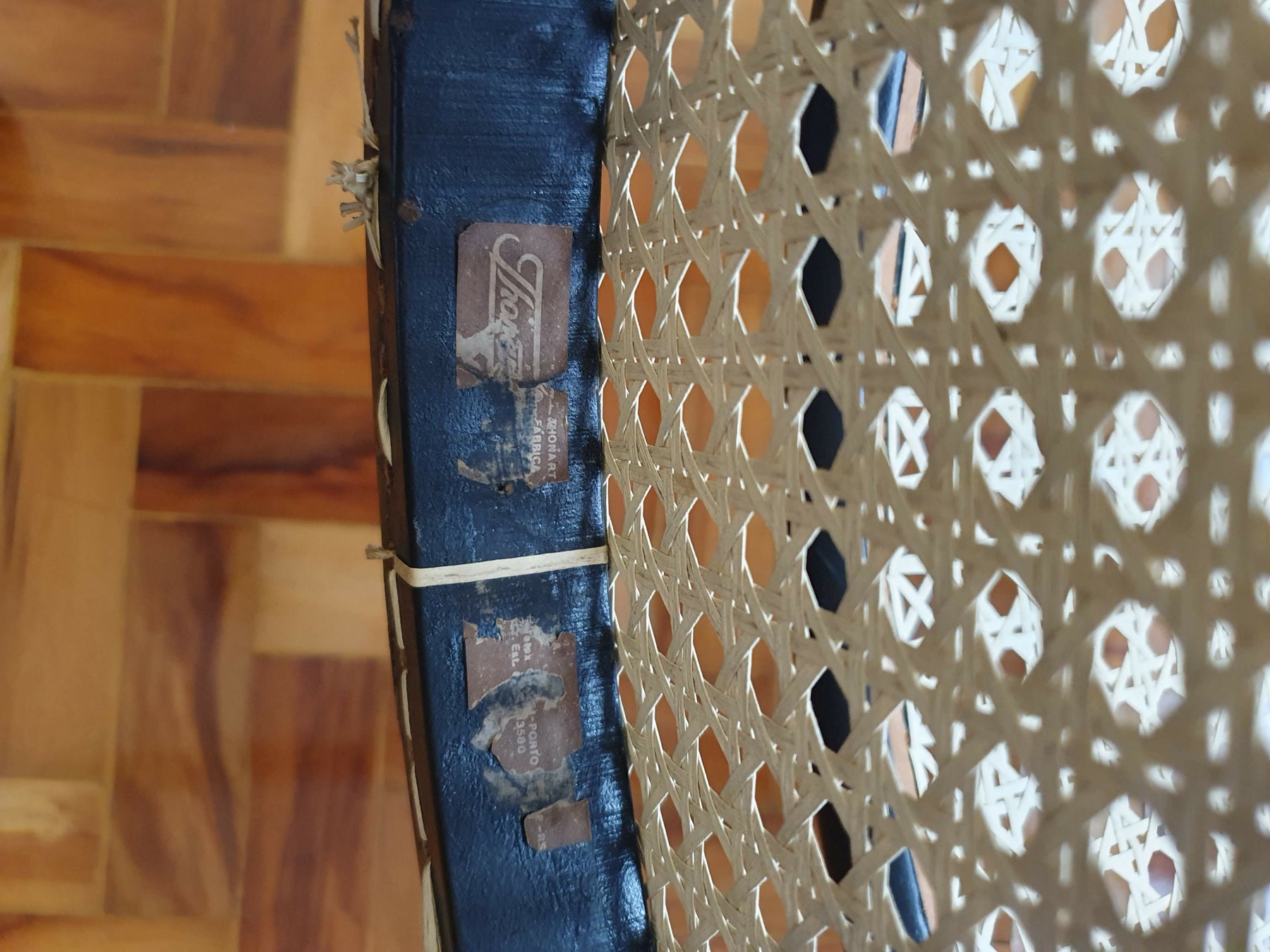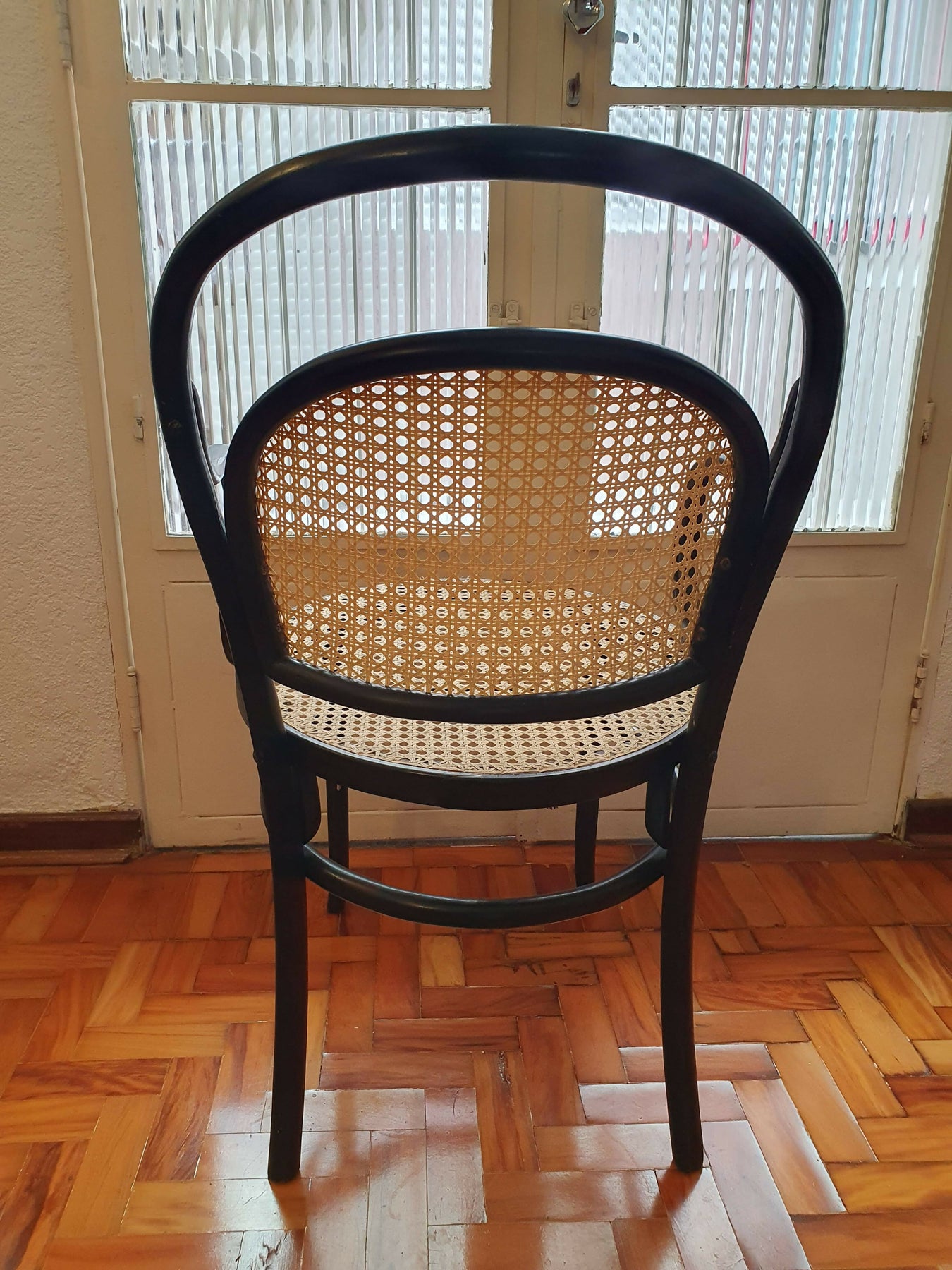 Estrutura em madeira maciça vergada com pintura na cor preta, encosto e assento em palhinha de fibra de algodão nova. As peças apresentam sutis marcas de uso na pintura.
