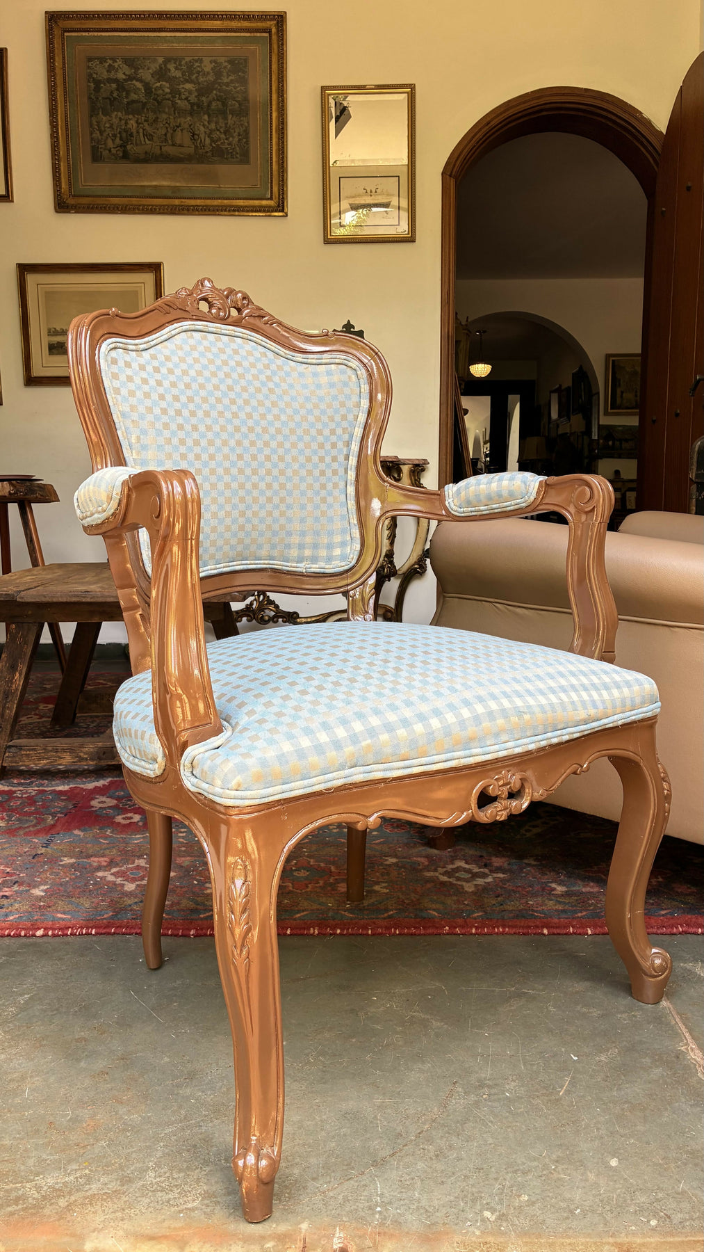 Lindo par de poltronas no estilo Luis XV, com estrutura em madeira entalhada e acabamento chocolate laka . As peças apresentam linhas curvas, braços torneados e pés cabriolet, características marcantes do estilo. Estofamento em tecido azul com padrão xadrez delicado, oferecendo conforto e sofisticação.
