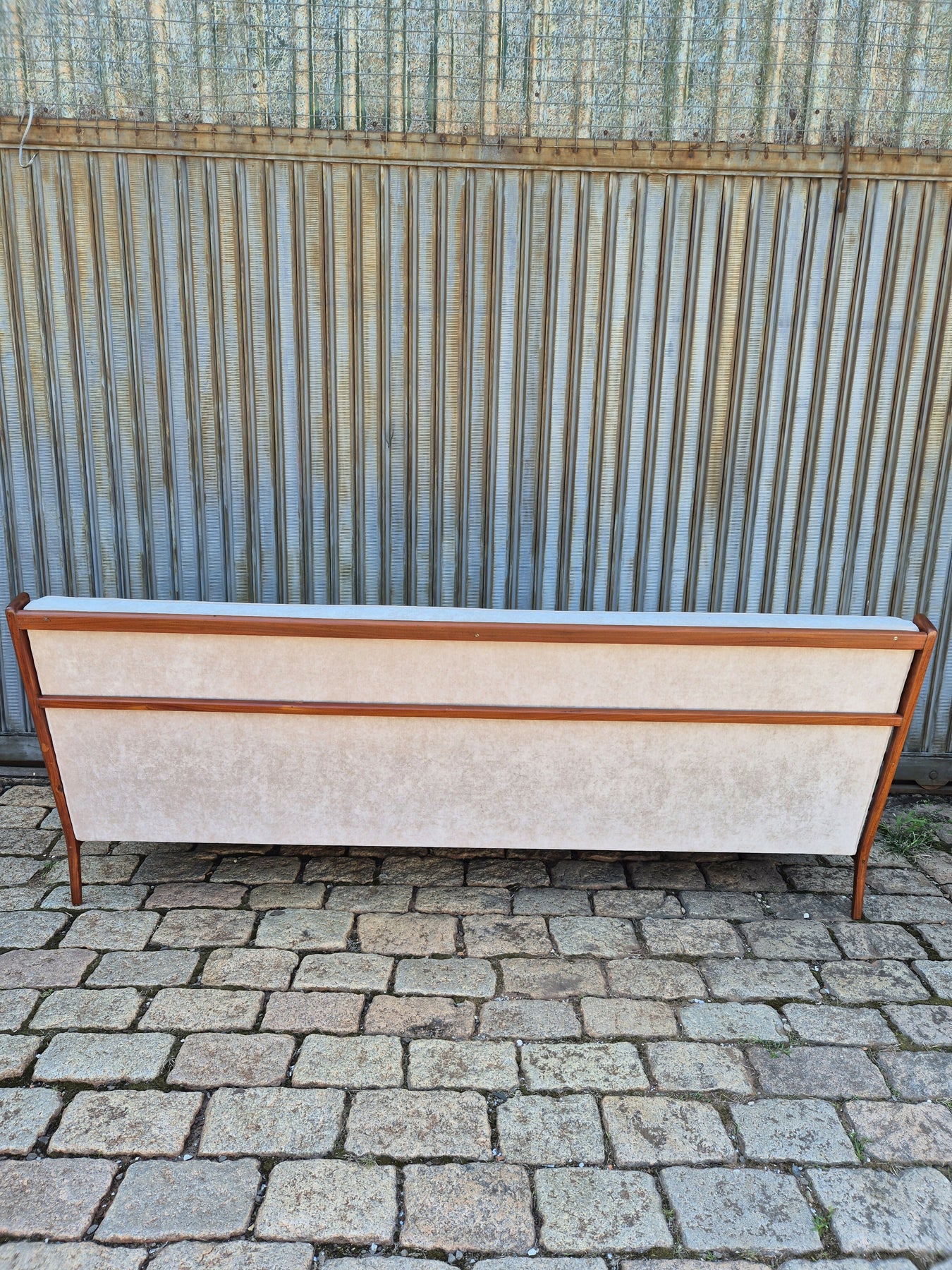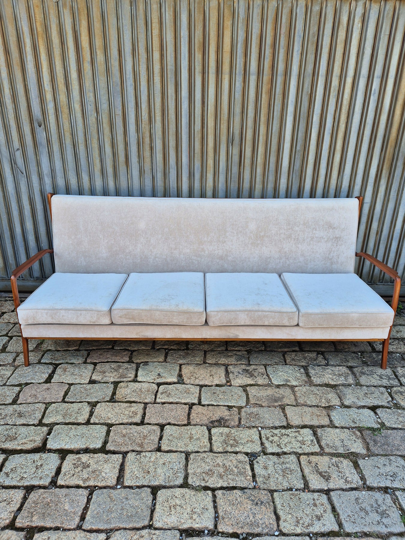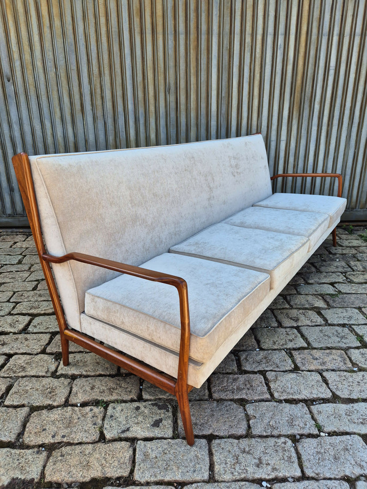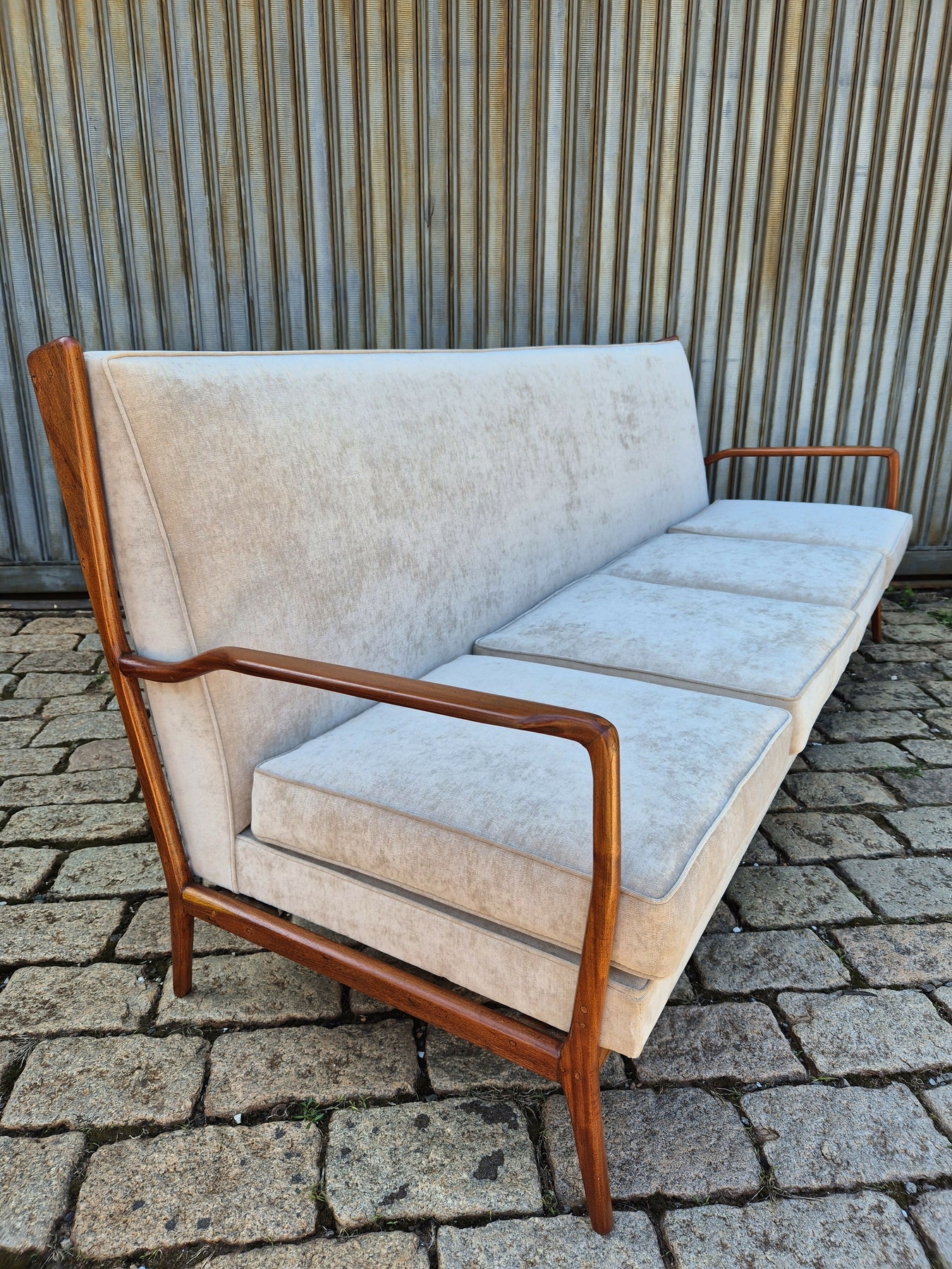 Belo e raro sofá de 3 lugares atribuído ao arquiteto Rino Levi, estrutura de madeira cabreúva e estofado novo em suede claro. Restaurado, disponivel para venda!