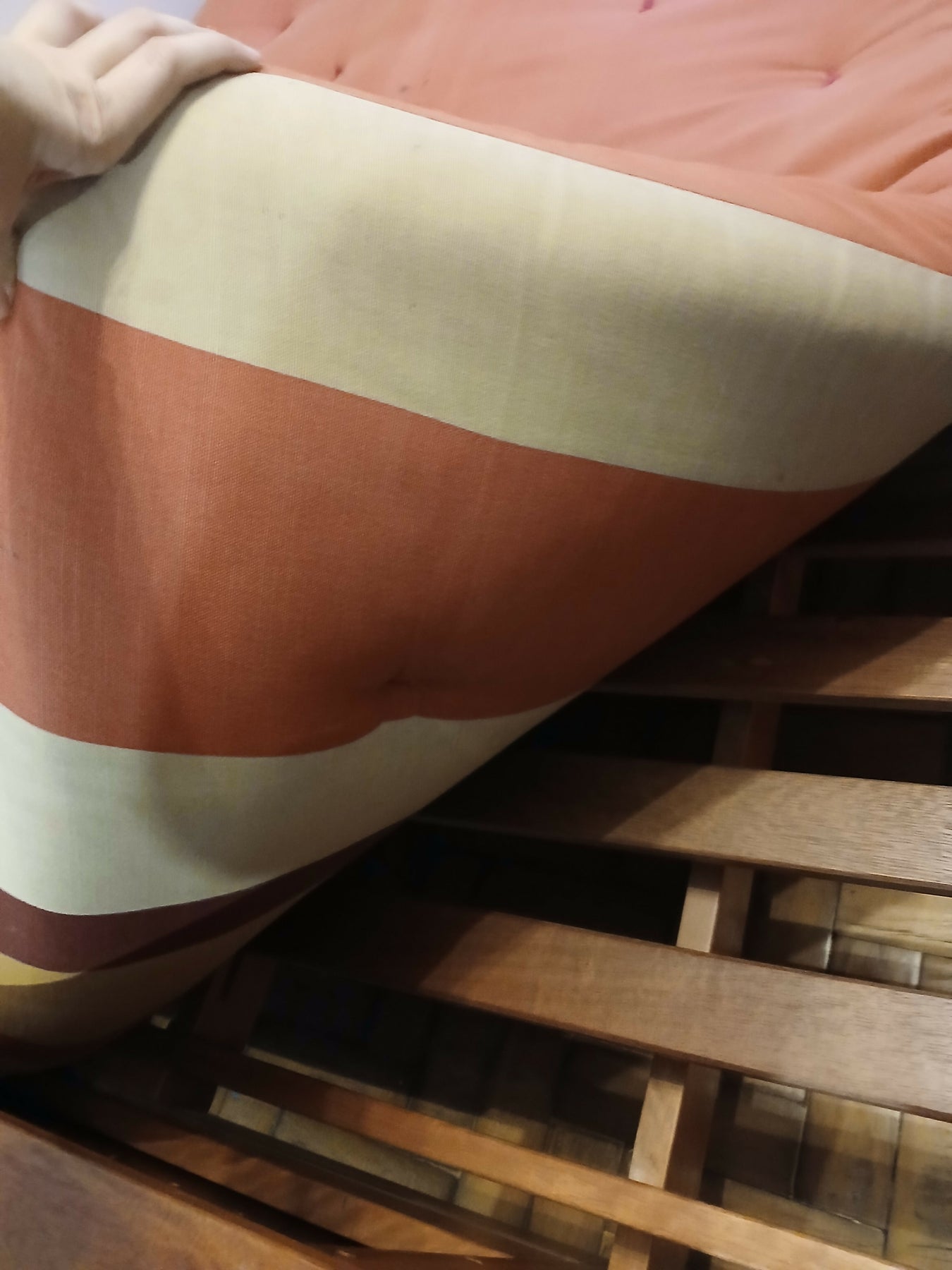 O futon (mais pesado que a base de madeira), em tom terroso avermelhado de um lado, do outro sao listras de tons terrosos, é denso e acolhedor: sustenta o corpo e a memória.