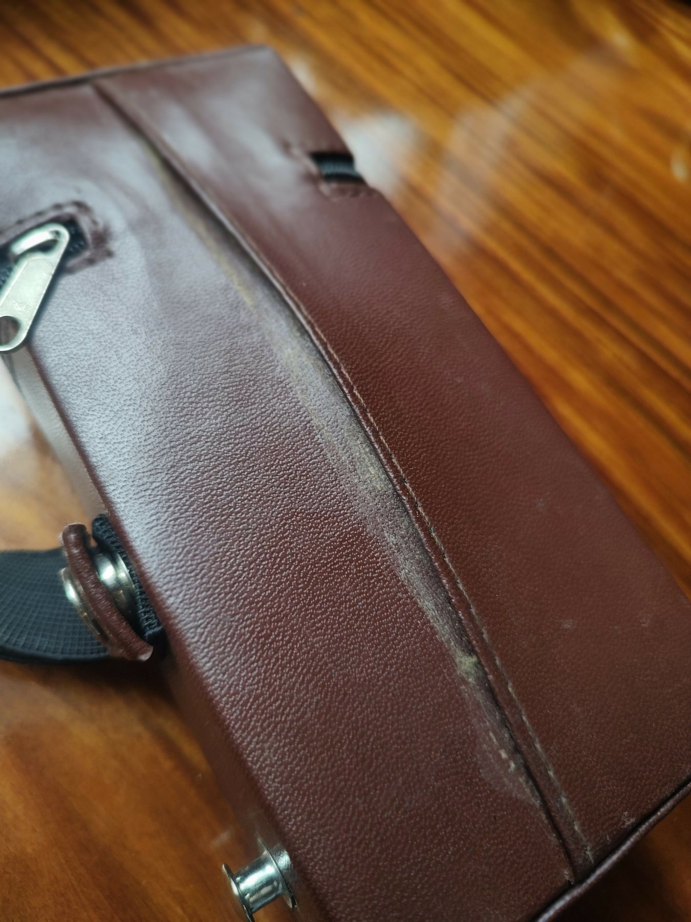 Acabamento em couro na parte traseira encontra-se discretamente descolada (ver foto), o que não influencia em nada no uso.