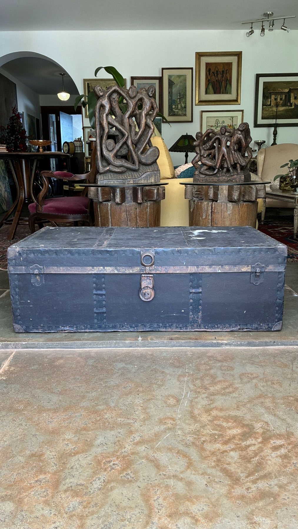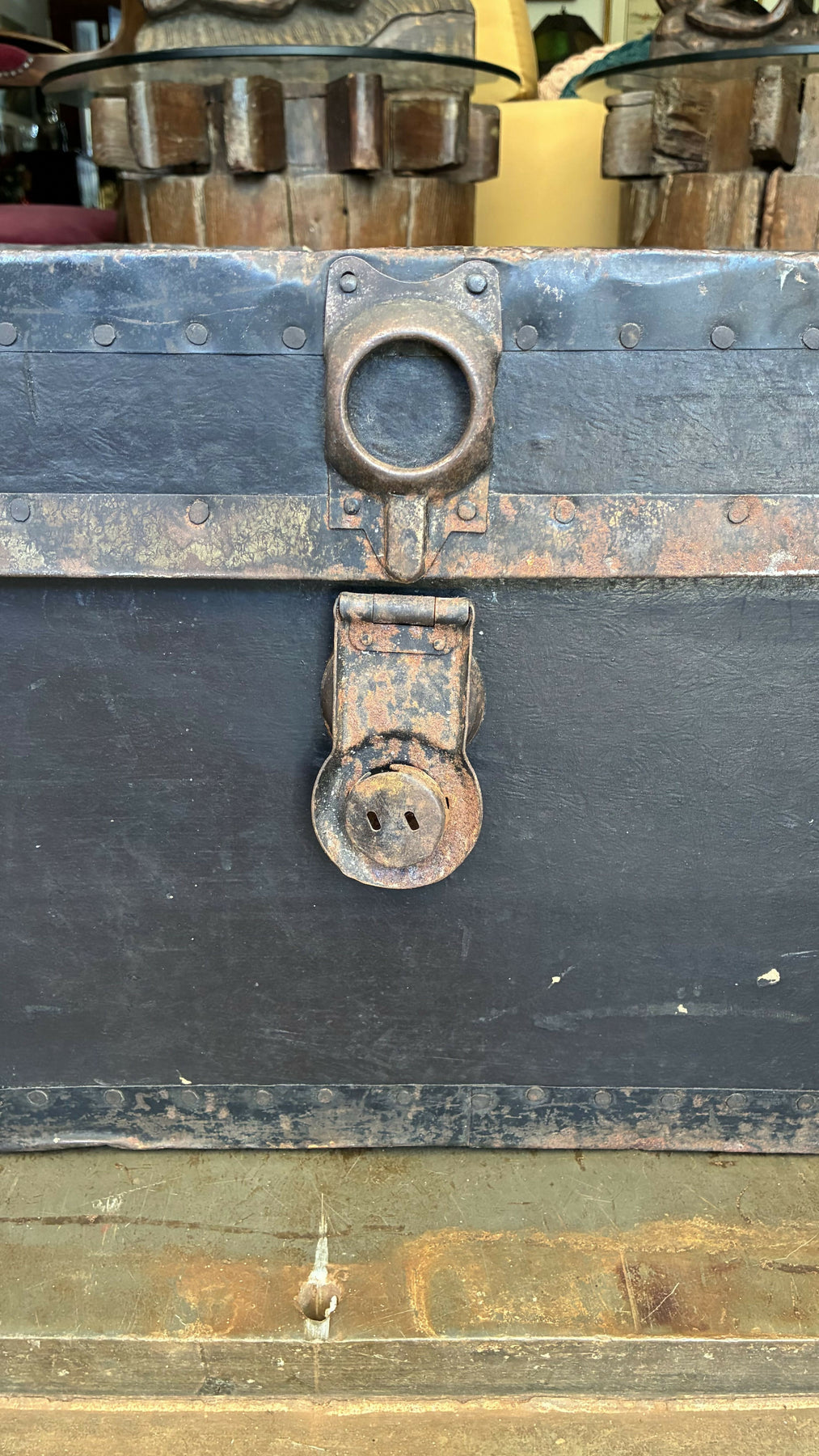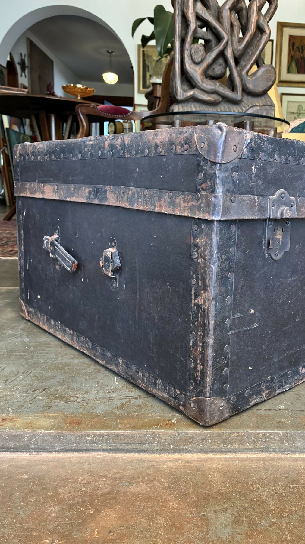 Baú antigo com ferragens em metal, peça original com marcas do tempo que valorizam seu caráter histórico. Possui estrutura firme, cantoneiras metálicas, travas frontais e alças laterais, mantendo o visual autêntico de época.