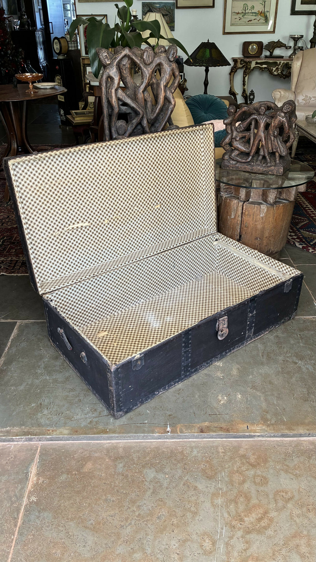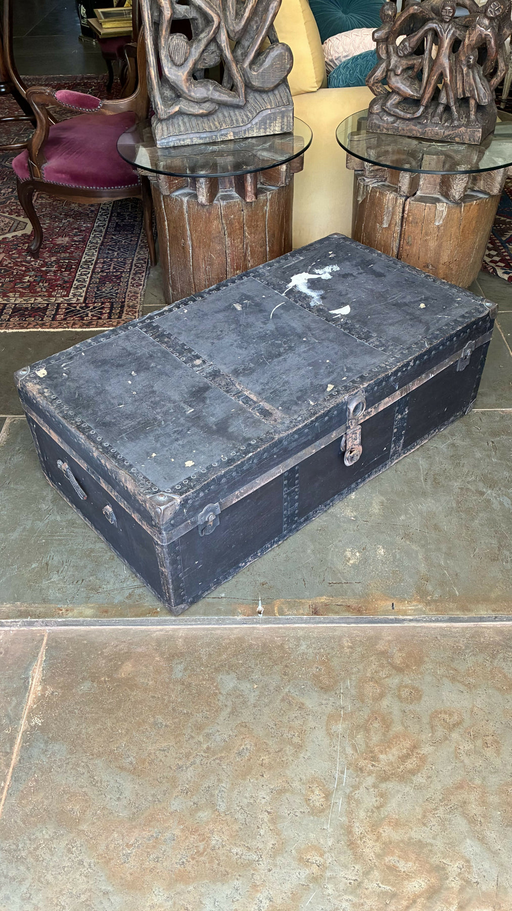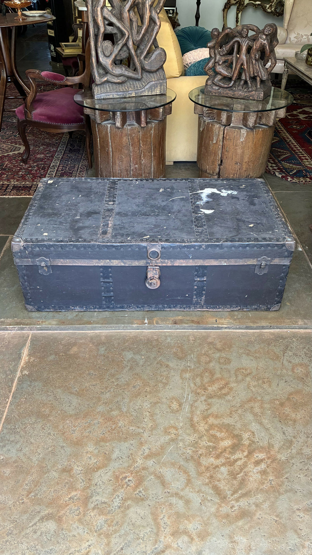 Baú antigo com ferragens em metal, peça original com marcas do tempo que valorizam seu caráter histórico. Possui estrutura firme, cantoneiras metálicas, travas frontais e alças laterais, mantendo o visual autêntico de época.
