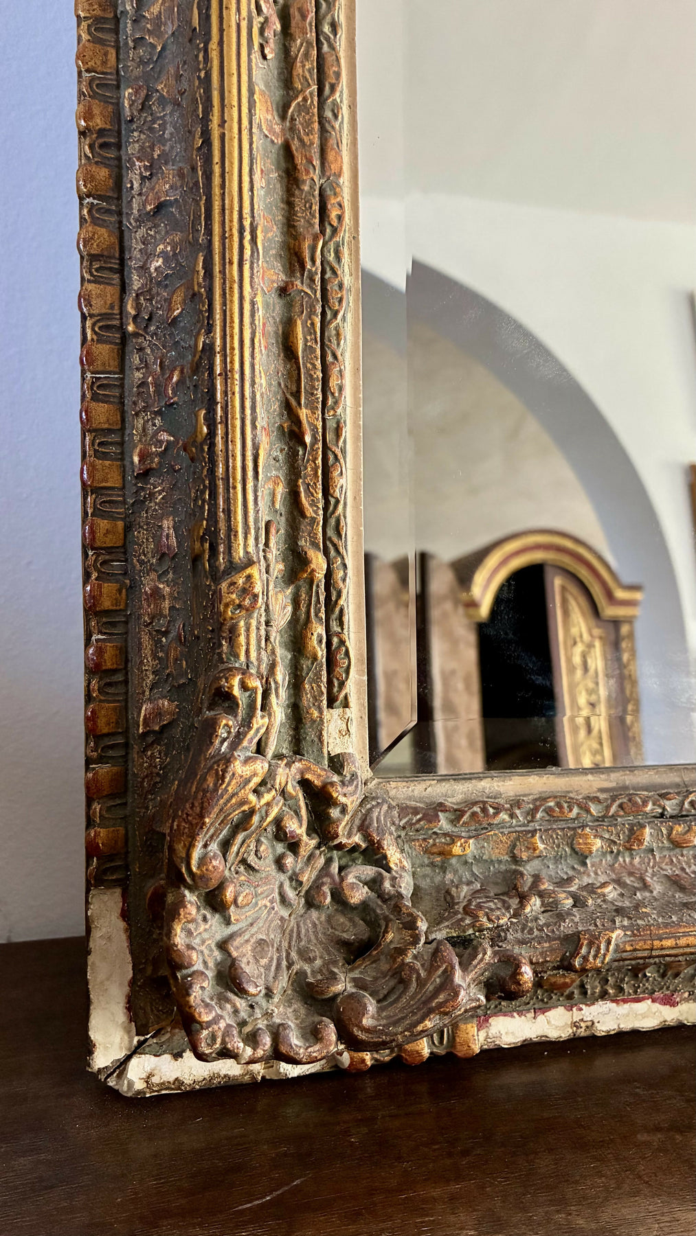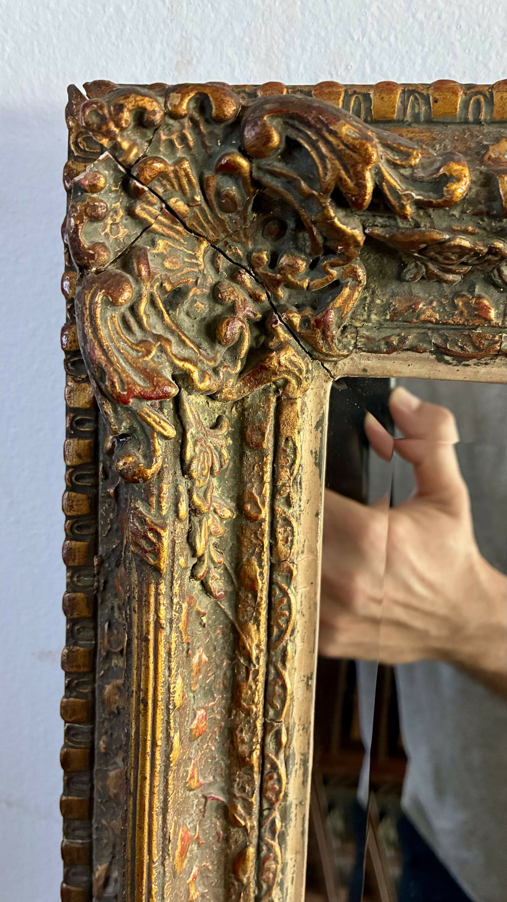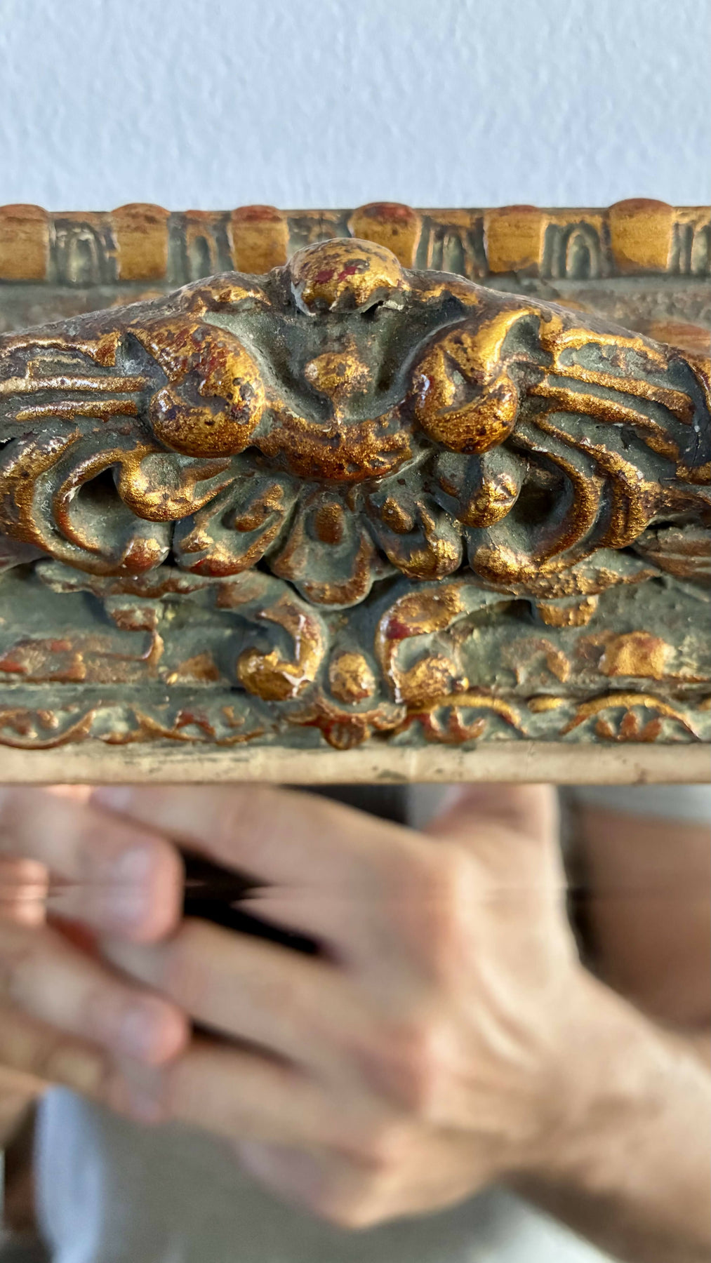 Moldura em madeira entalhada, acabamento dourado envelhecido e detalhes riquíssimos em relevo.