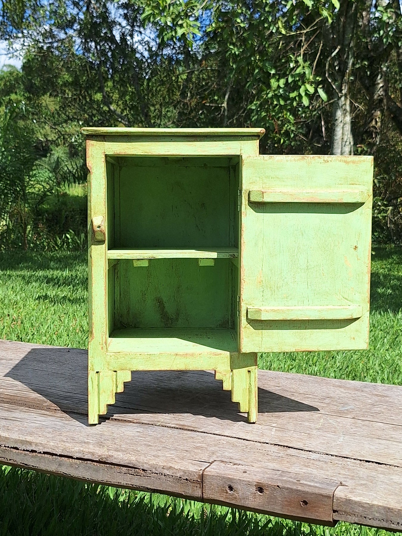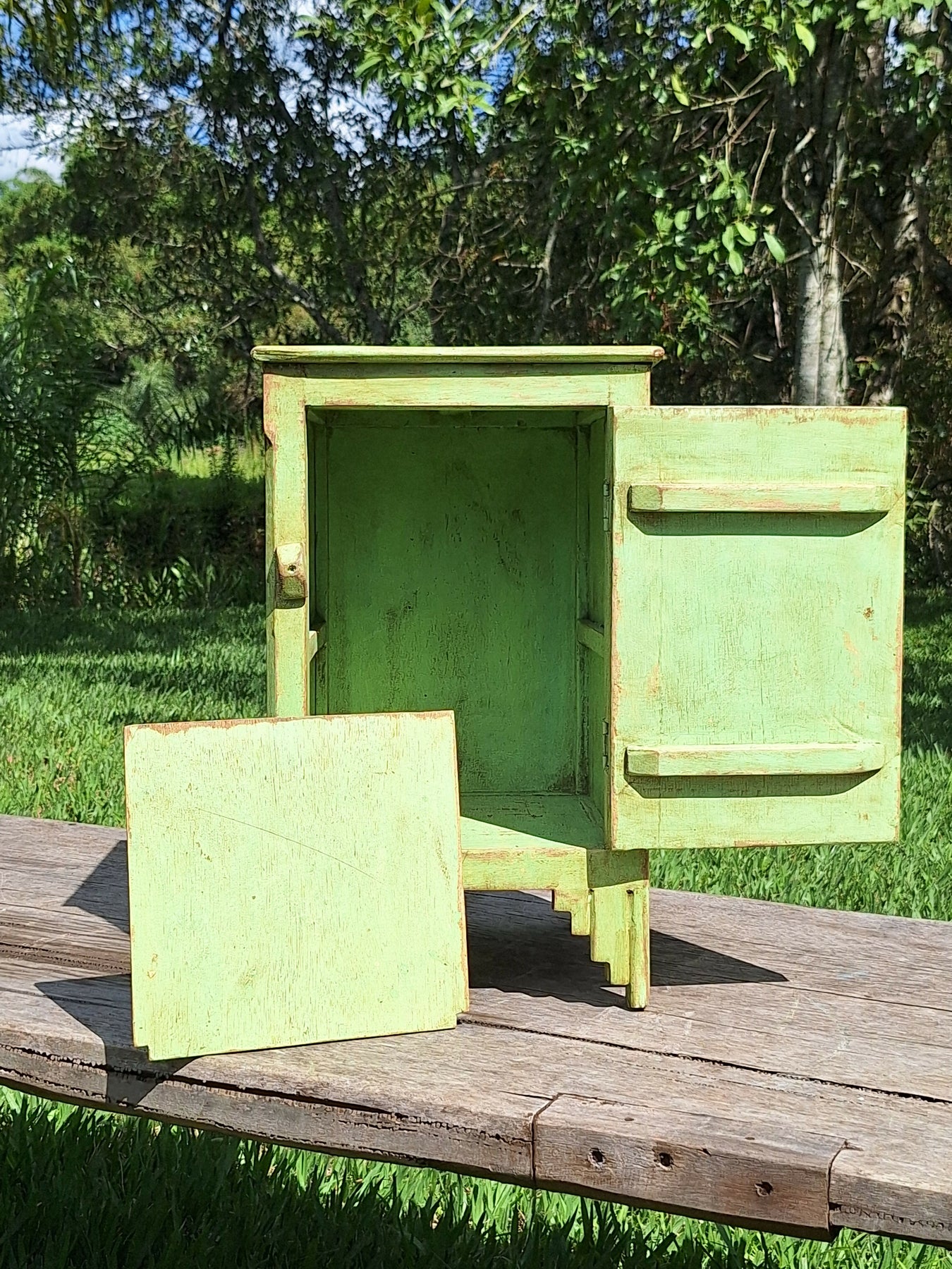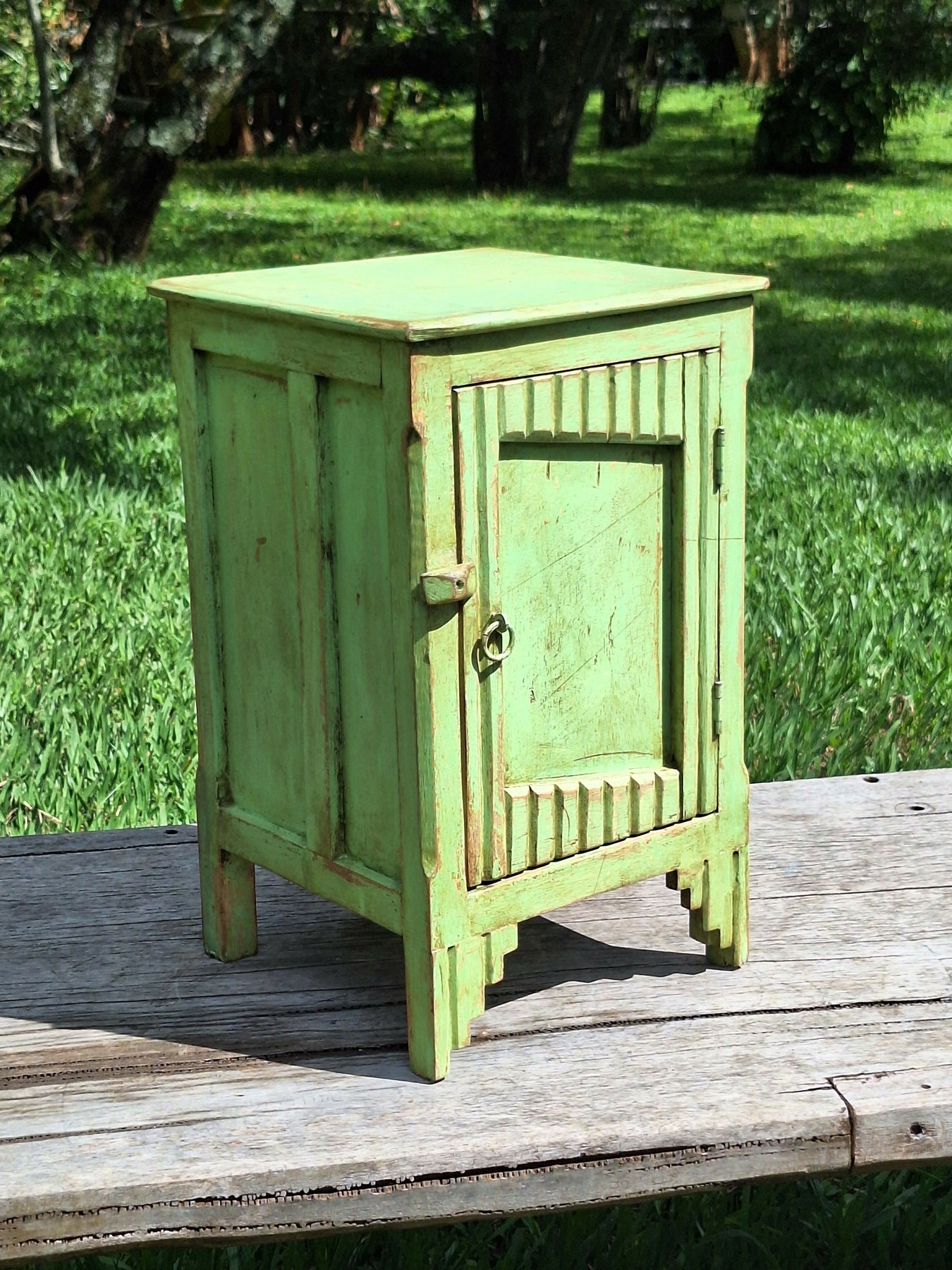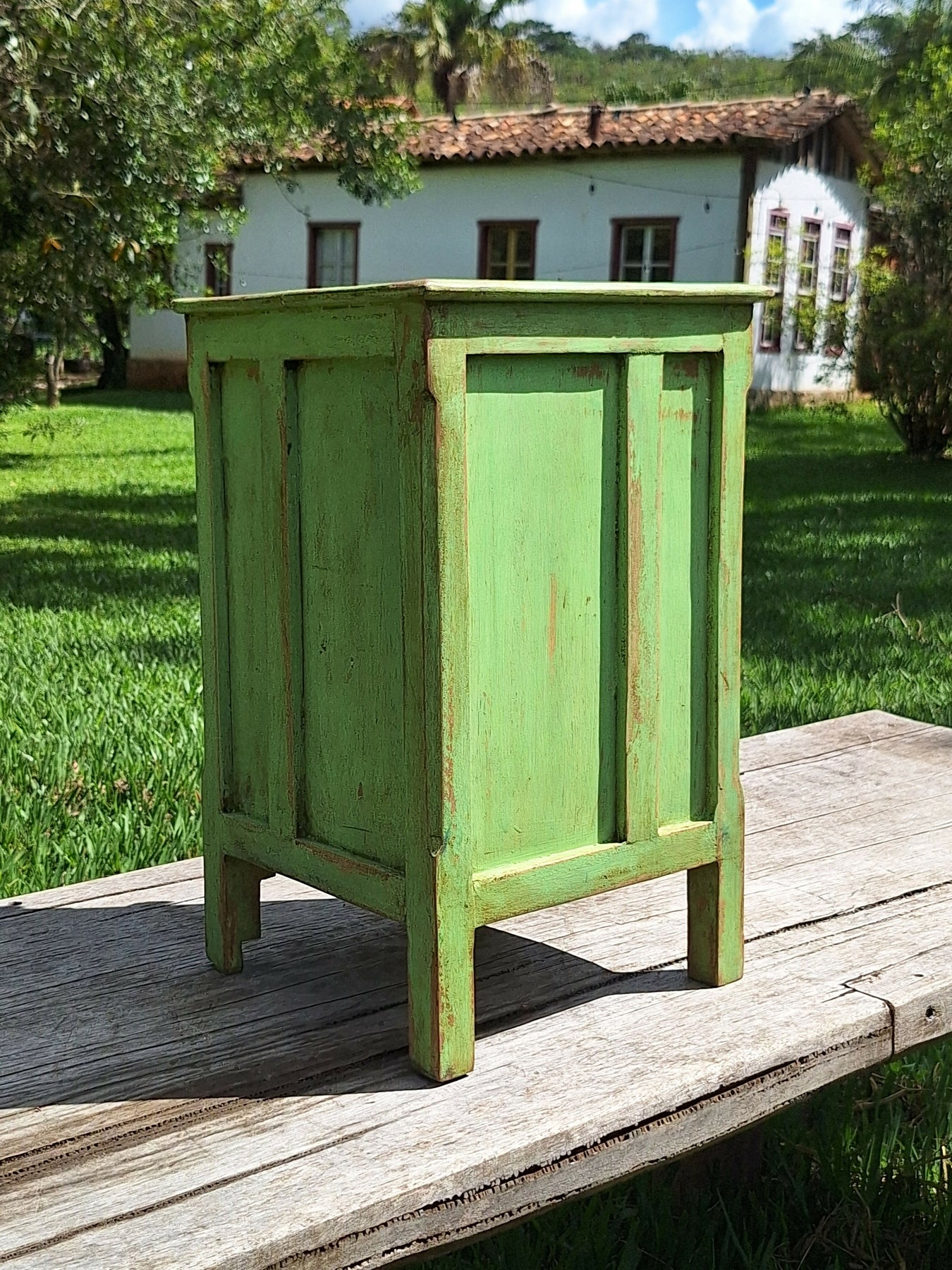 Mesinha de Cabeceira / Armarinho Tinta Gasta Verde Água Madeira Maciça Garimpo Mineiro