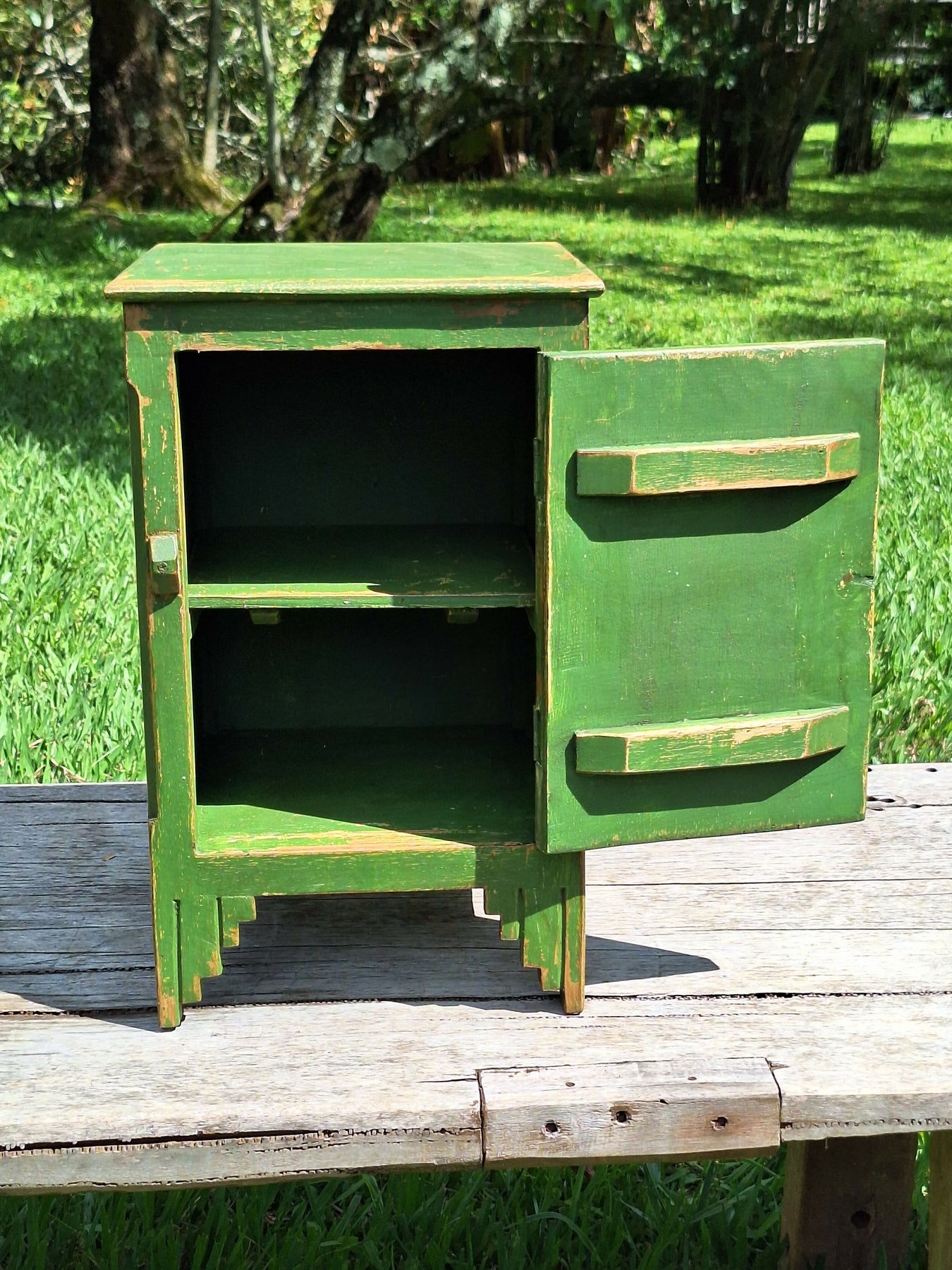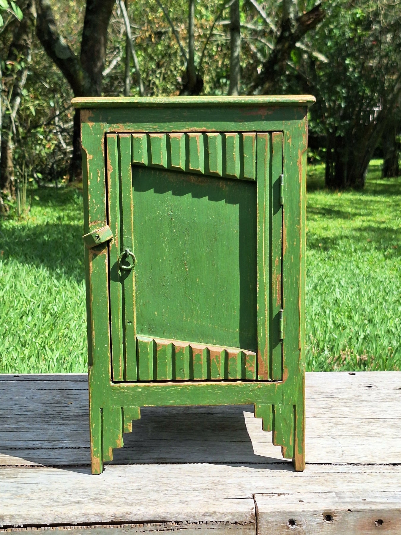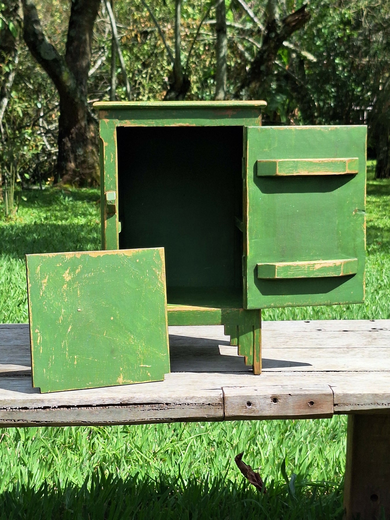 Mesinha de Cabeceira / Armarinho Tinta Gasta Verde Madeira Maciça Garimpo Mineiro