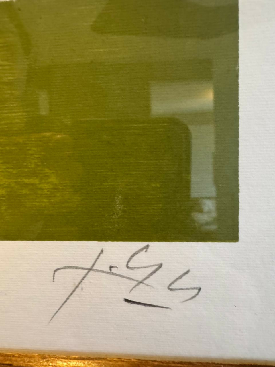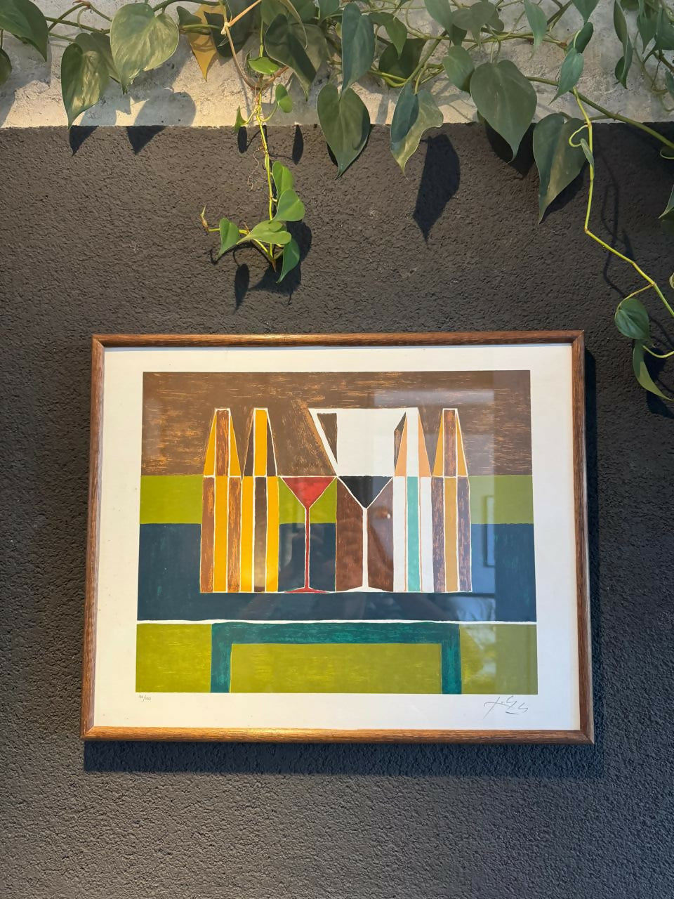 Serigrafia numerada, enquadrada em moldura de madeira e vidro.