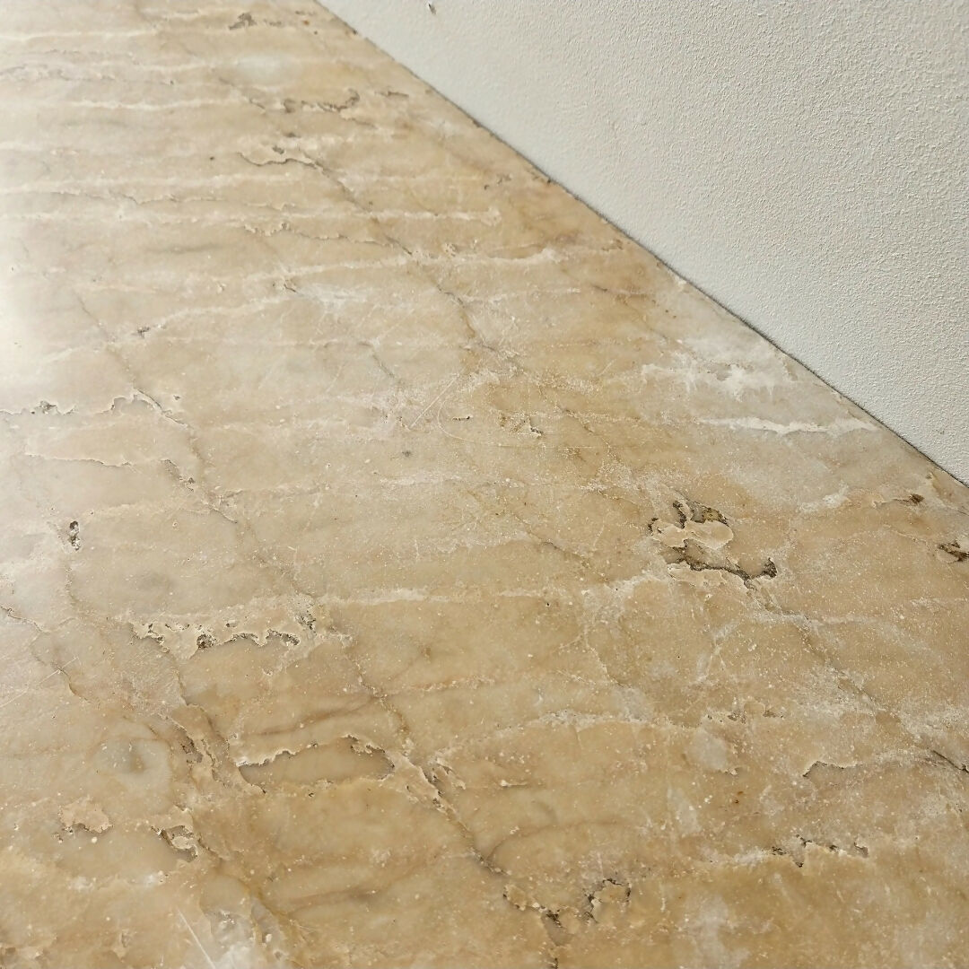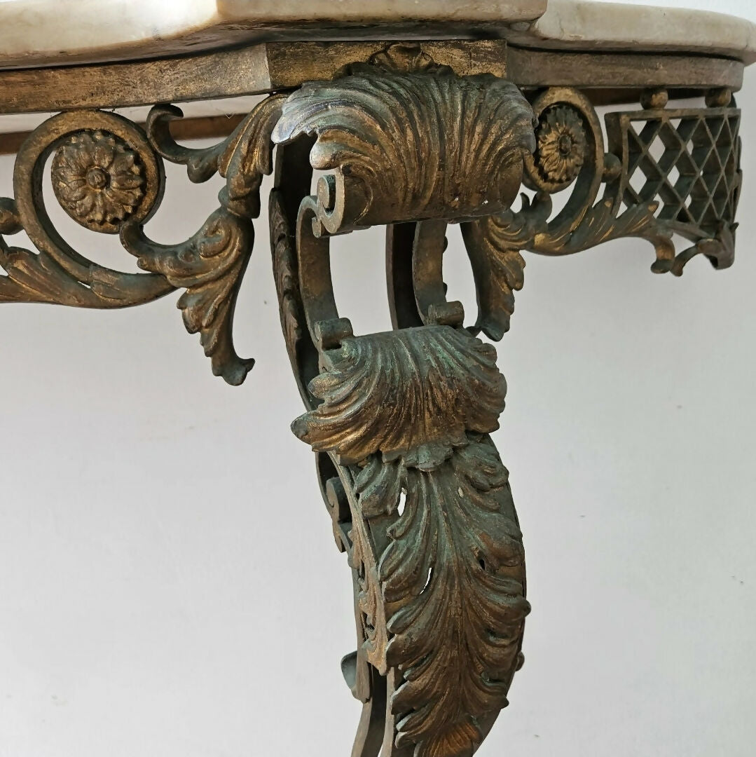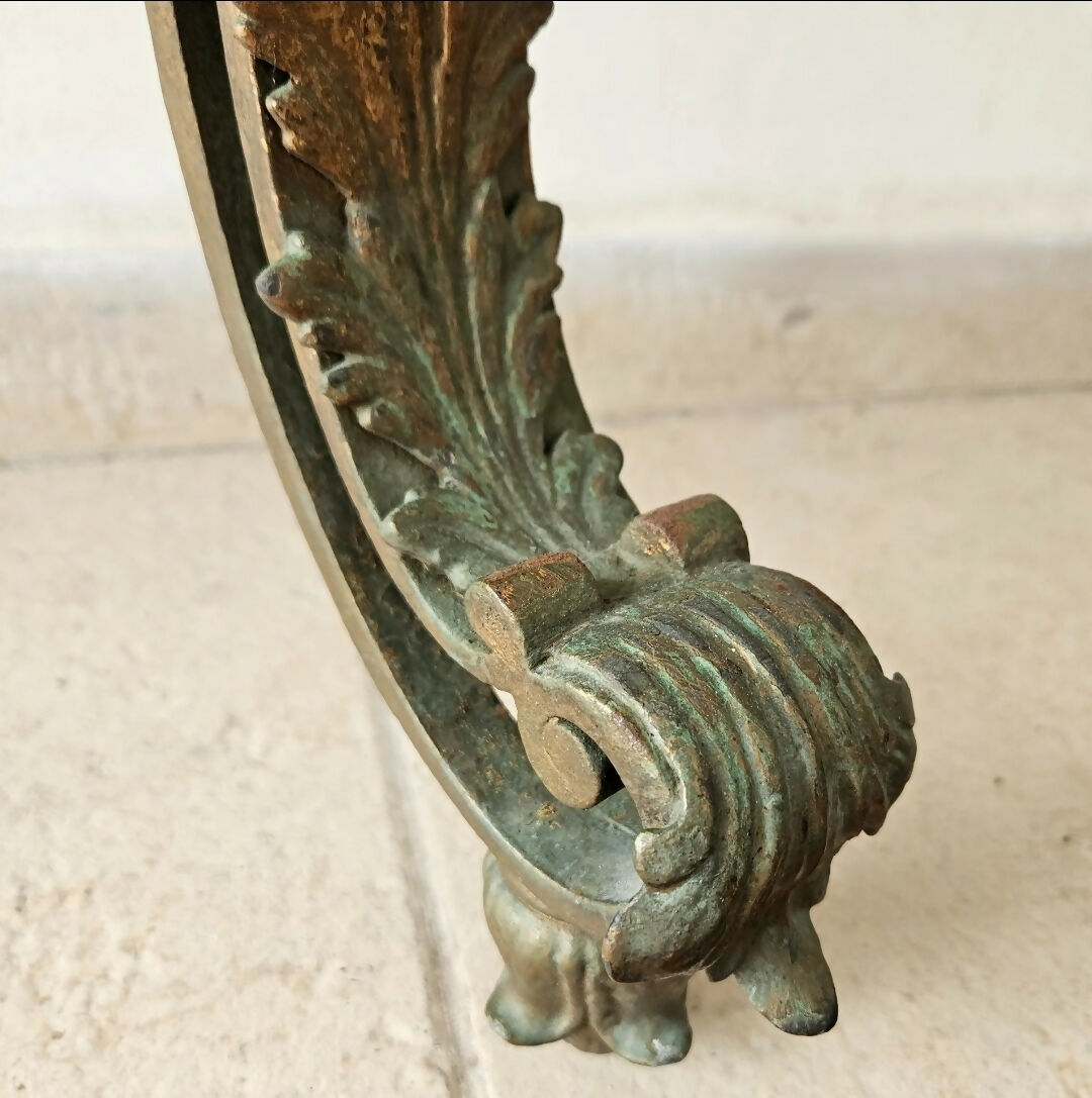 Produzido inteiramente em Fér Forge patinado à ouro, com tampo de mármore travertino, que acompanha as formas orgânicas do aparador.