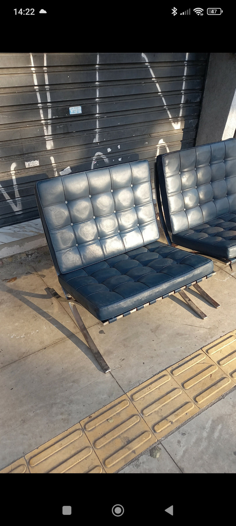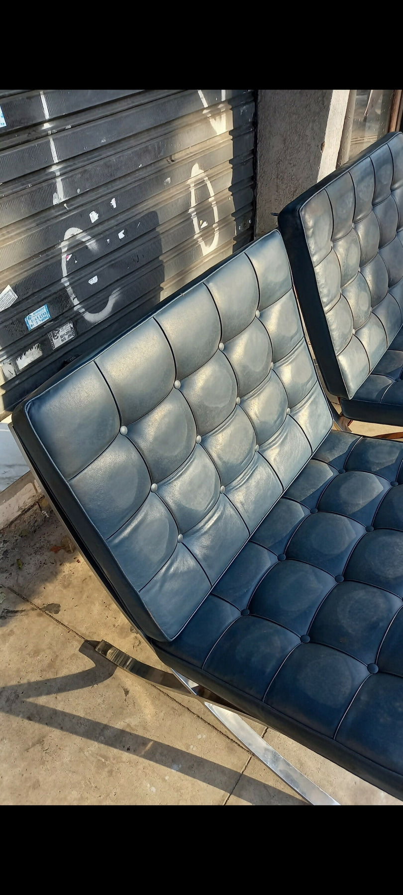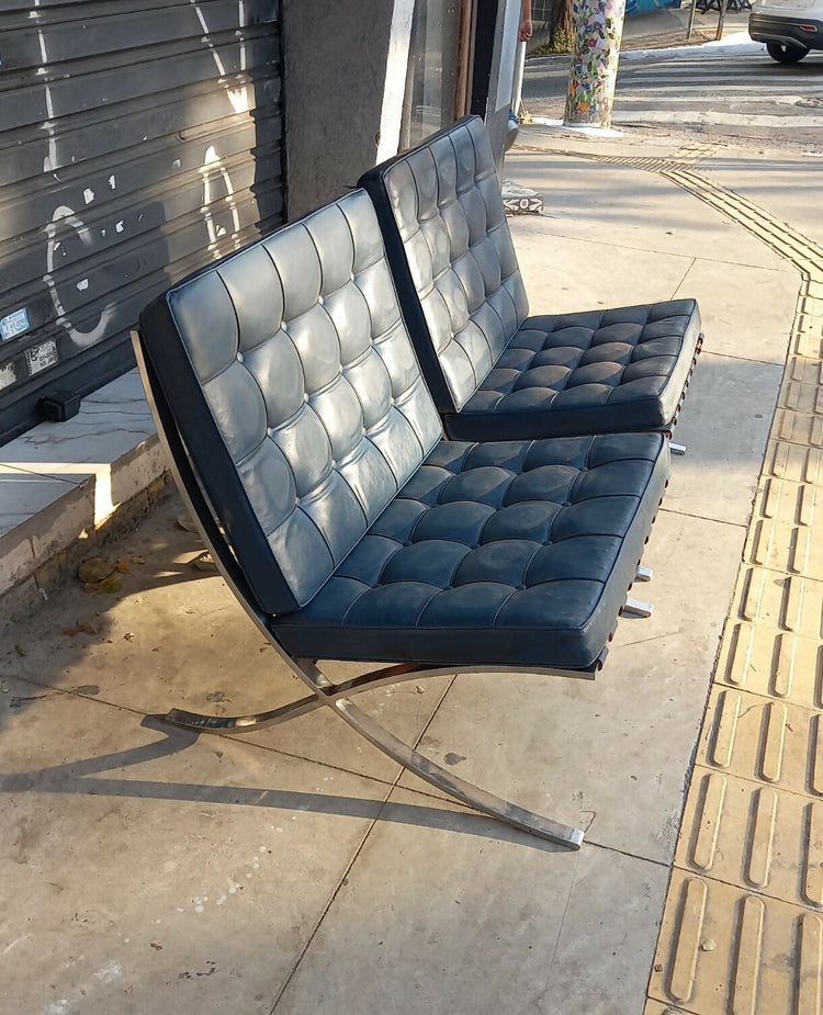 Par de Poltronas Barcelona antigas com estrutura em metal cromado (são bem pesadas) e estofado original azul com capitonê em ótimo estado de conservação, design Mies Van der Rohe, medindo 79 de altura, 75 de largura e 75 de profundidade - R$ 8.000,00 no estado - PEÇAS À PRONTA ENTREGA.