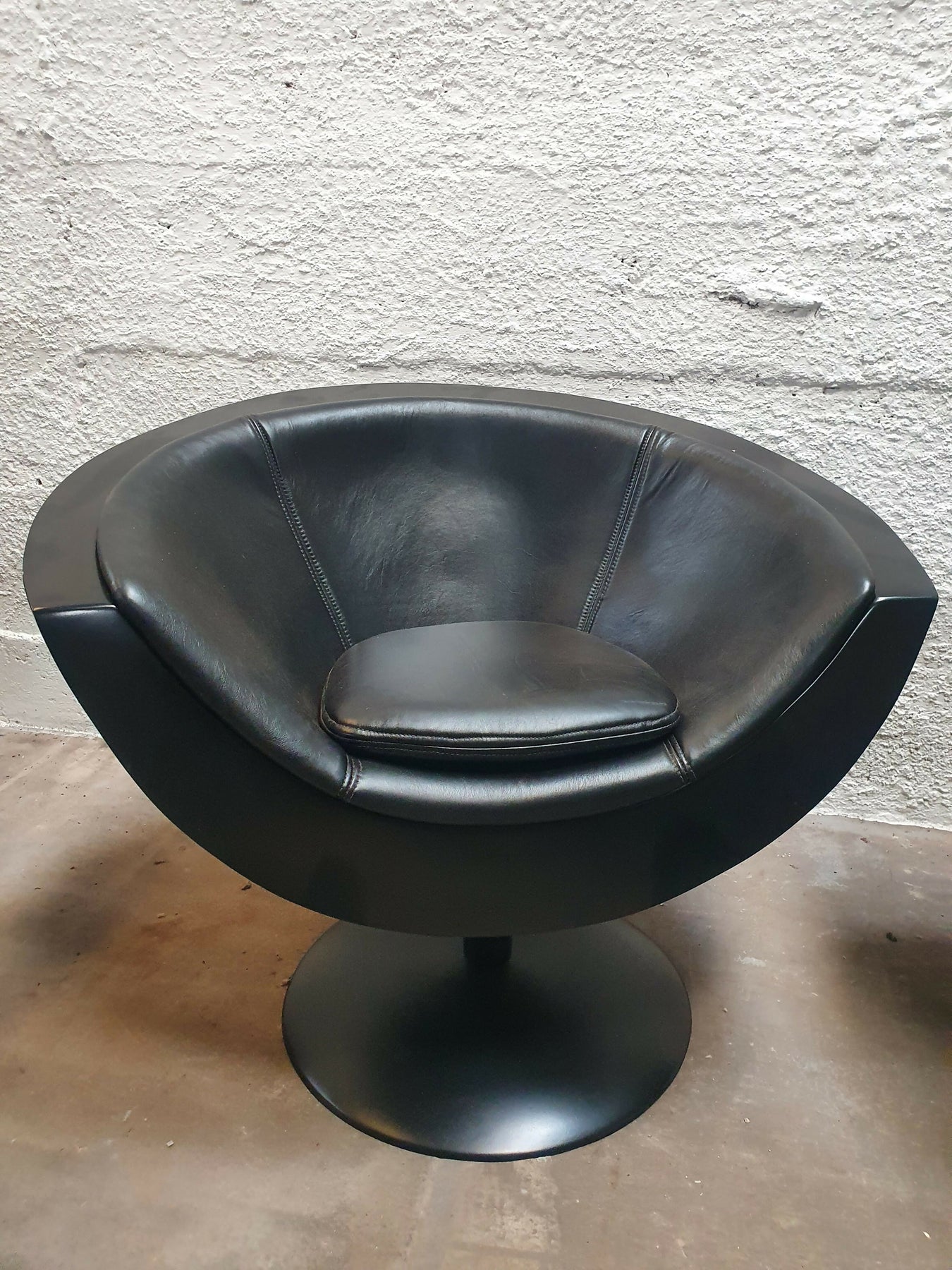 Confortável e giratório  par de poltronas concha em fibra de vidro, estrutura em base de ferro preto fosco, estofado novo de couro. Restauradas, pronta pra uso