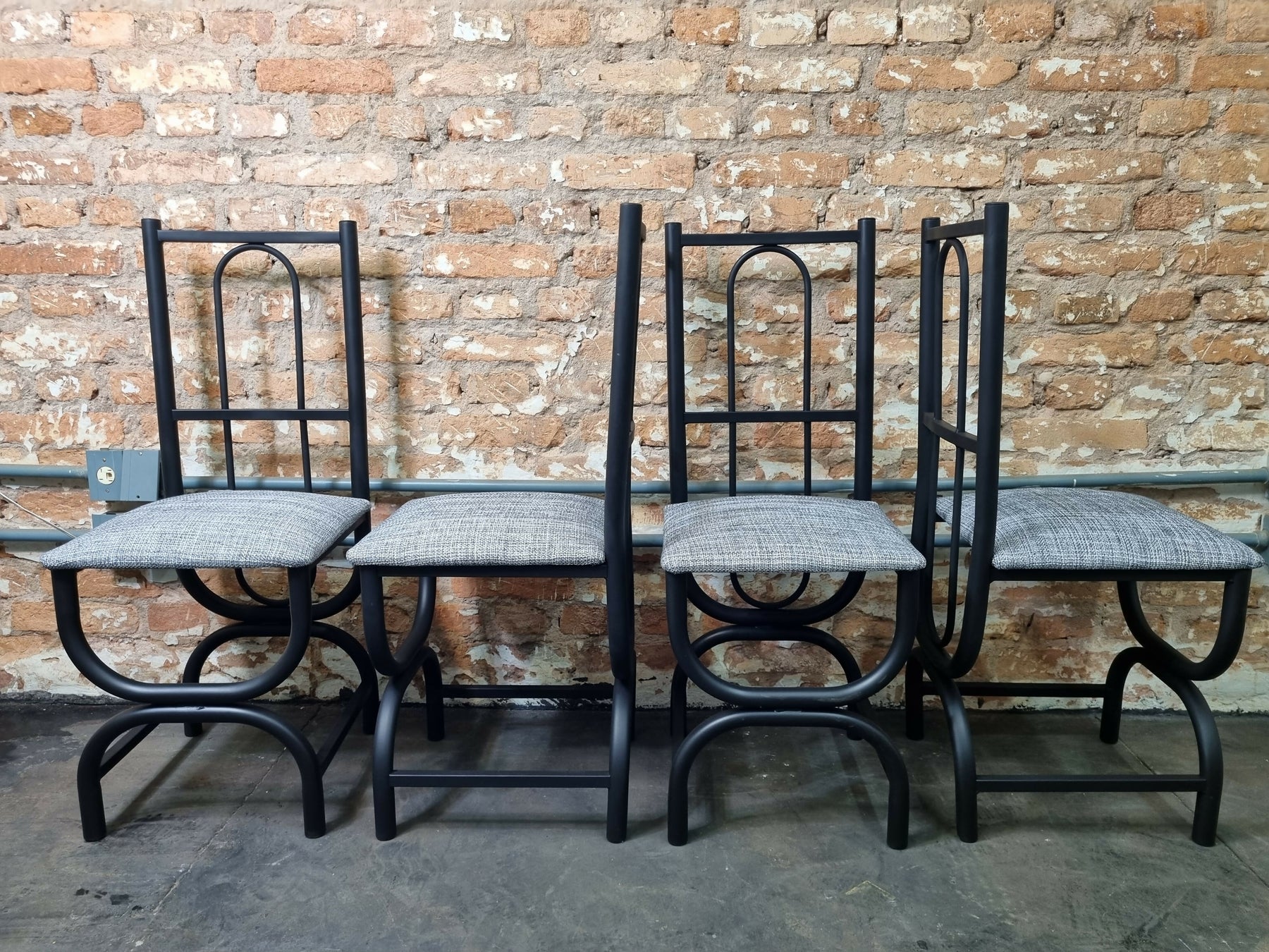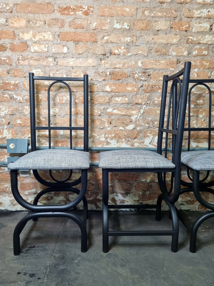 Belo e esculturais cadeiras de jantar vintage, ao estilo art Déco com estrutura em ferro tubular, estofado novo. Restauradas, prontas para uso.