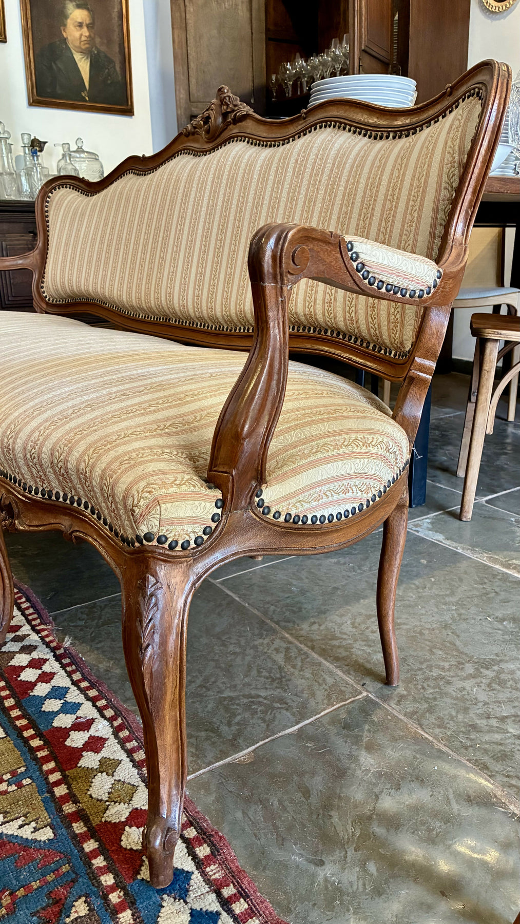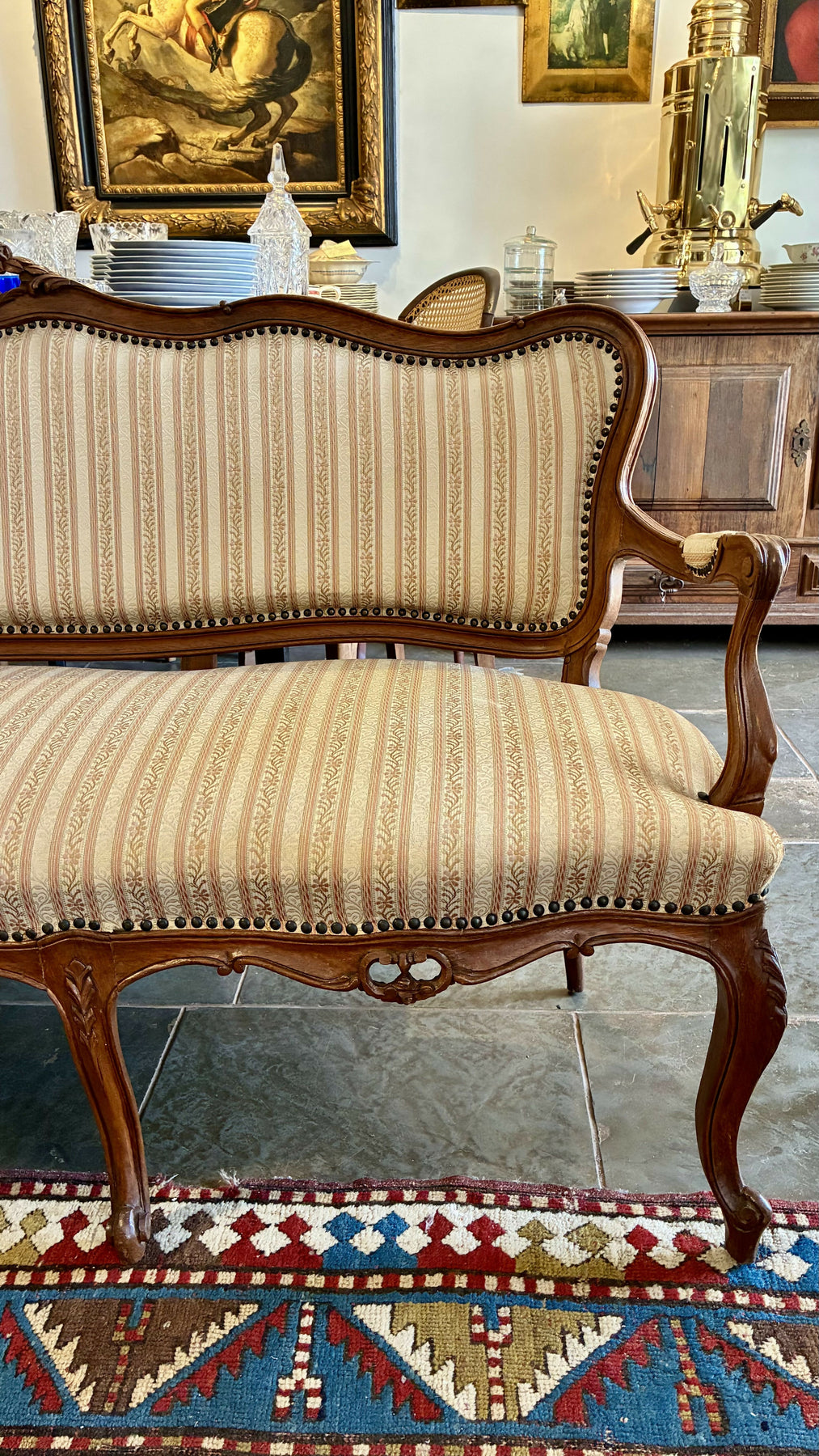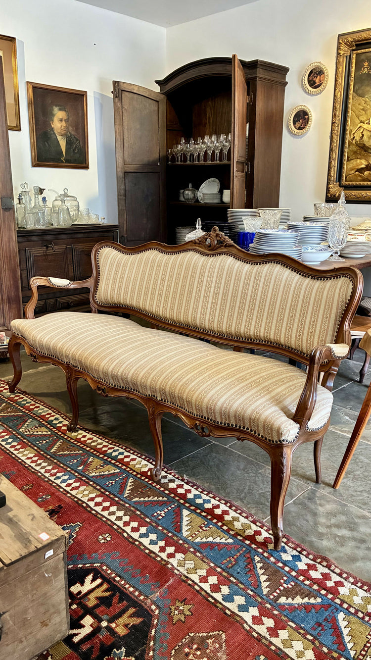 Sofá antigo em estilo Luís XV, com estrutura em madeira entalhada e ricamente detalhada.