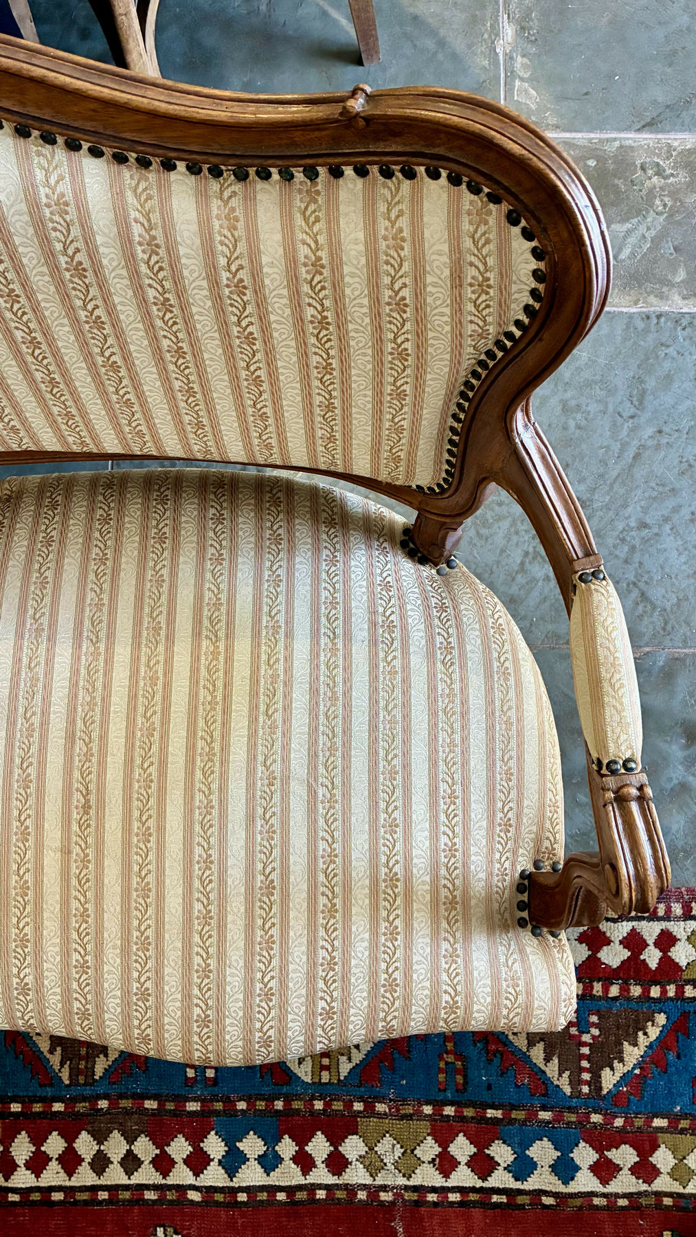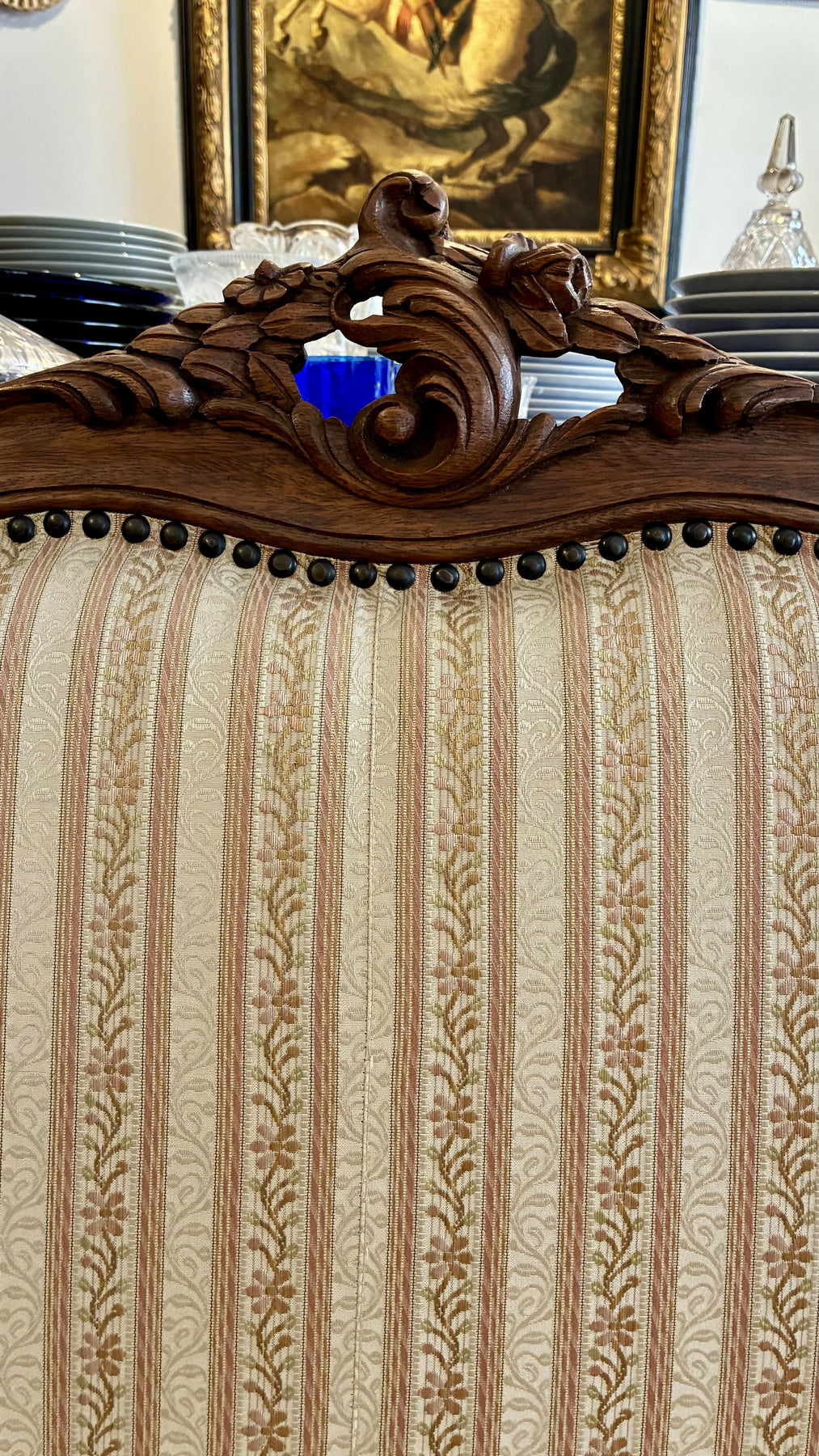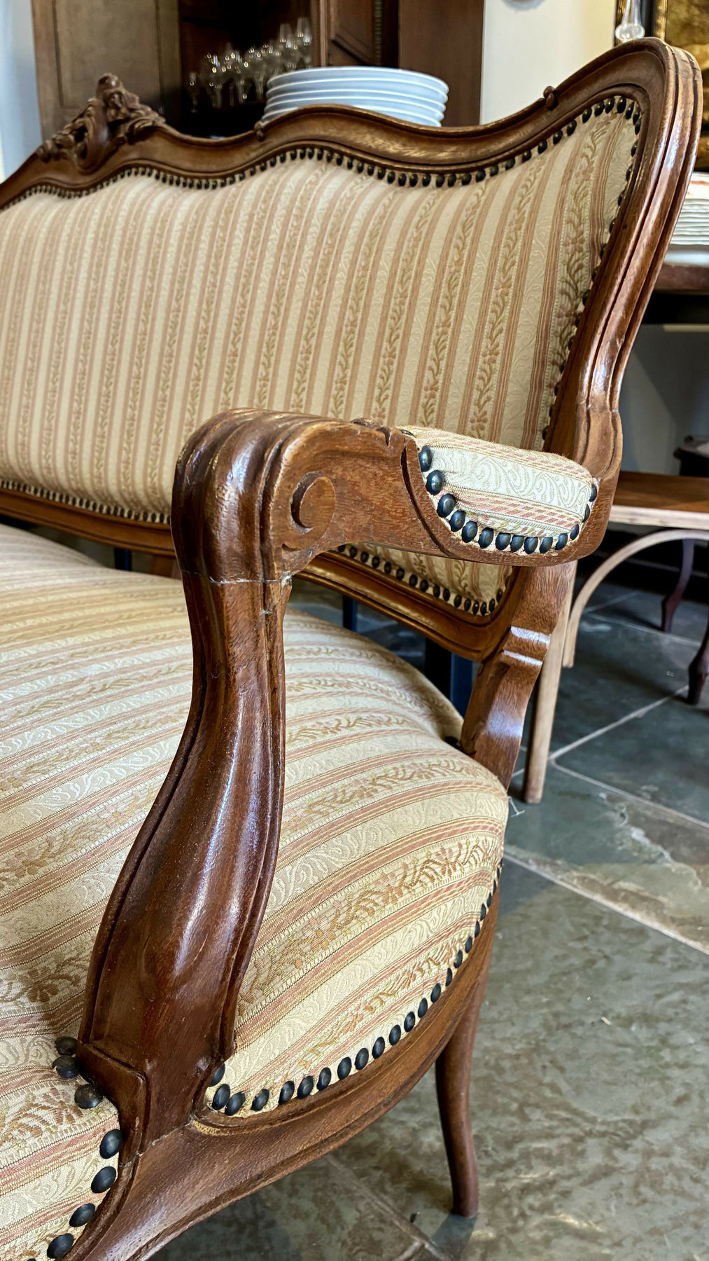 Sofá antigo em estilo Luís XV, com estrutura em madeira entalhada e ricamente detalhada.