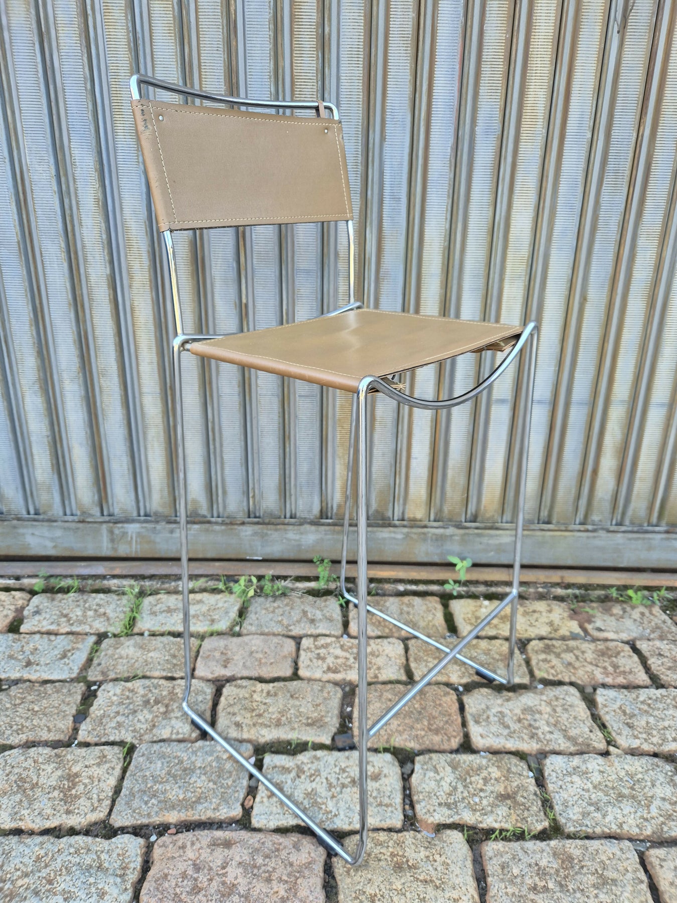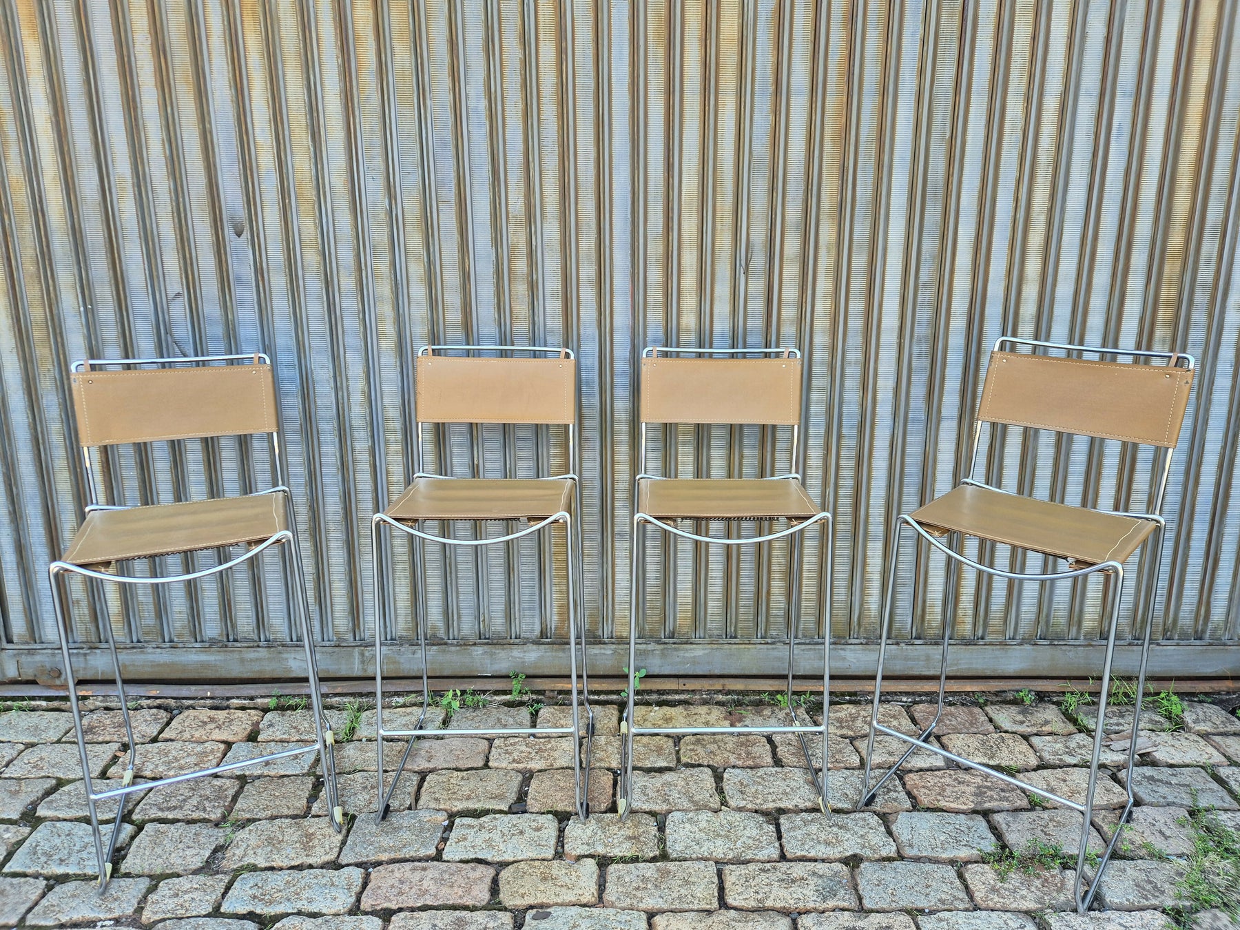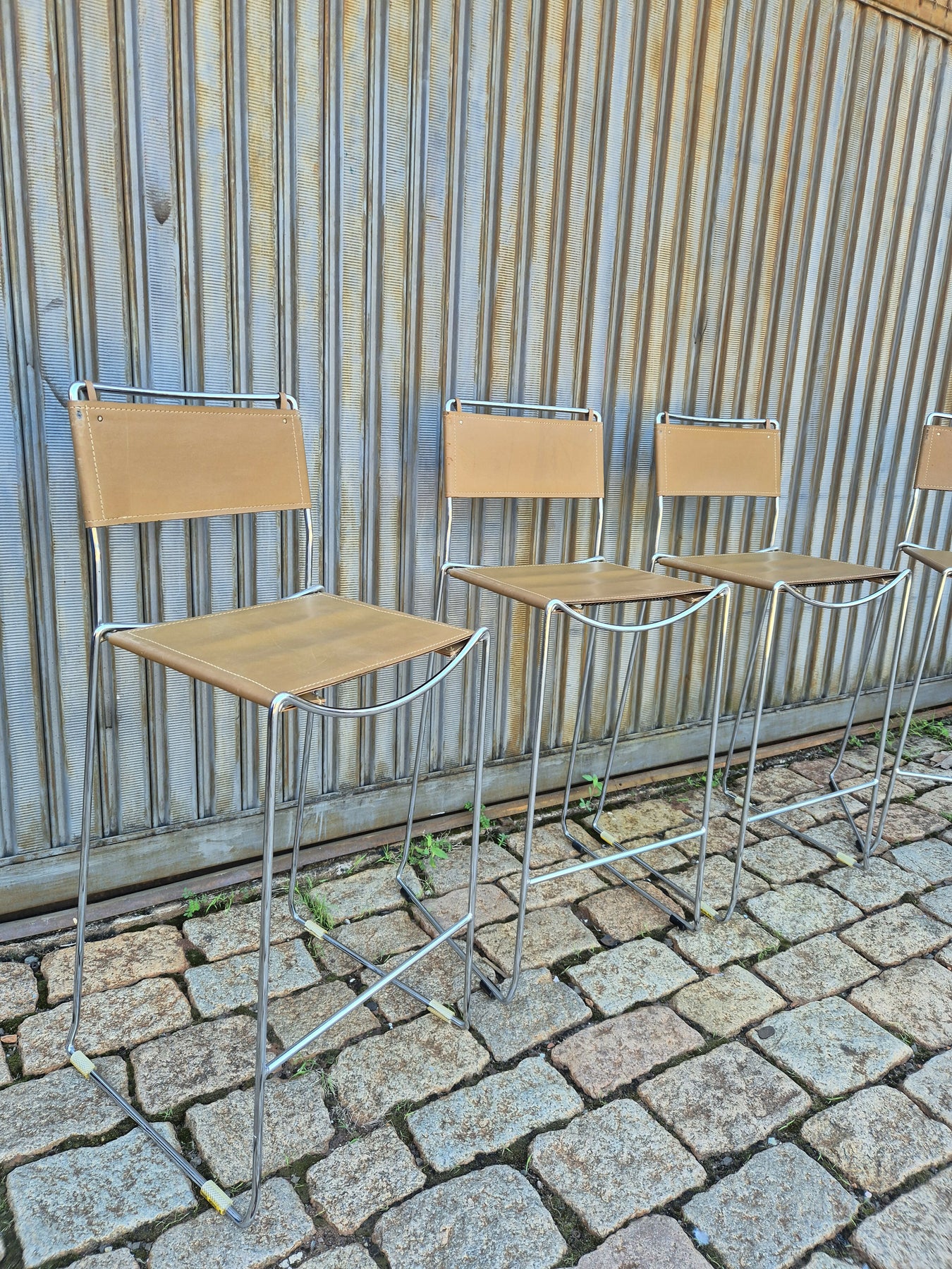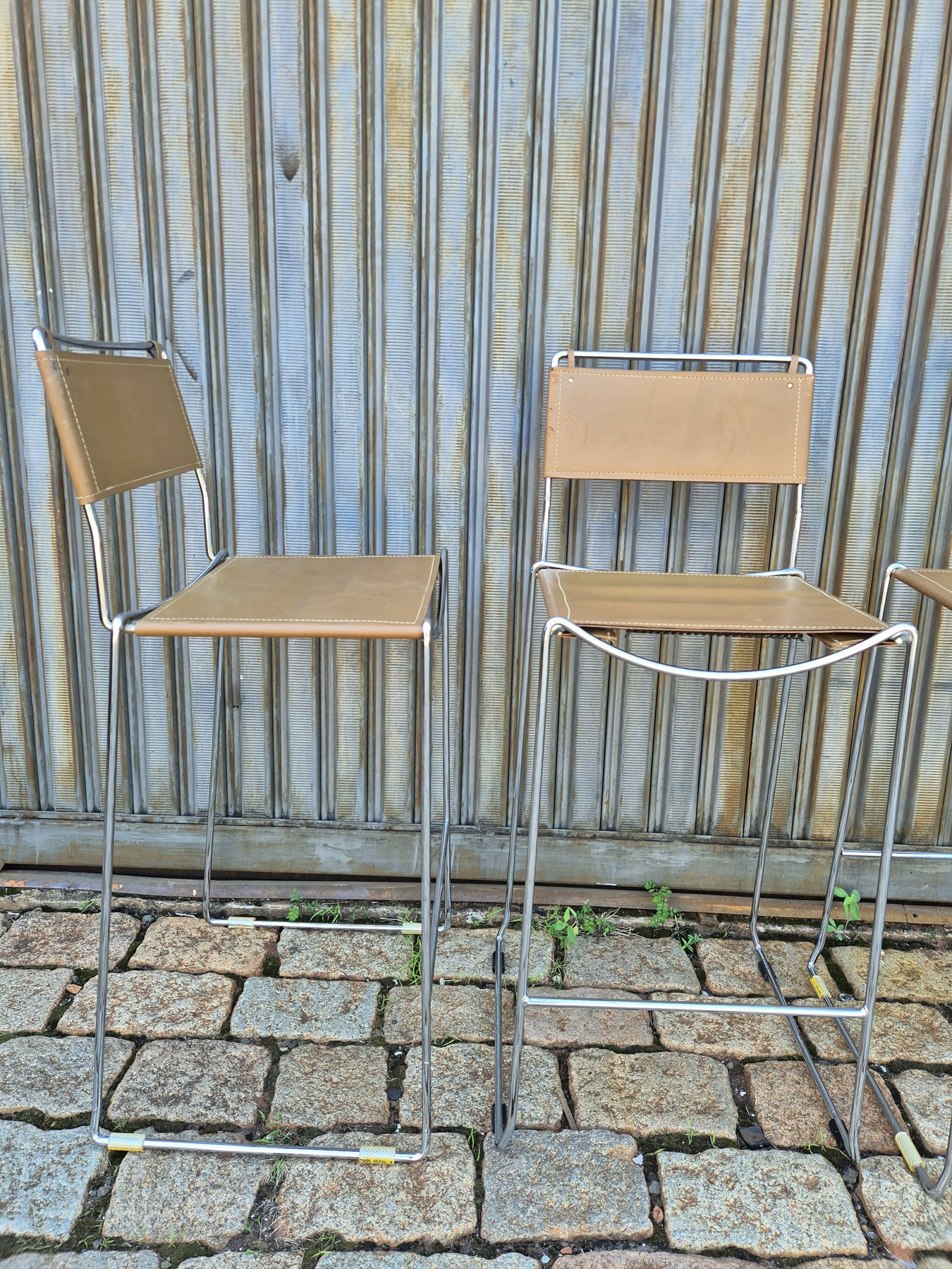 Eles são feitos de armações de prata cromada e assentos e encostos grossos de couro legítimo marrom, raridade no Brasil. Possui marcas do tempo, mas muito bem conservadas.