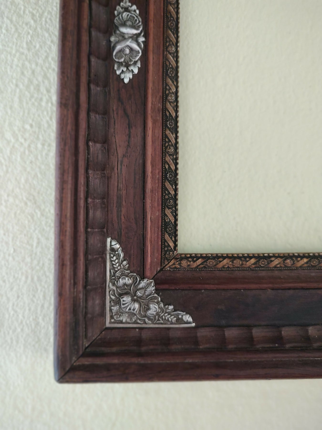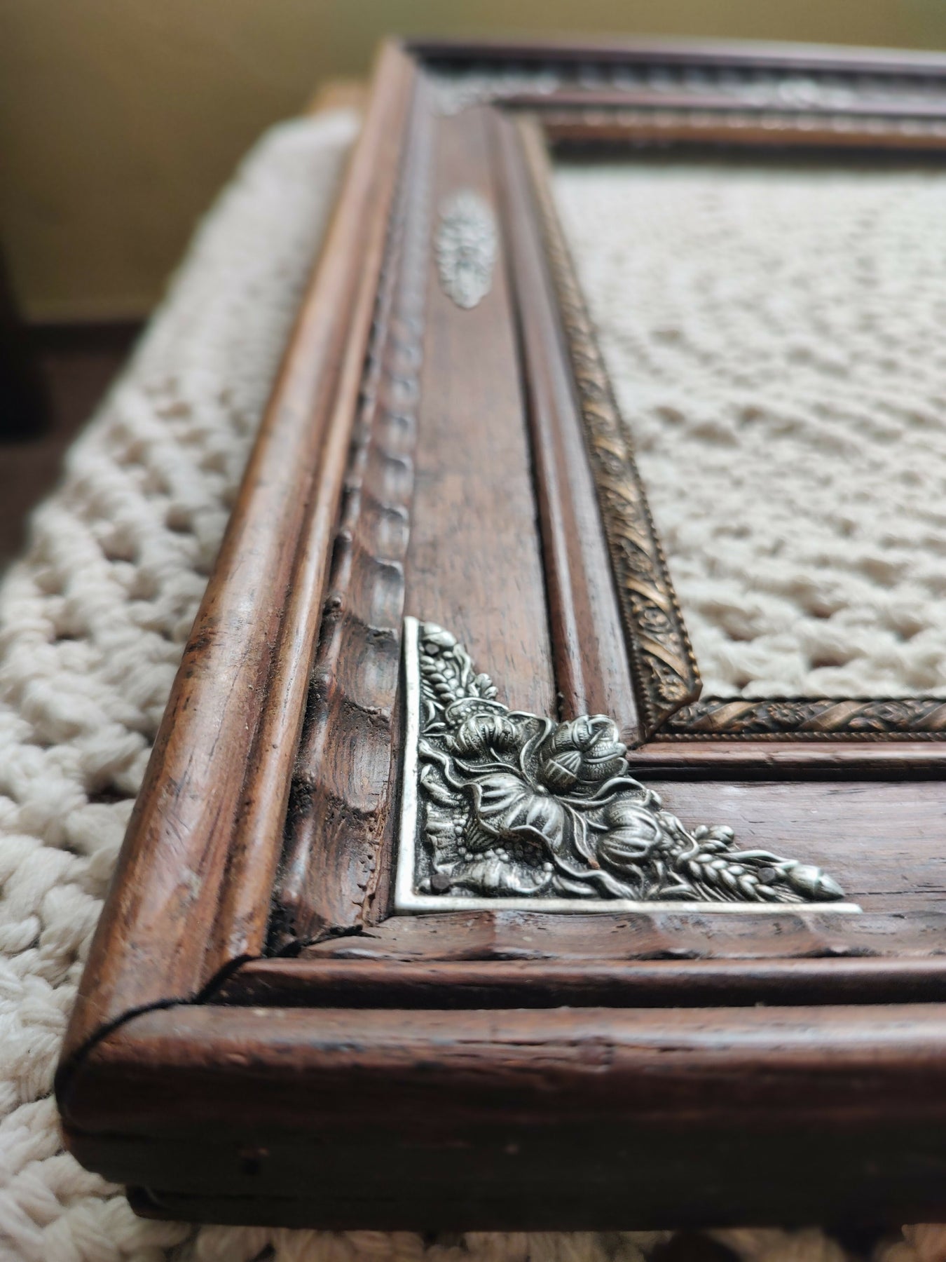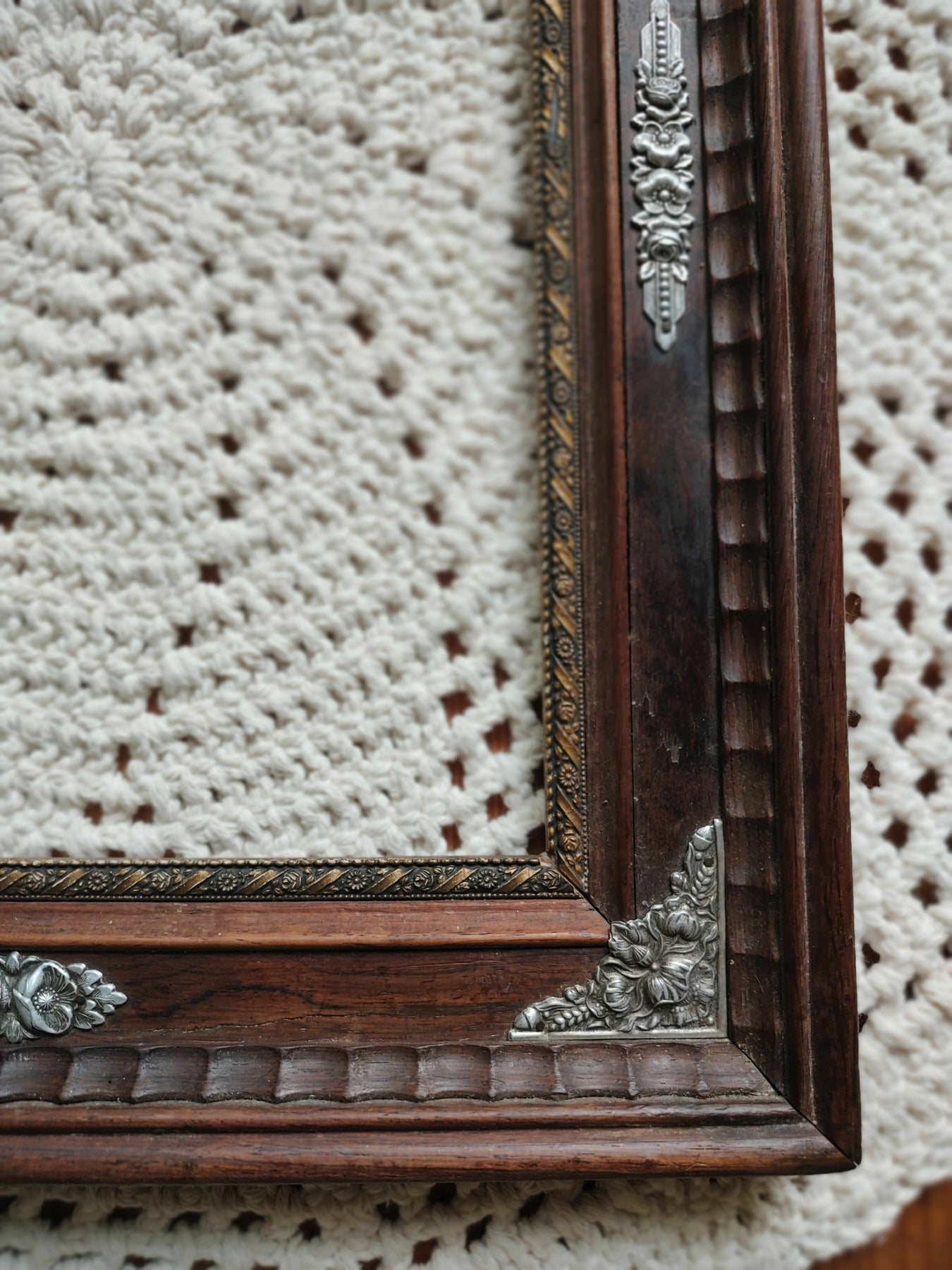 Antiga e Maravilhosa Moldura em Jacarandá Maciço com adornos florais em metal (46cm x 36cm)