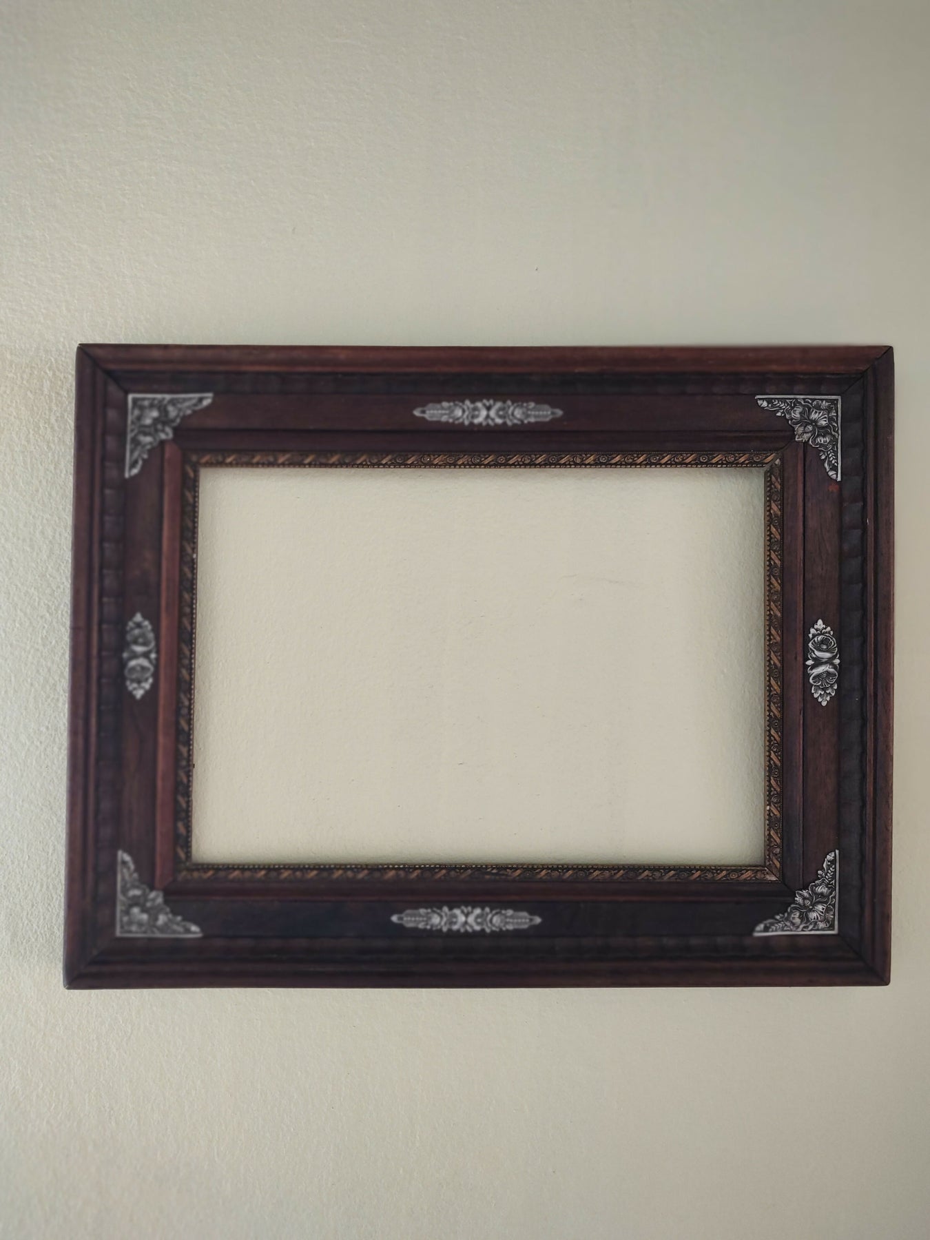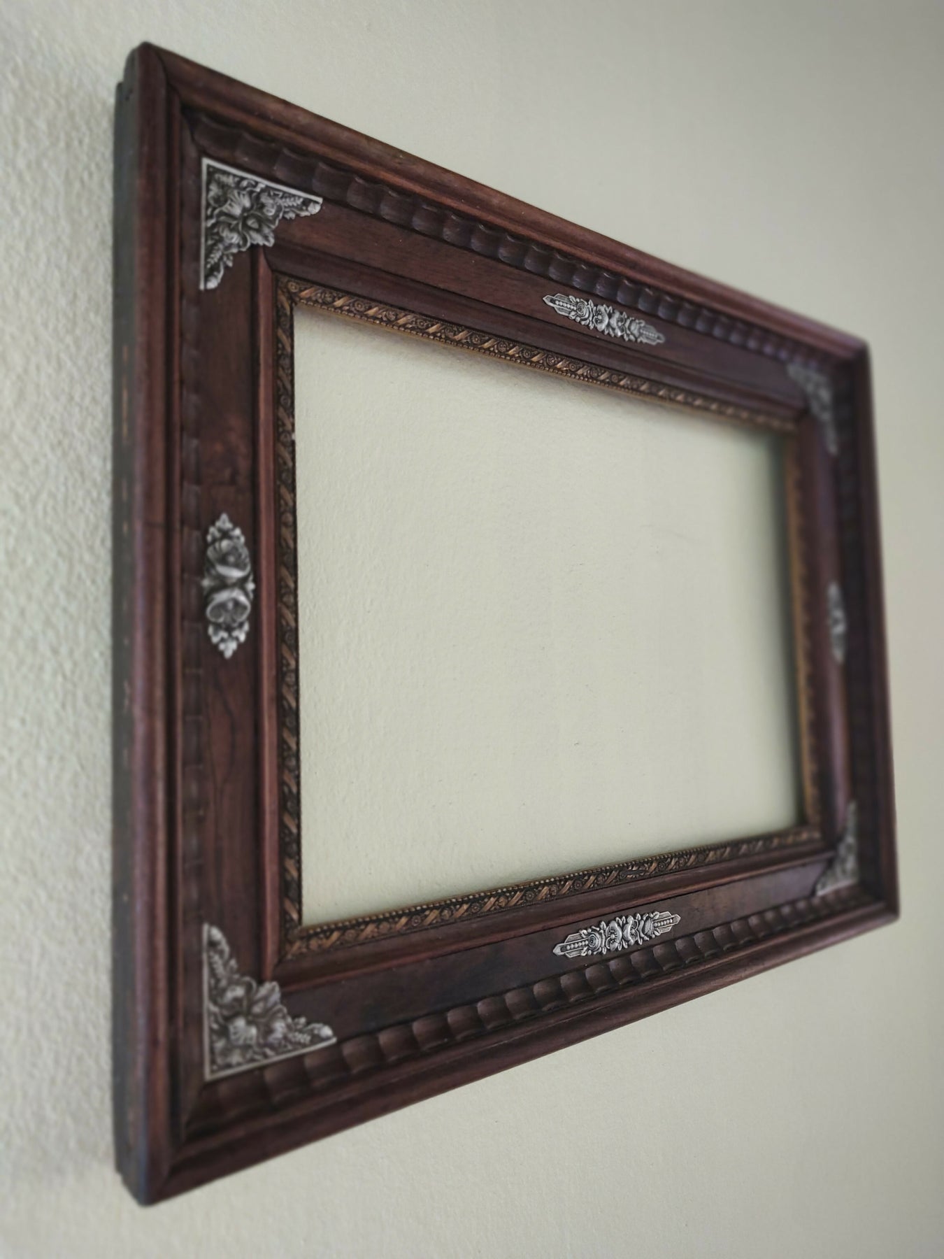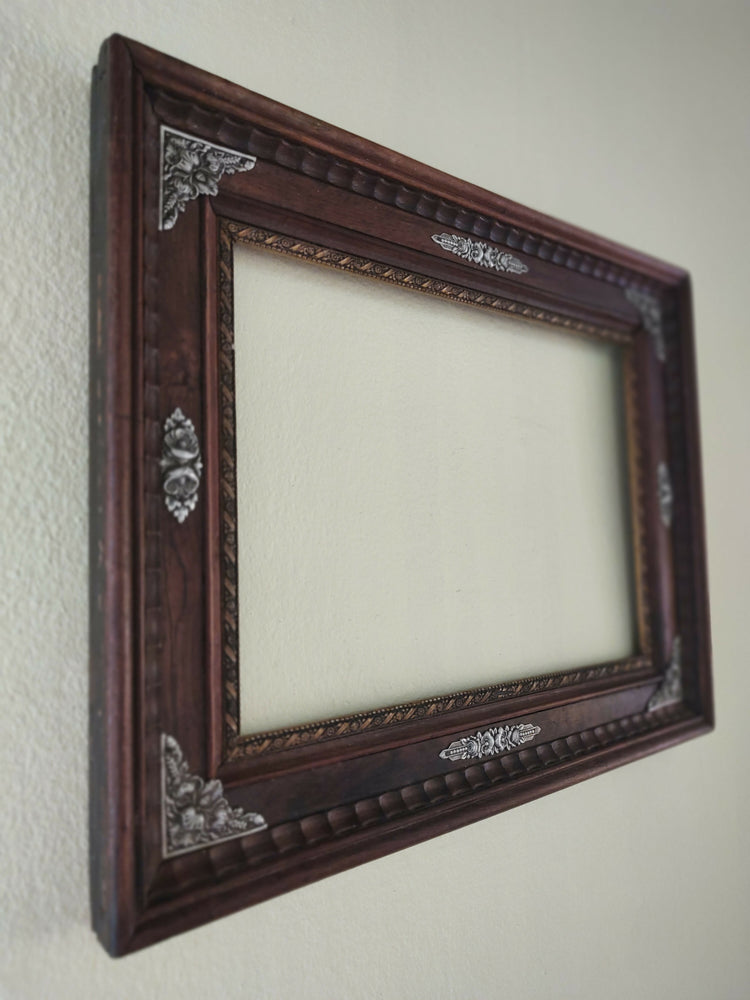 Antiga e Maravilhosa Moldura em Jacarandá Maciço com adornos florais em metal (46cm x 36cm)