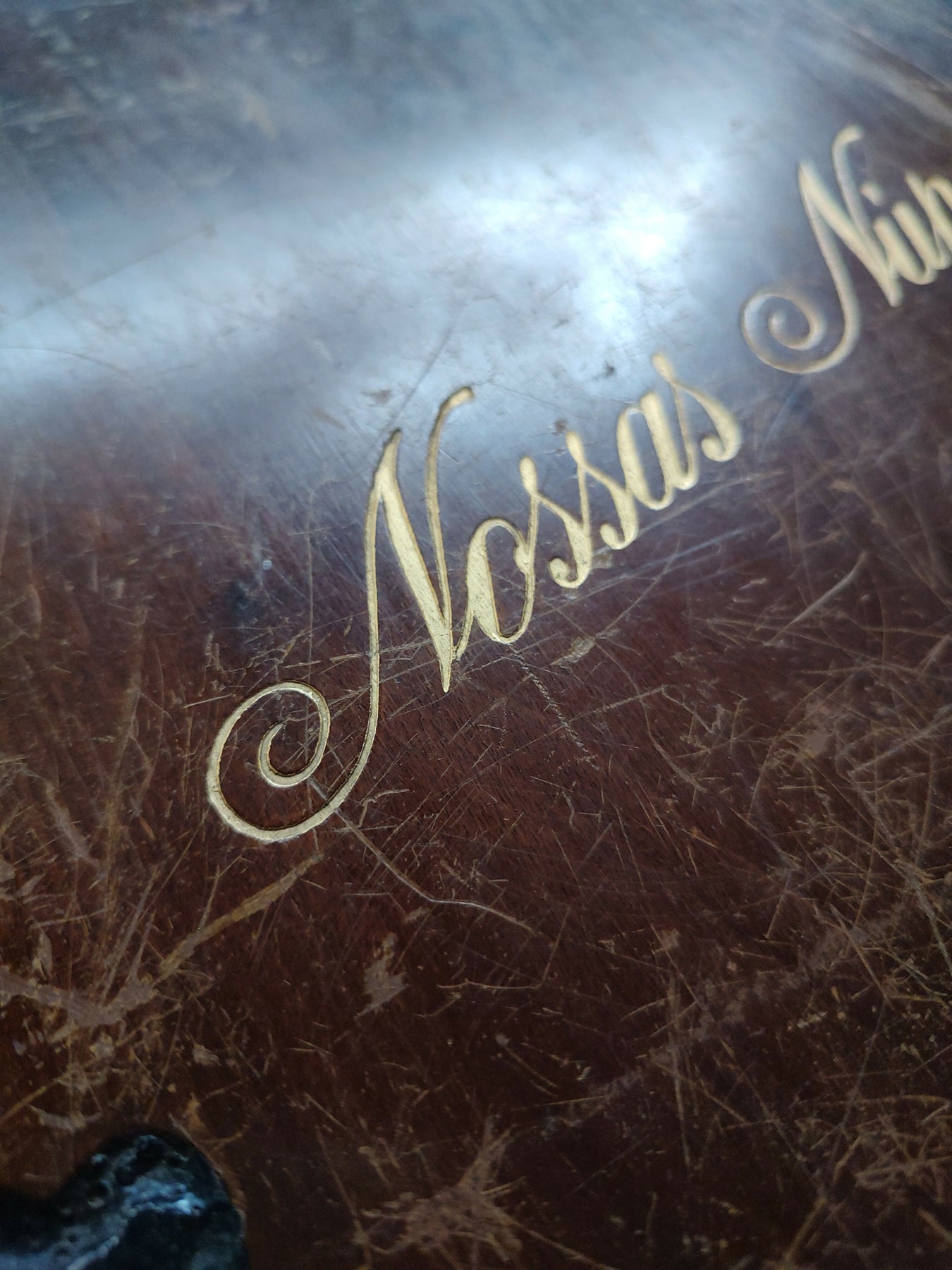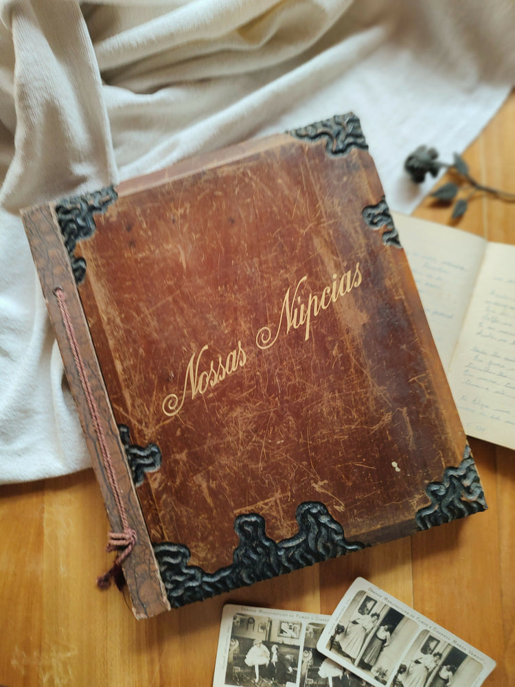 Antigo álbum de fotos "Nossas Núpcias" com capa em madeira (39cm x 33cm)