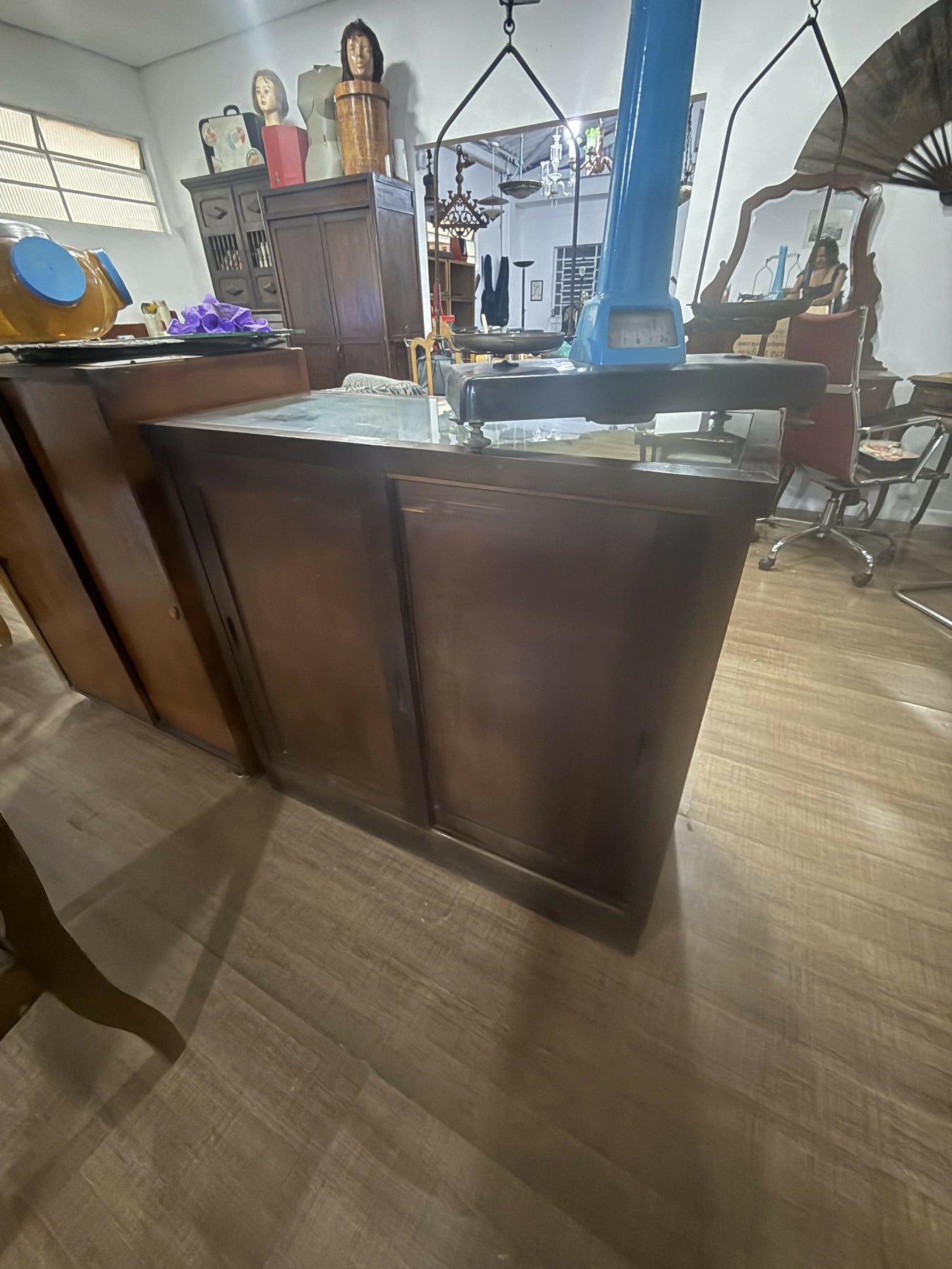 Apresenta desenho funcional e proporções clássicas do mobiliário comercial farmacêutico, com tampo superior amplo, adequado ao uso de balanças mecânicas e instrumentos de precisão. A vitrine frontal envidraçada permite visualização integral do interior, característica típica das farmácias históricas.