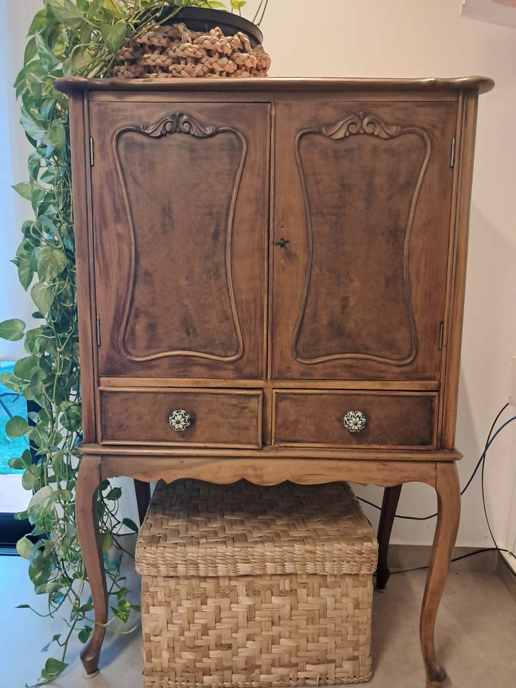 ​Detalhes: Possui duas portas superiores com entalhes ornamentais e duas gavetas inferiores com puxadores de cerâmica decorada.