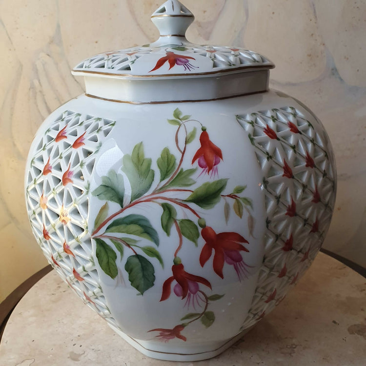 Grande potiche bojudo em porcelana vitrificada pintado à mão, alternando partes lisas e vazadas, em tons de verde e vermelho, com filetação dourada.