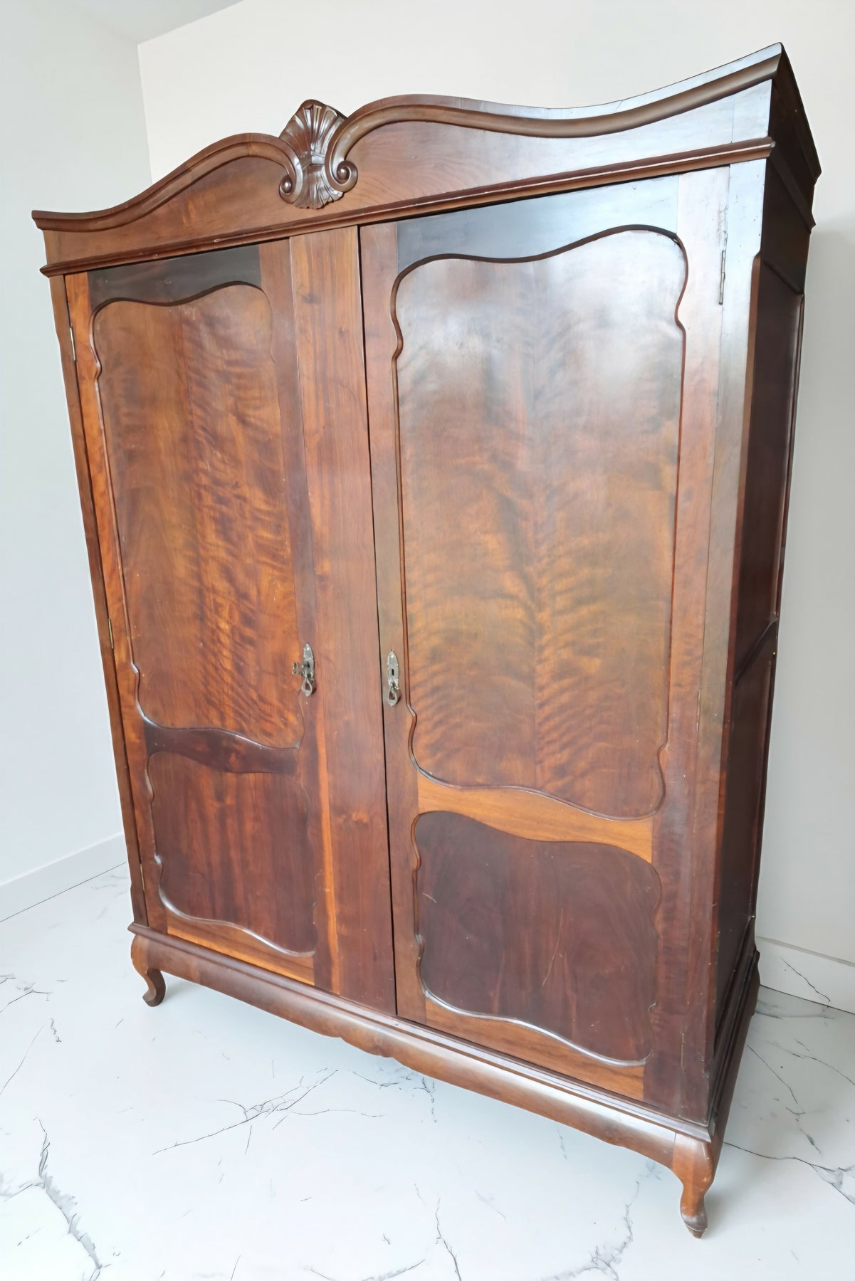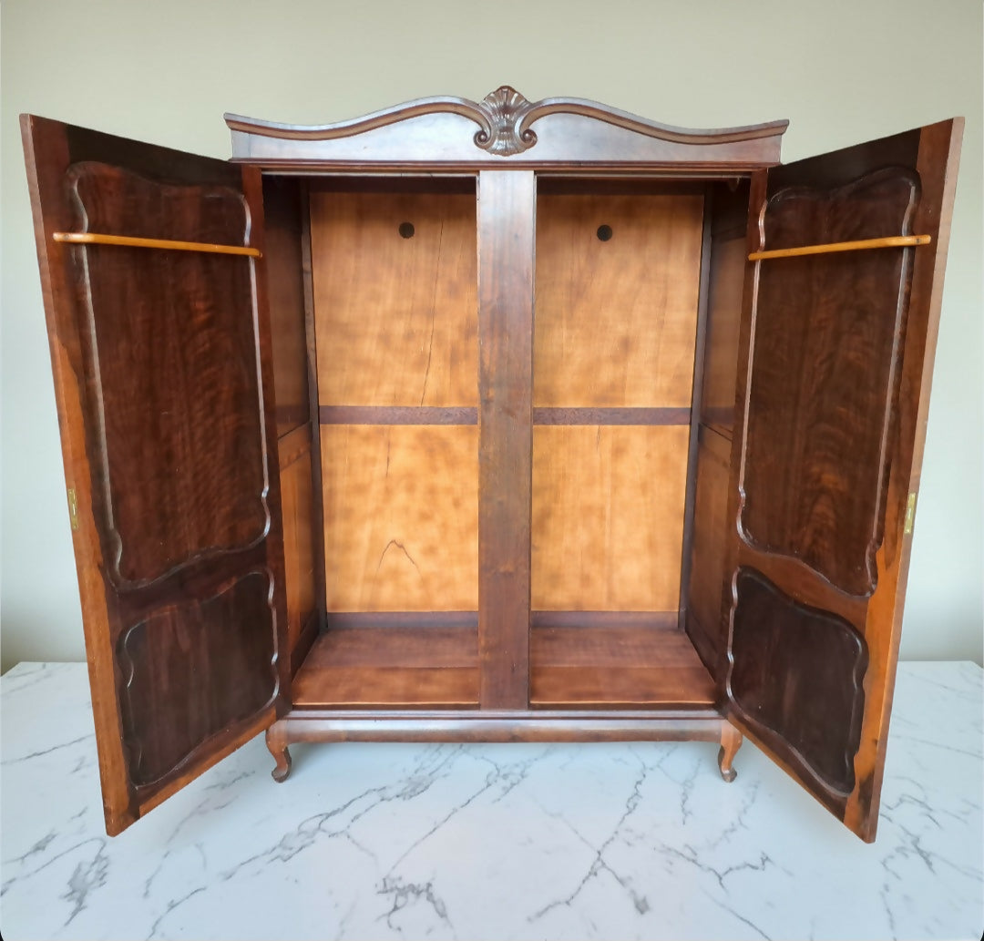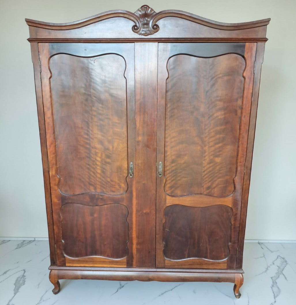 Clássico guarda-roupa antigo de duas portas, produzido em nobre madeira Imbuia, com veios naturais marcantes que revelam toda a beleza da madeira.