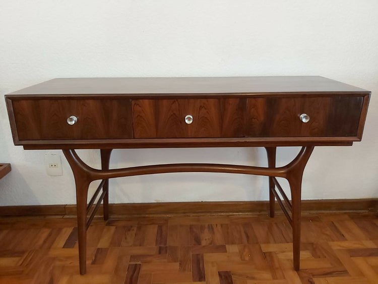 Incrível aparador em jacarandá, anos 50. Pernas torneadas e onduladas, design típico da época. 3 gavetas.