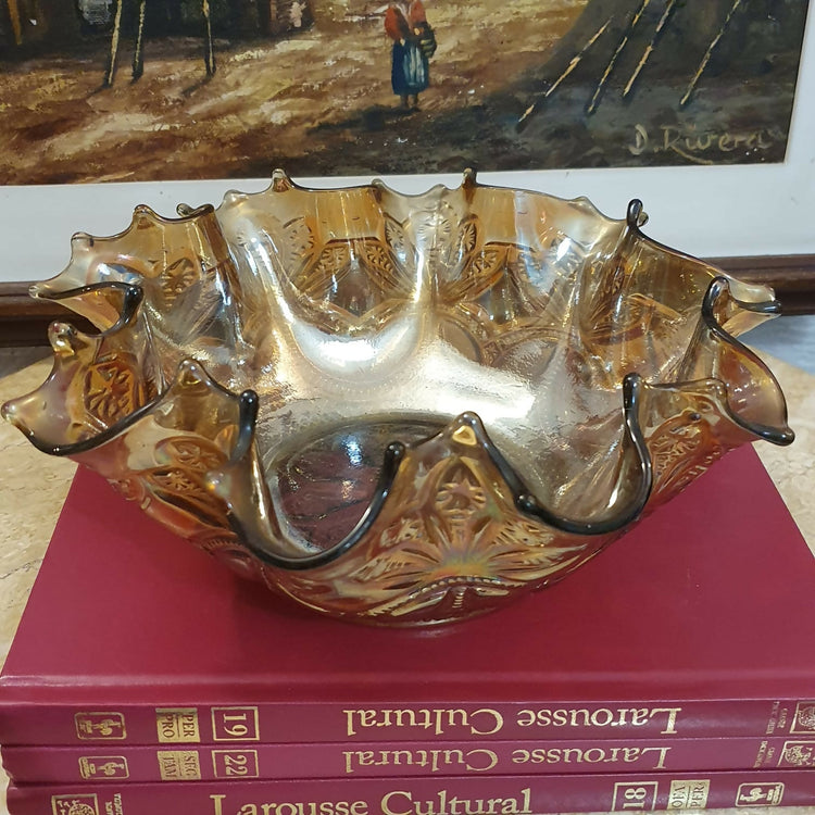 Incrível e antigo centro de mesa em Carnival Glass com maravilhosa ornamentação.