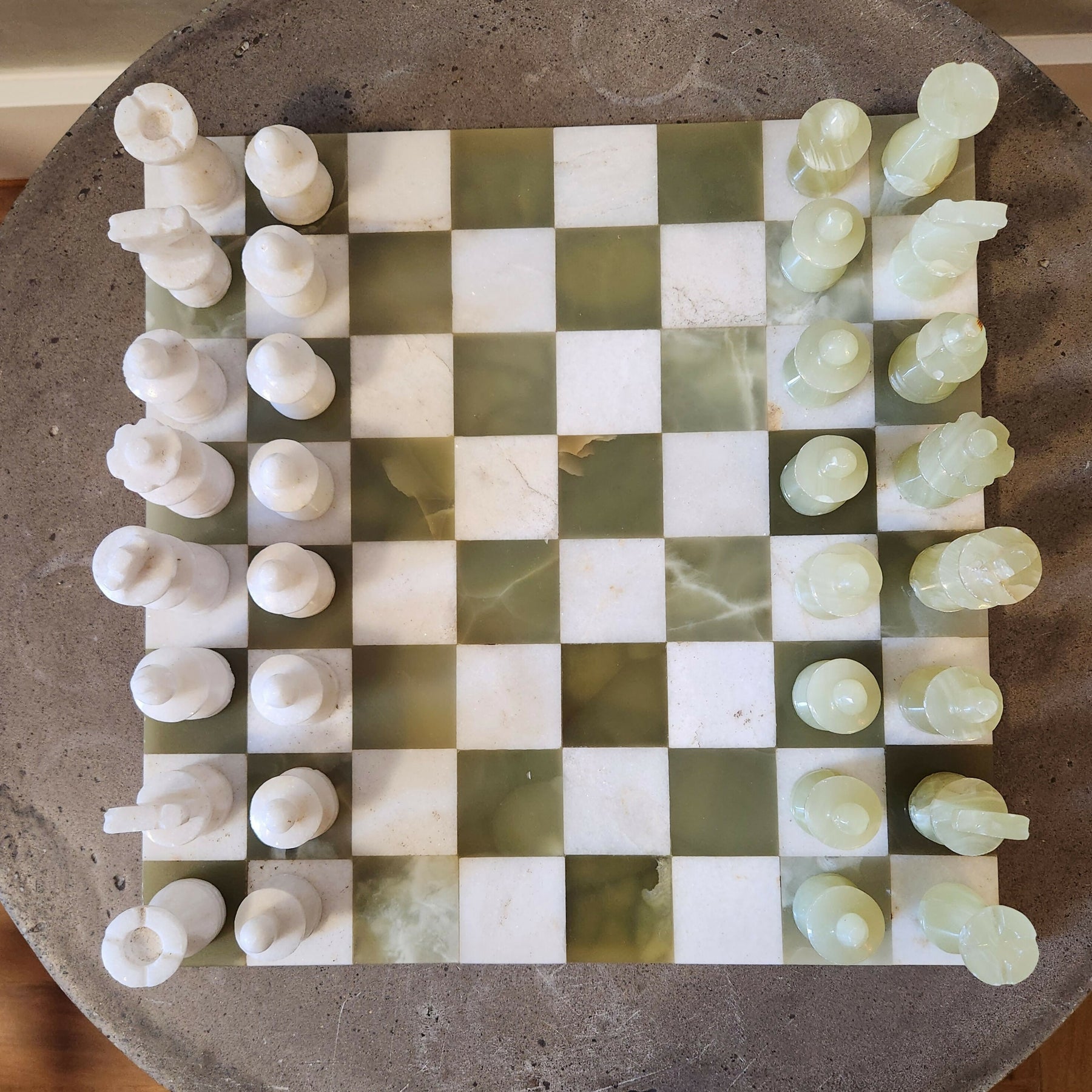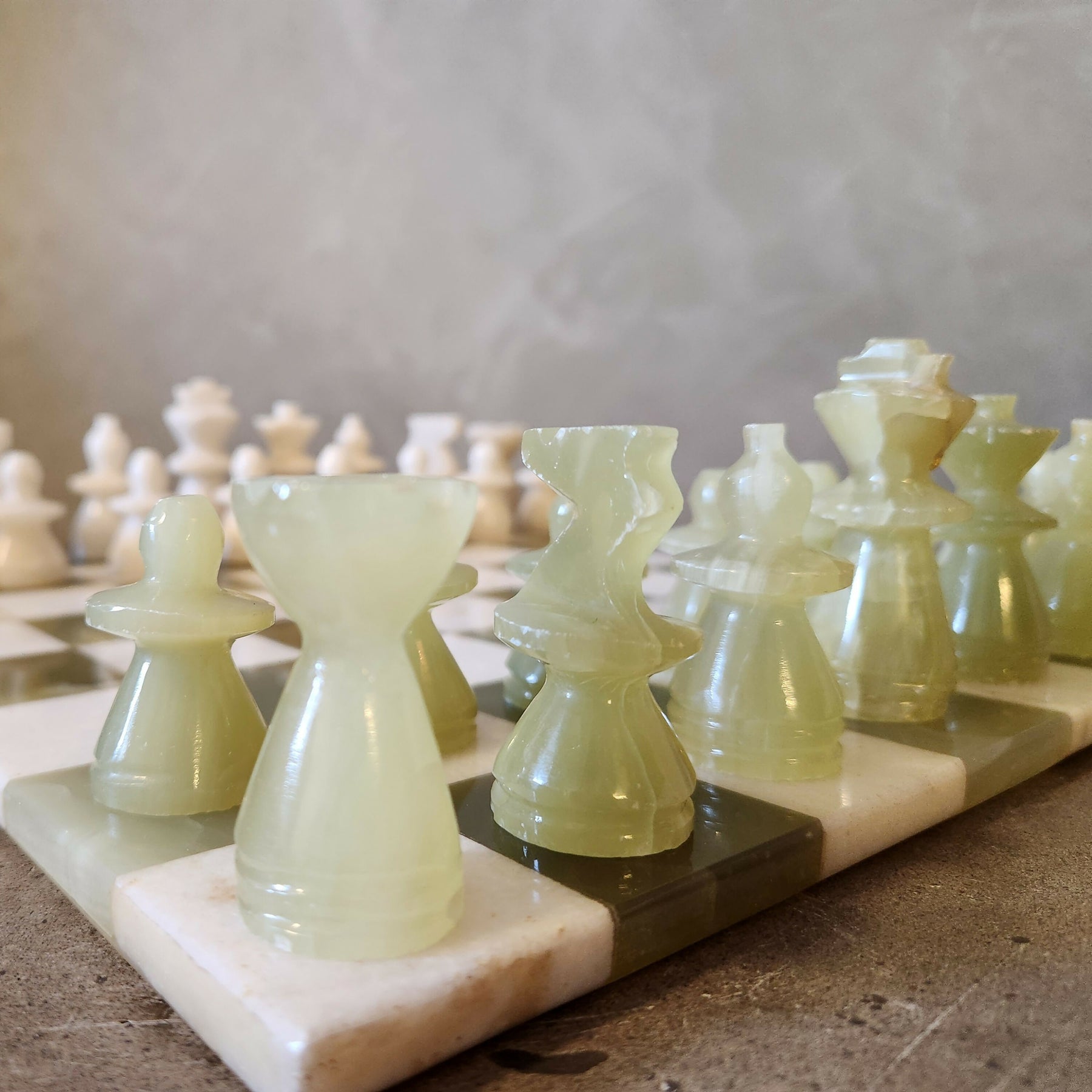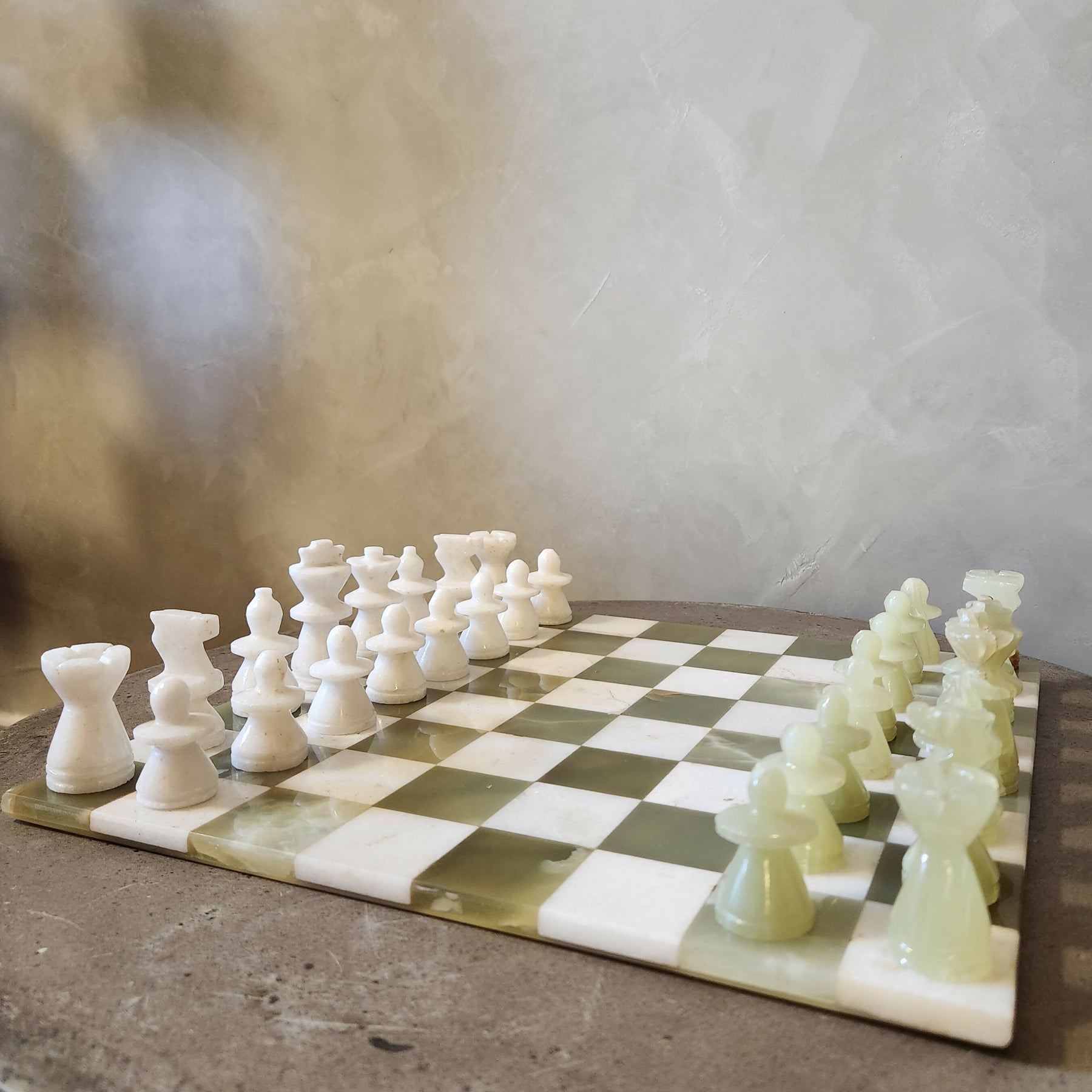 Jogo de xadrez completo em mármore ônix branco e verde claro.