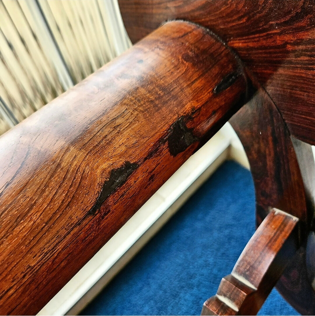 A palhinha original foi substituída há muito tempo por palhinha sintética, que permanece em perfeito estado. Possui um pequeno restauro antigo em.um dos braços, provavelmente ocasionado por um nó natural da própria madeira. Detalhes podem ser observados nas fotos.