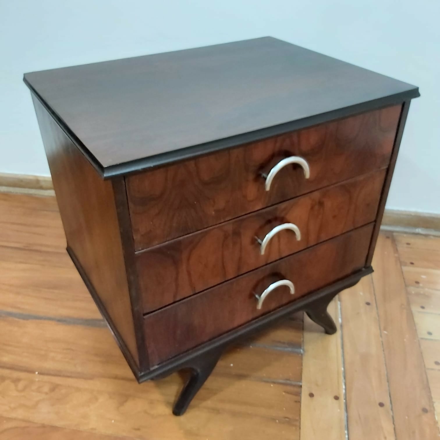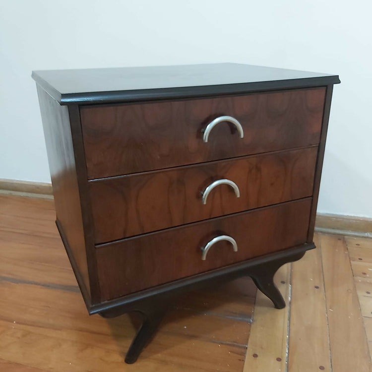 Par de mesas de cabeceira em jacarandá, anos 50 com 3 gavetas. Pés torneados e arqueados, típicos da época.